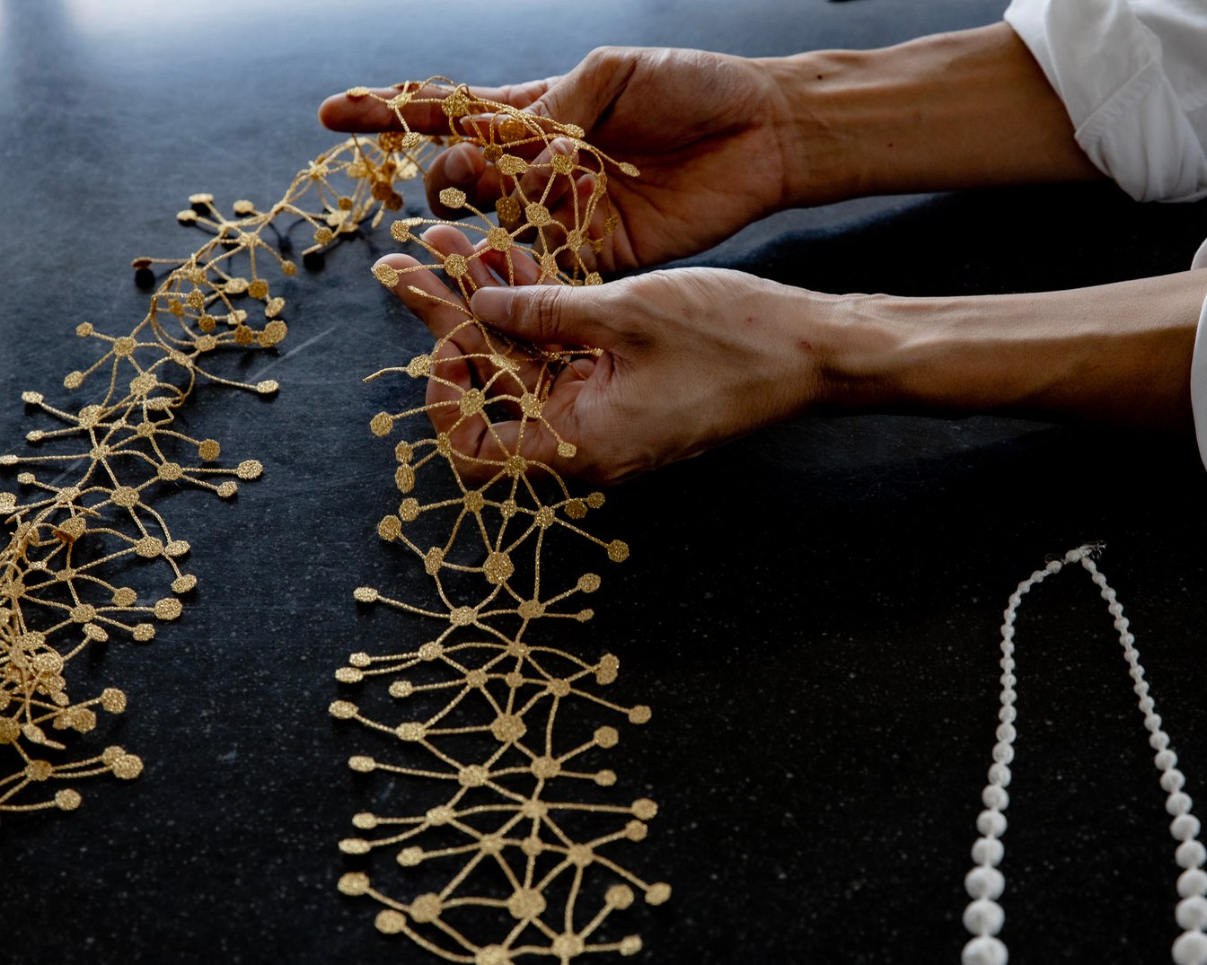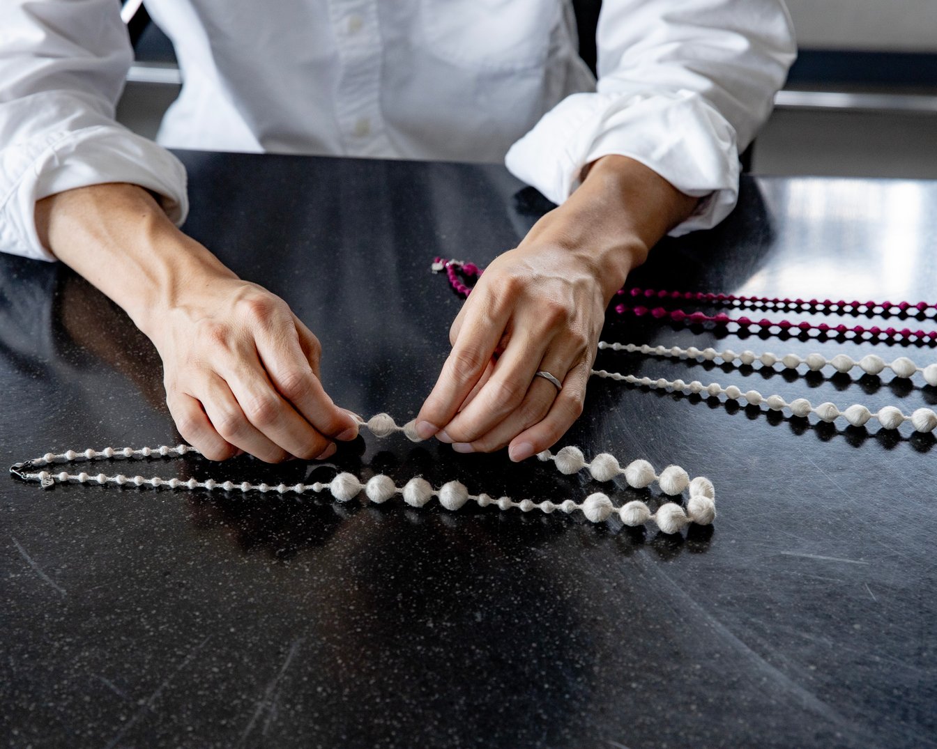 自分たちの意思でものづくりができるということに関してやりがいを感じると共に、全てを決めていかなければならないという大変さも知りました。大きくいくつかのステップがあったと思うんですが、最初の作品であるDNAネックレスを作り終えた時にお客様から「良いものだけど毎日は着けられないね」という言葉をもらったのをとても覚えています。弊社は元々メーカーであり、刺繍技術を生かしたものづくりが大前提でしたが、消費者はプロダクトを身に着けたときの喜びが欲しいわけであって、正直刺繍技術は二の次なんだなと。でも僕らとしては刺繍へのイメージというのも含めて新しい価値を生み出していきたい。そういう風に考えた時に「シルク素材を使ったパールネックレスのような毎日つけられるアクセサリーを作りたい」というアイデアが生まれました。ただ、刺繍で球体を作ることは絶対に不可能だと思っていたんです。でも、これまでにクライアントと乗り越えてきた壁や経験のおかげで少しずつ形にしていくことができました。当時の自分は言語化できなかった気持ちを今の自分がまとめるならば「『今はできない、だけど作りたい』という気持ちを大切にすることが諦めない理由で、その気持ちこそが開発することの意義」なのかな、と思っています。