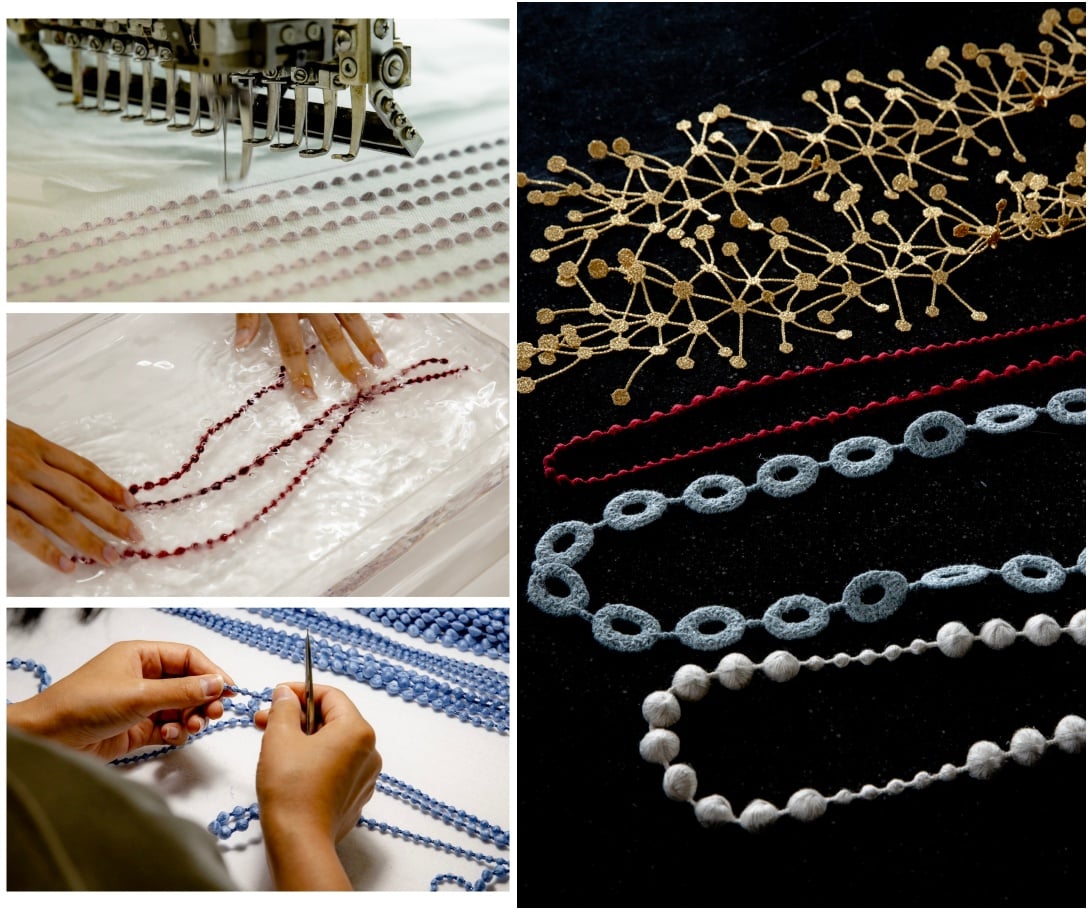 簡単に言ってしまえば「生地には施さない刺繍」で、レースの付属パーツと言うこともできます。国内では縫製工場からクライアントの生地を預かり、そこに刺繍を施して戻す、というのが一般的な製作過程。しかしそれが海を越える取引の場合、コストや納期を考えると現実的ではありません。なので、生地には施さない状態で刺繍だけを輸出し、あとは納品先で生地への縫い付け作業を行ってもらう、という仕組みです。