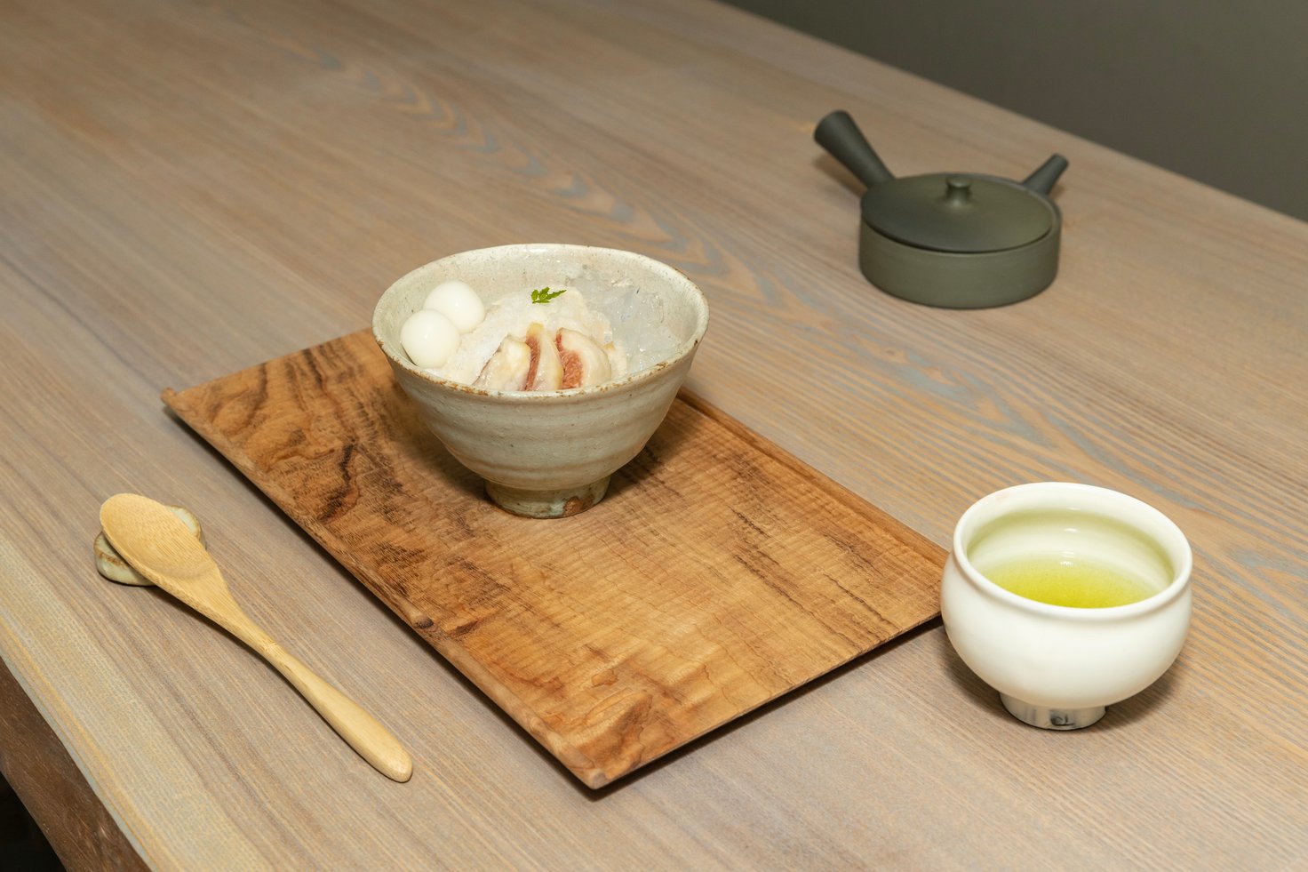 渡邉さんは「季節の水菓子 氷汁粉とお茶」のセットを堪能。お茶は京都府和束町産の「さえみどり」を注文。鮮やかな冴えた緑色と濃厚な旨味が特徴のお茶で、暑さも吹き飛ぶような澄んだ後味です。