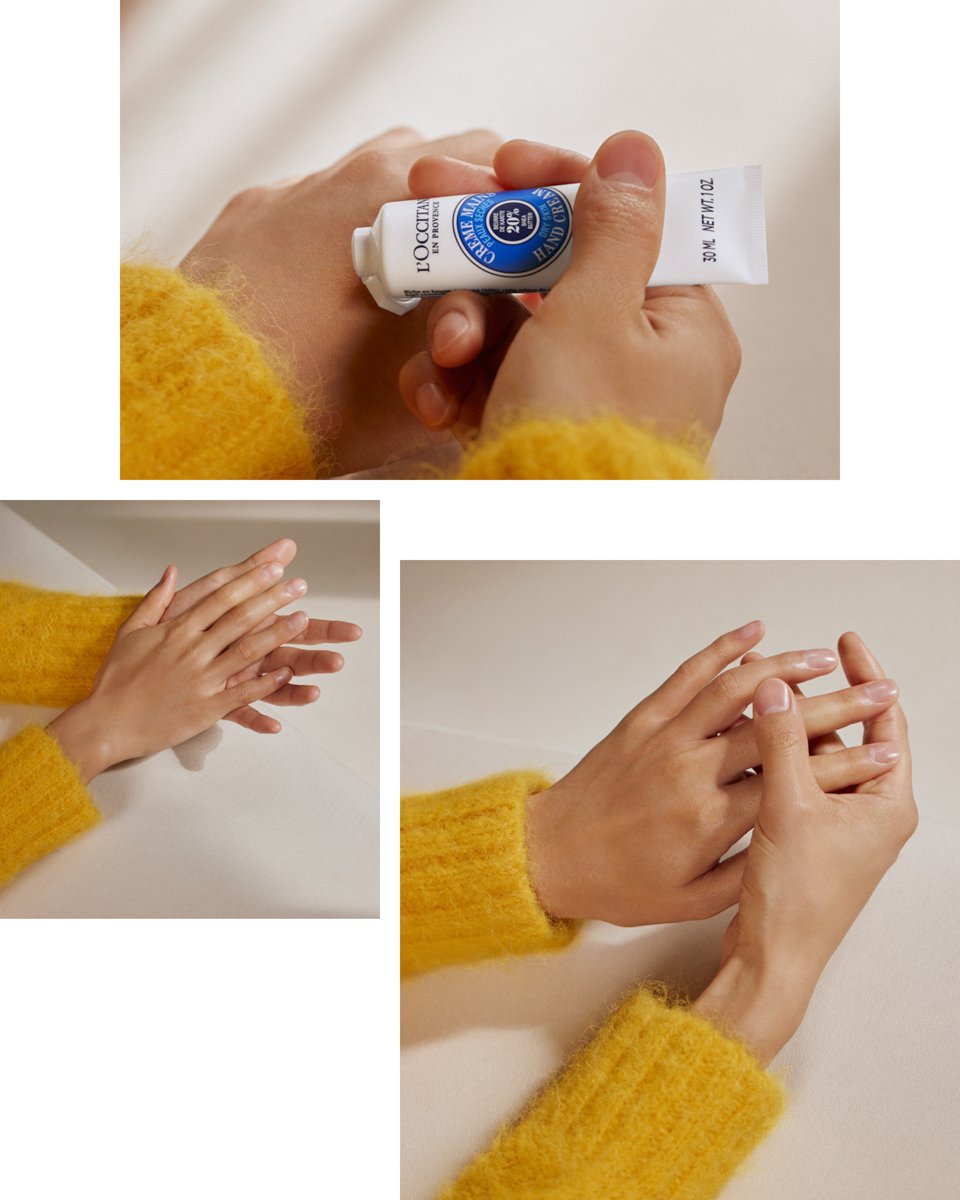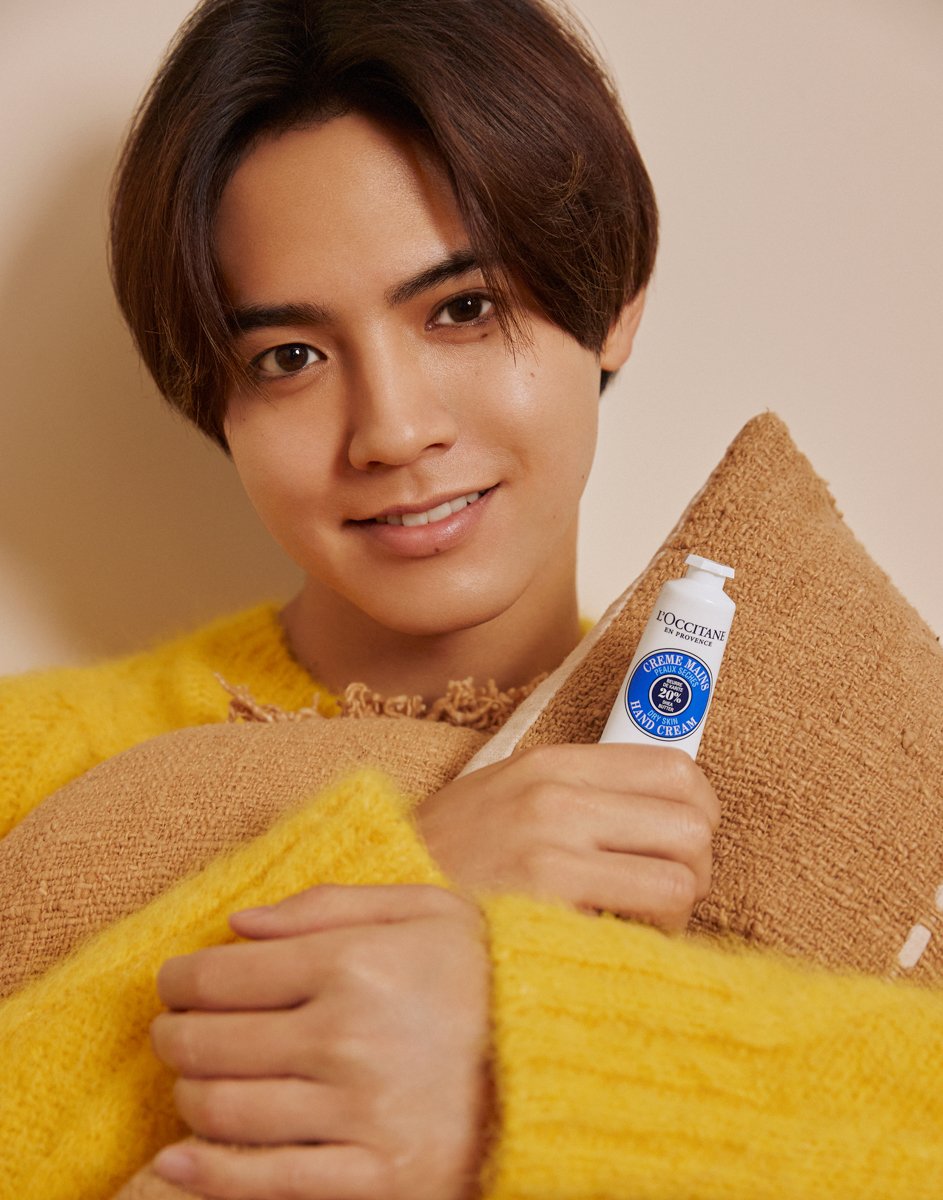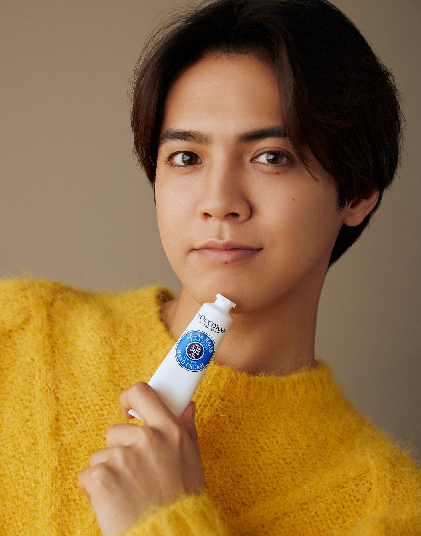 「ロクシタンの製品は昔母が使っていたりして、ずっと前から知っていました。デビューさせていただいてから、ファンの方からプレゼントでハンドクリームをいただくこともありました。だから、いろんな人が使えるし、ちょっとした感謝や想いを伝えるギフトにもぴったりなイメージをなんとなく持っていて。シア ハンドクリームはその中でもブランドを代表するアイテムだと聞いて、それを進化、変化させるのは大きな決断だったのではないかと想像しました。未来への思いから、アクションを起こす姿勢は、見習いたいなと思いましたね」。