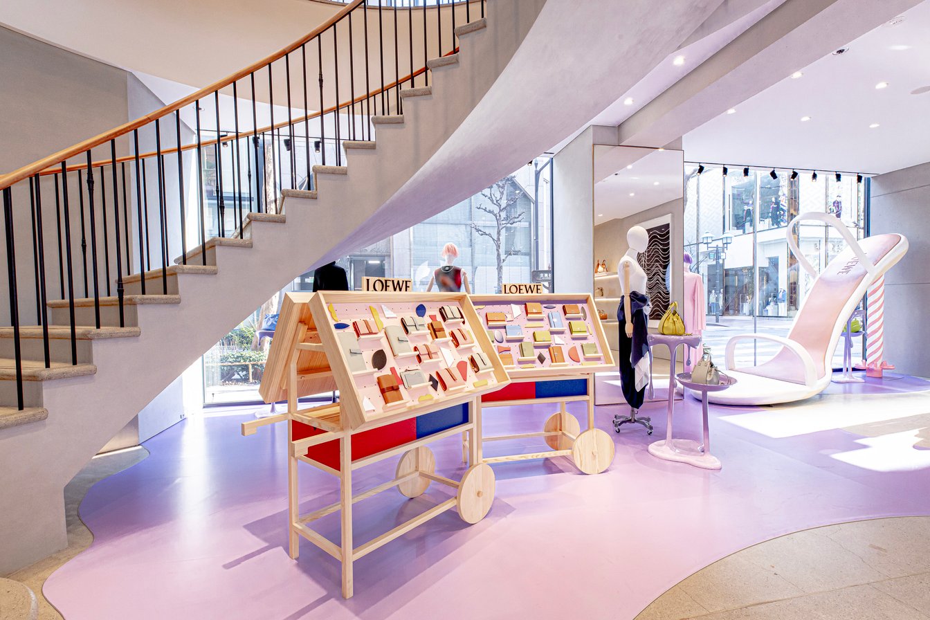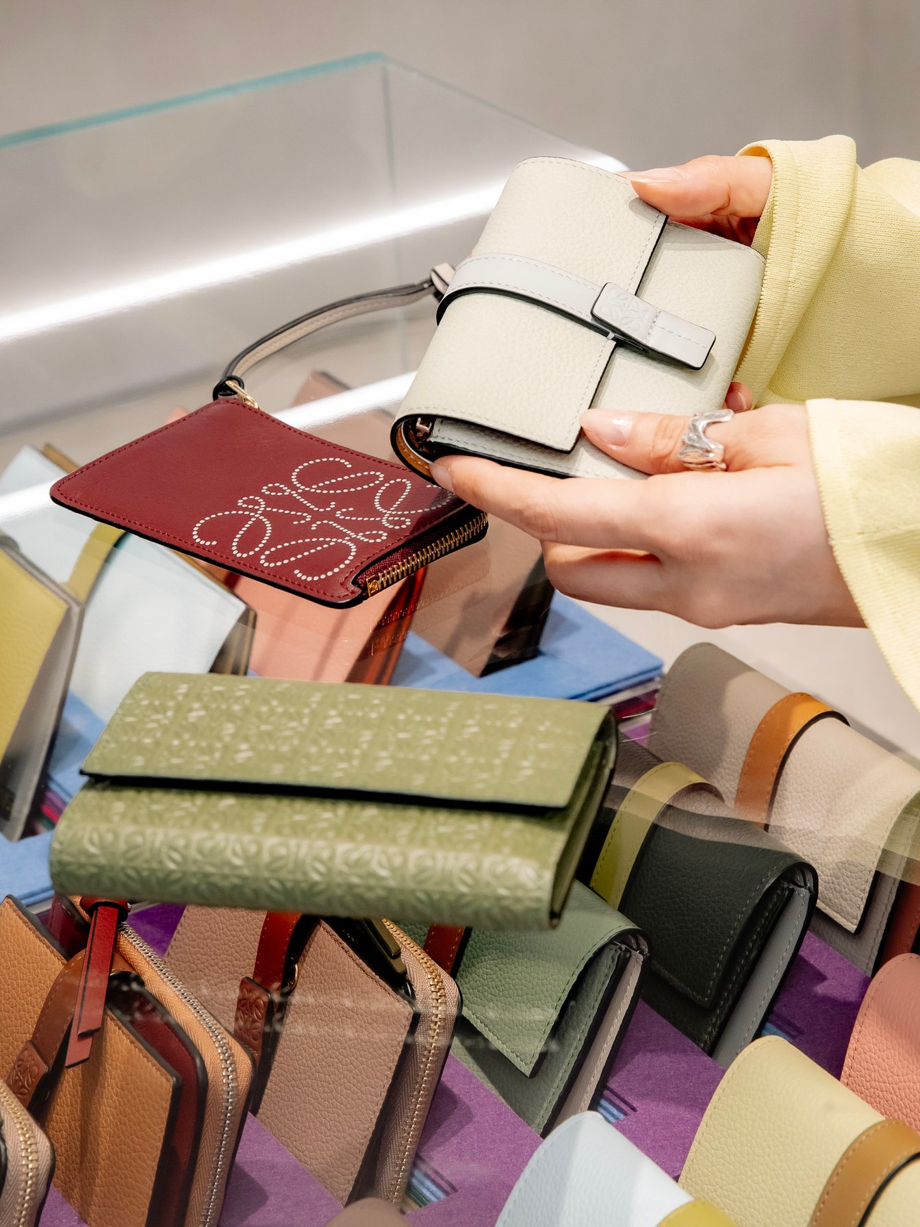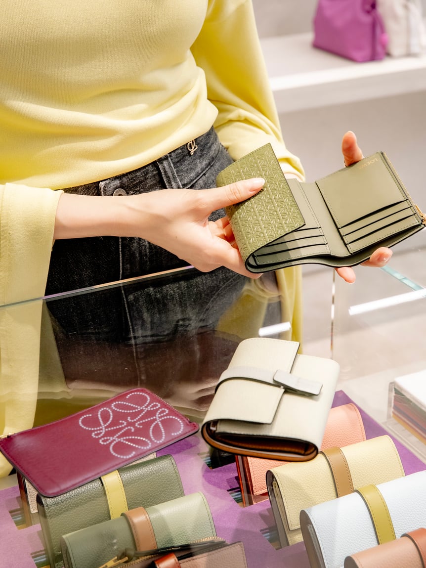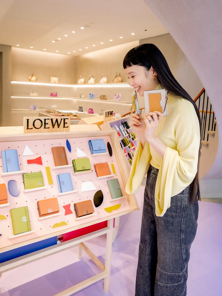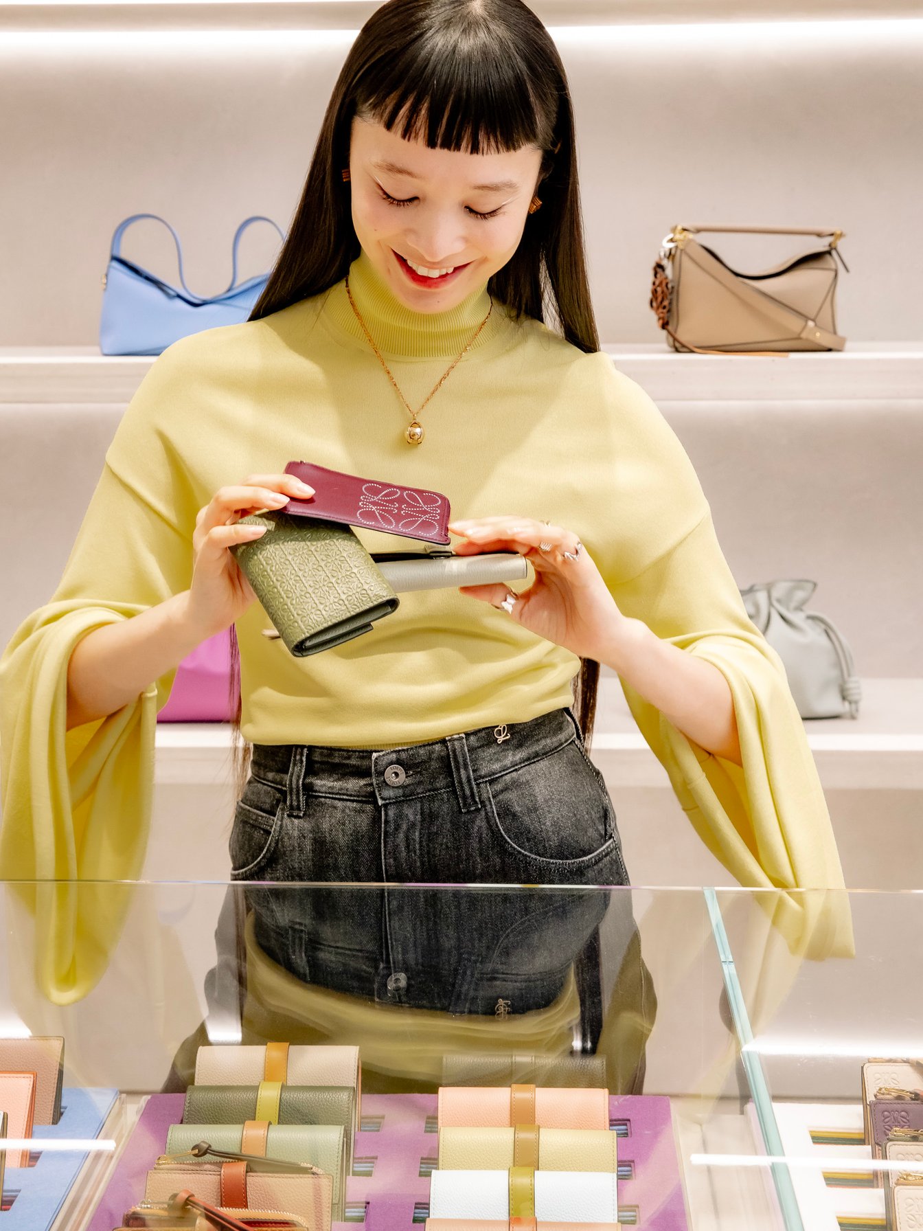 CASA LOEWE Tokyoに訪れた萬波ユカさんは、ポップなトローリーの前で好みのウォレットをじっくりとセレクト。「あれもこれも可愛くて、選びきれません(笑)」