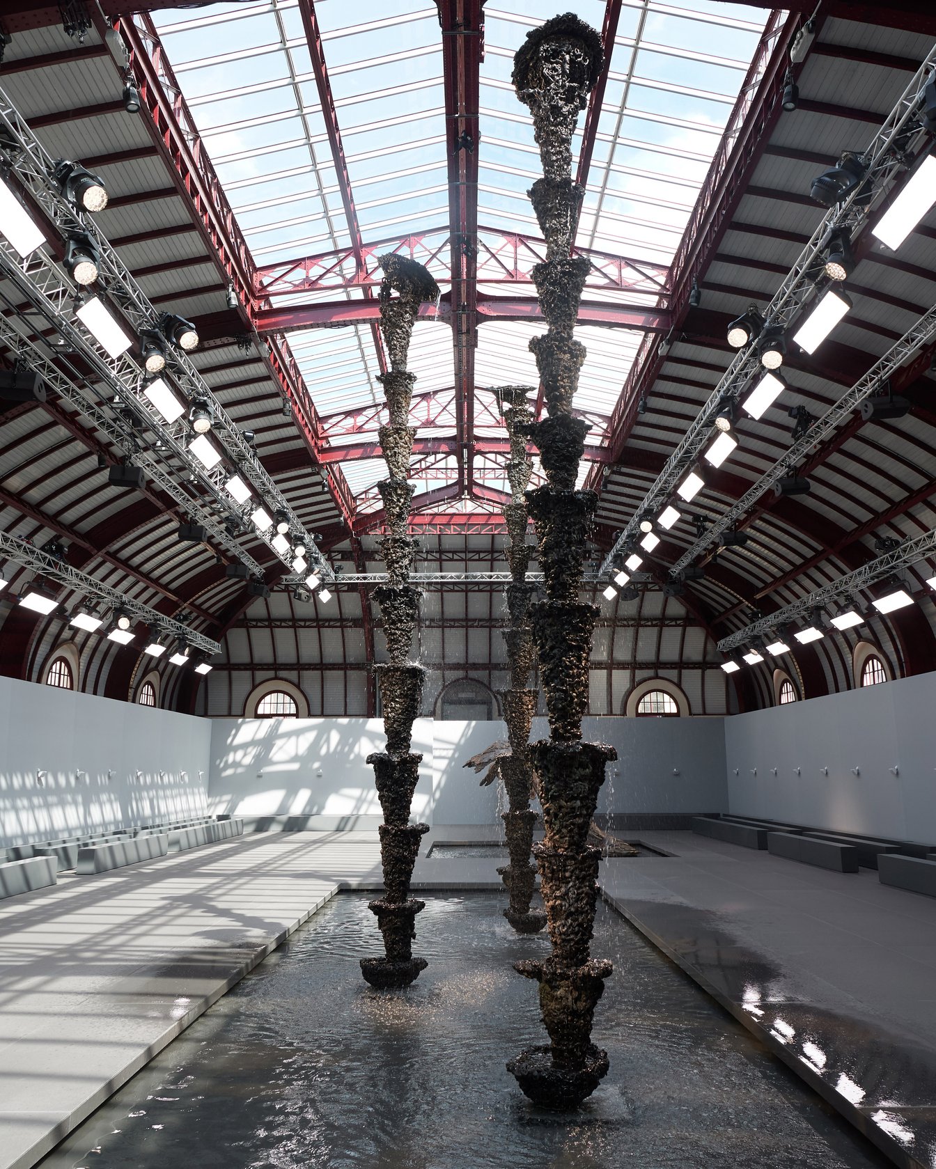 自然光が降り注ぐ空間に噴水が並び、ランウェイの一部はしぶきで濡れている。ショーはアーティストの独白と共にスタートした。「私はスキューバダイビングを学んでいるとき、水についての理解を深めた。子宮に戻っていくかのように感じた。水とそのフォルムは、私にとってつねにエキサイティングなものだった。だから噴水を作りたいと長年思い続けてきた」。そんなリンダのステイトメントを反映するかのように、水を思わせるルックが次々と登場した。
