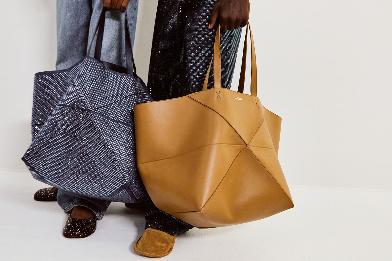 パンツは大胆なハイライズでレッグの長さを強調し、引きずるほど大きな白のローブも登場。アクセサリーと一体化したウェアや、スエードのペブル バケットバッグやパズルトートなどのオーバーサイズのバッグも意外性のあるスタイリングを完成させていた。