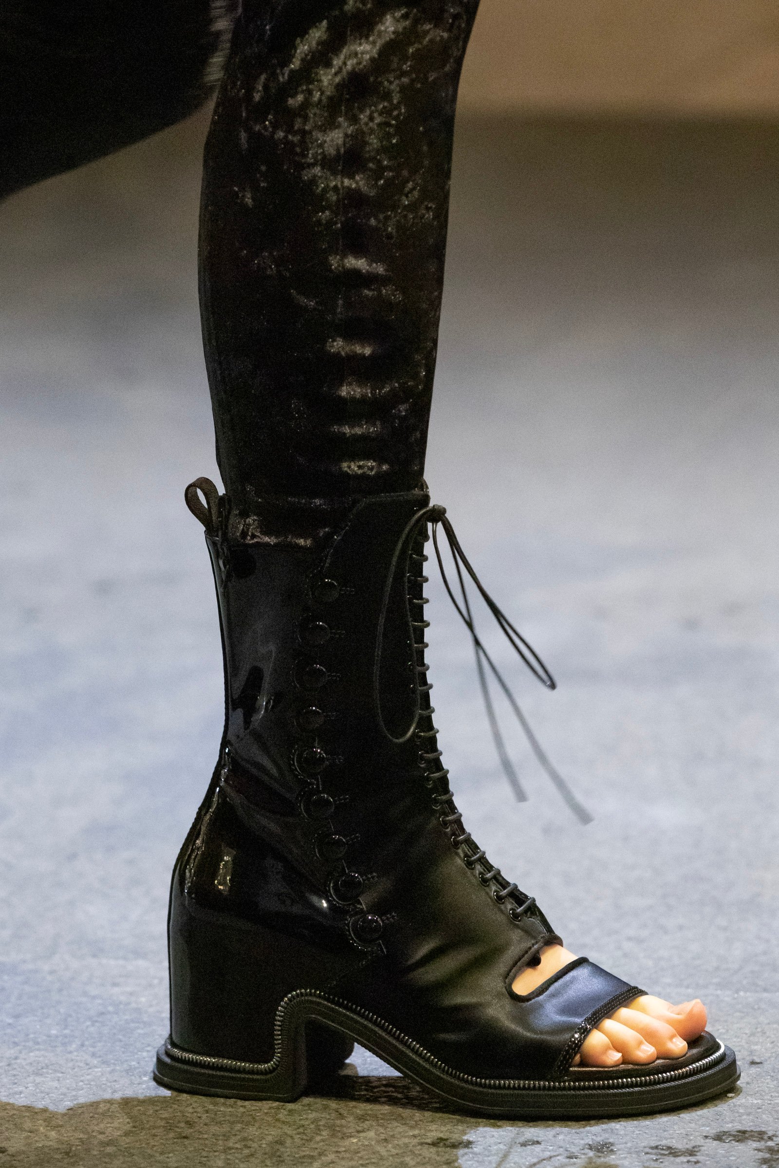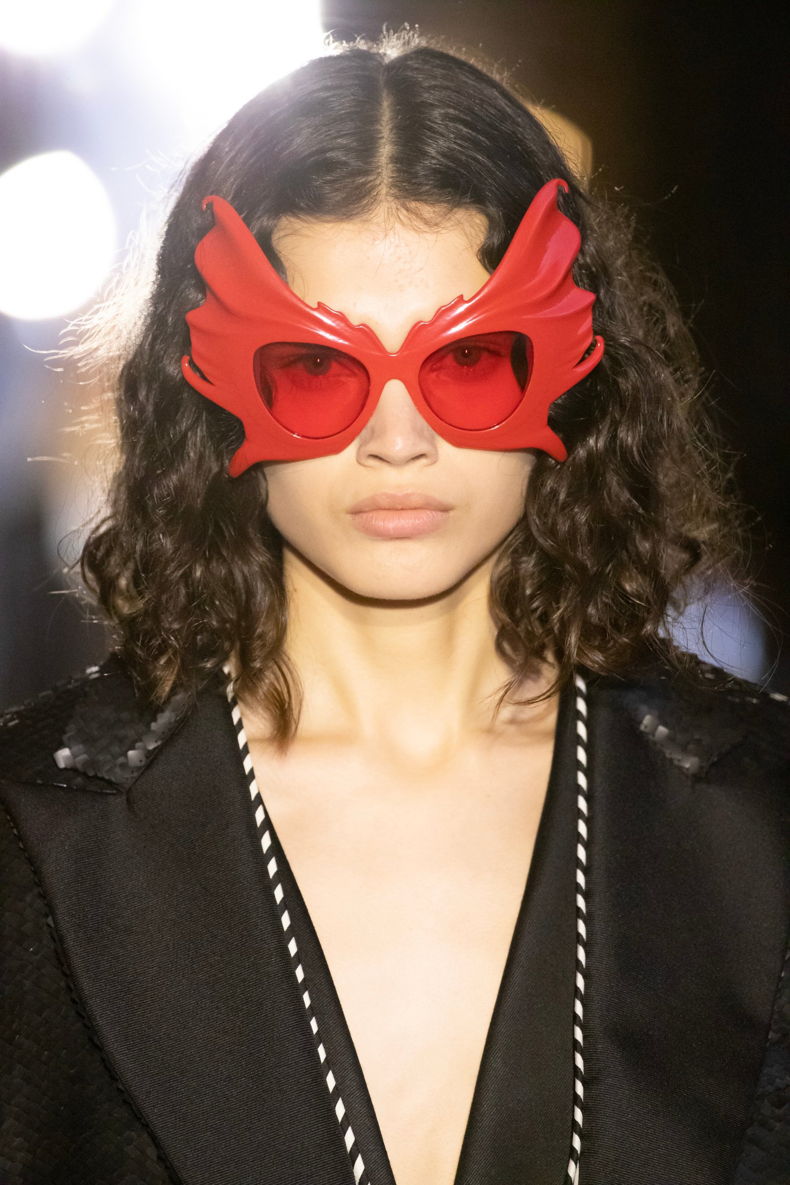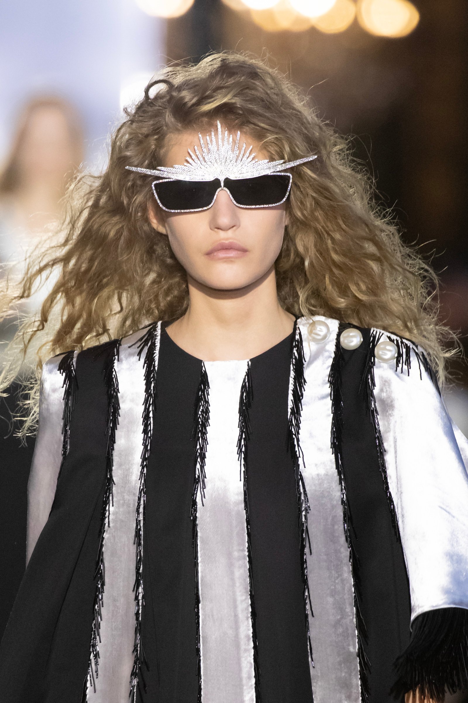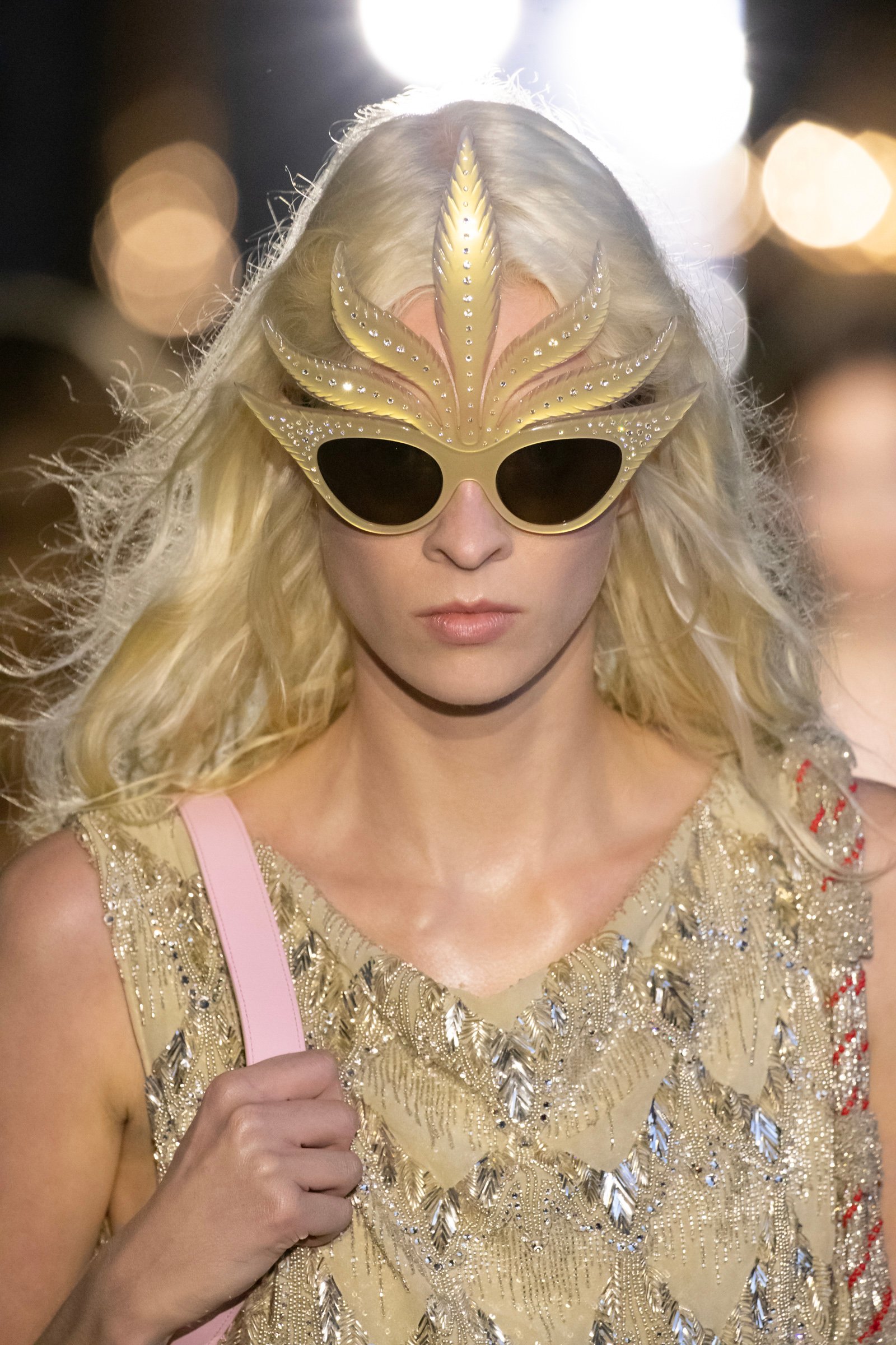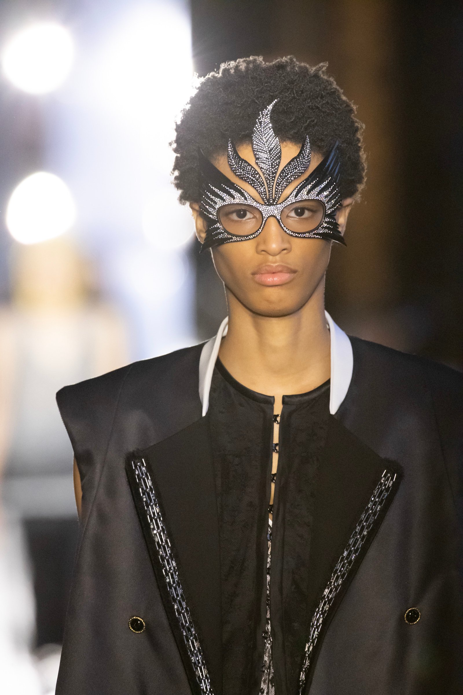 アクセサリーでは、テーマの仮面舞踏会を連想させるマスクのようなデザインのアイウェアや、クリスタルが輝くヘッドピースが登場。シューズはオープントゥのブーツサンダルがバリエーション豊かに提案された。