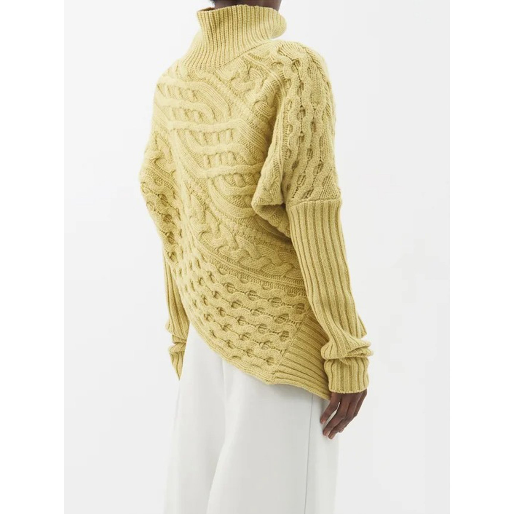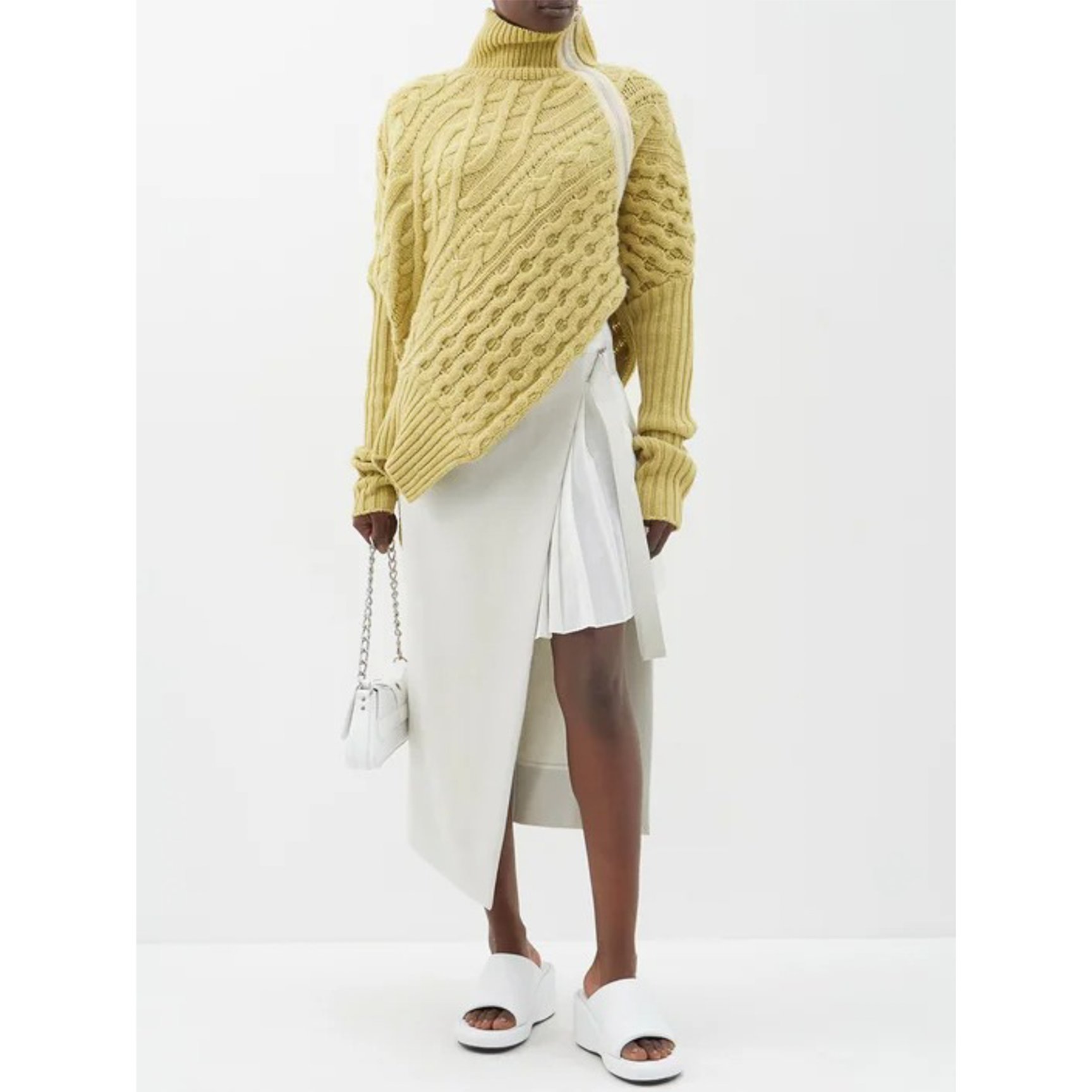 唯一無二な存在感を放つ「サカイ(sacai)」のアシンメトリーケーブルニット。大きなシルバートーンのファスナーを配したり、ボディと袖で異なる編み方だったりと、着こなすのが楽しい一着です。
