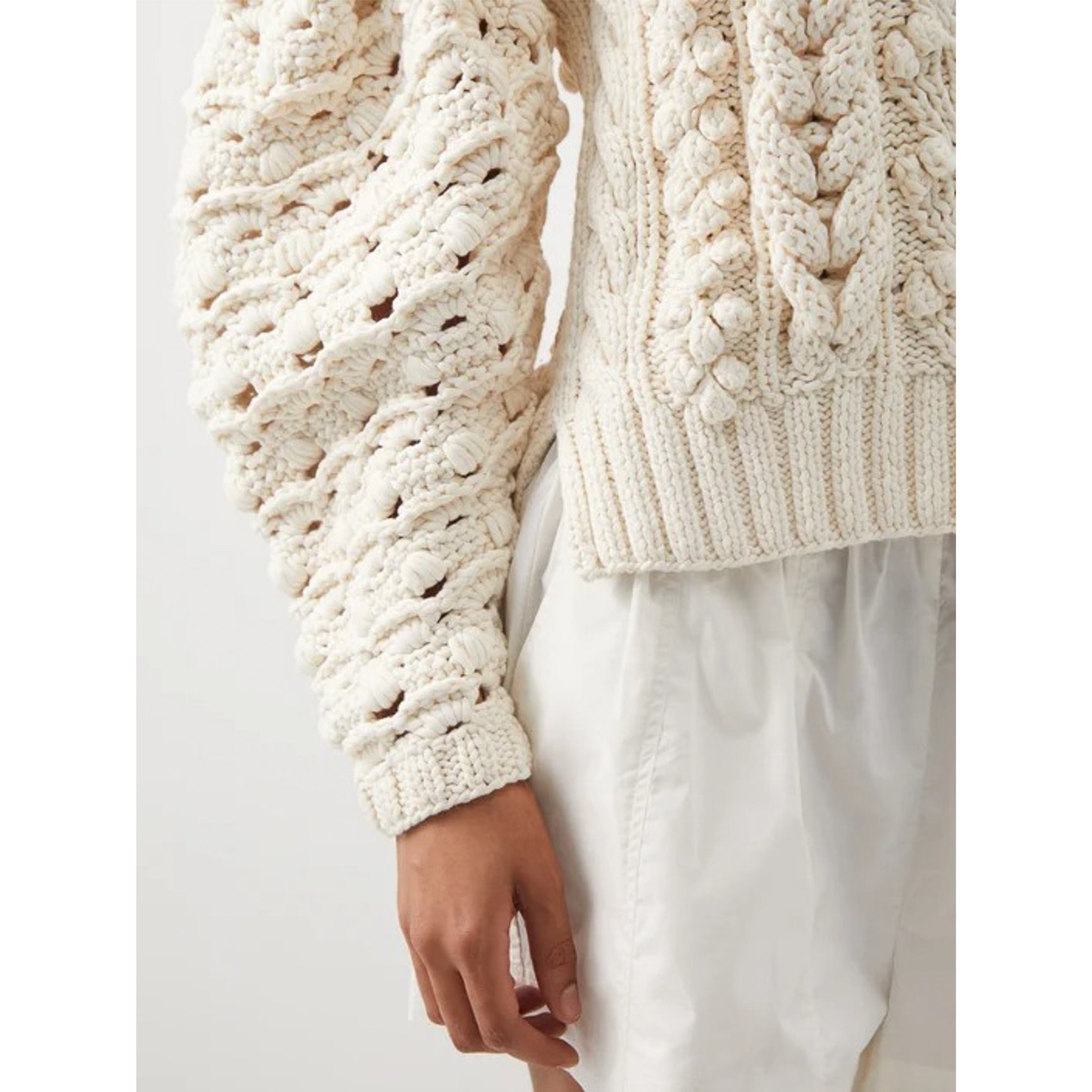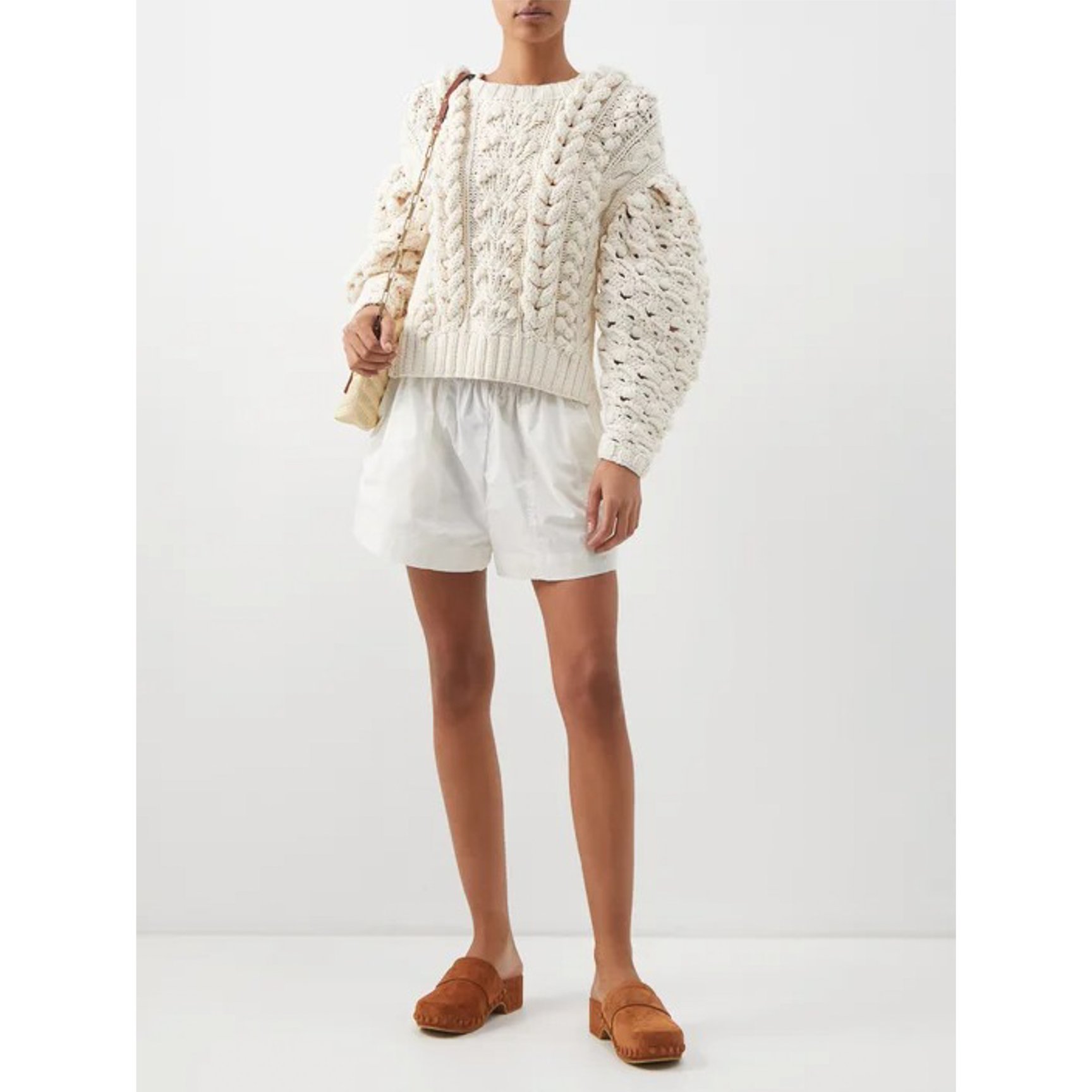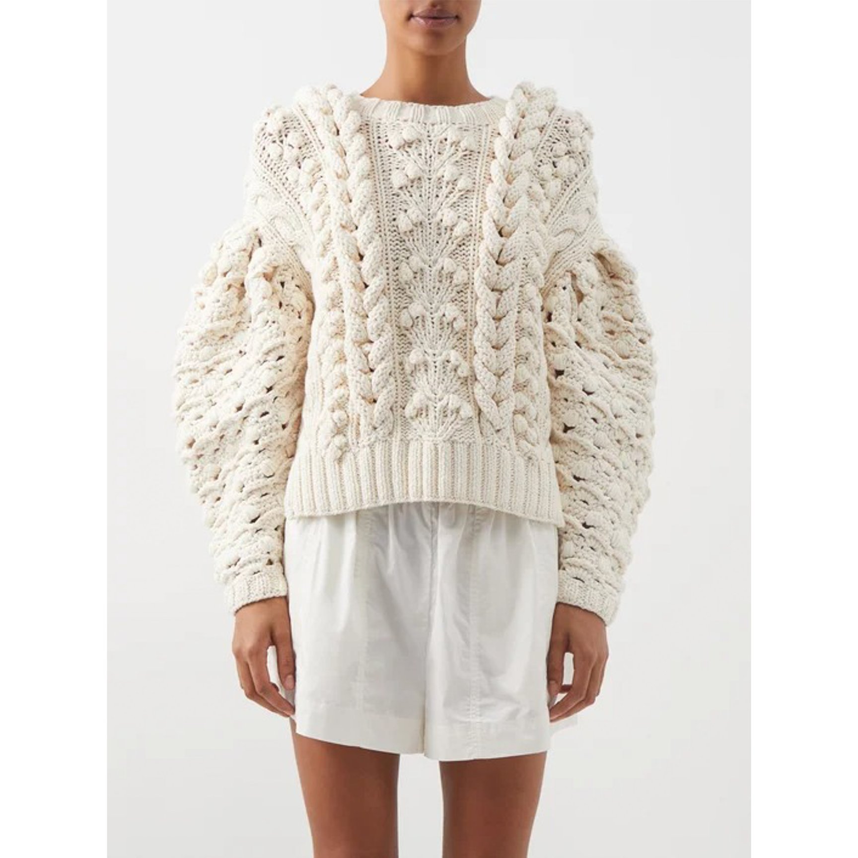 ドレープパフスリーブが女性らしいムードを演出してくれる「ウラ ジョンソン(ULLA JOHNSON)」のセーター。ざっくり感が可愛いケーブル&クロシェ編み。ボリュームがある分、ボトムスはコンパクトにするとバランス良くまとまります。