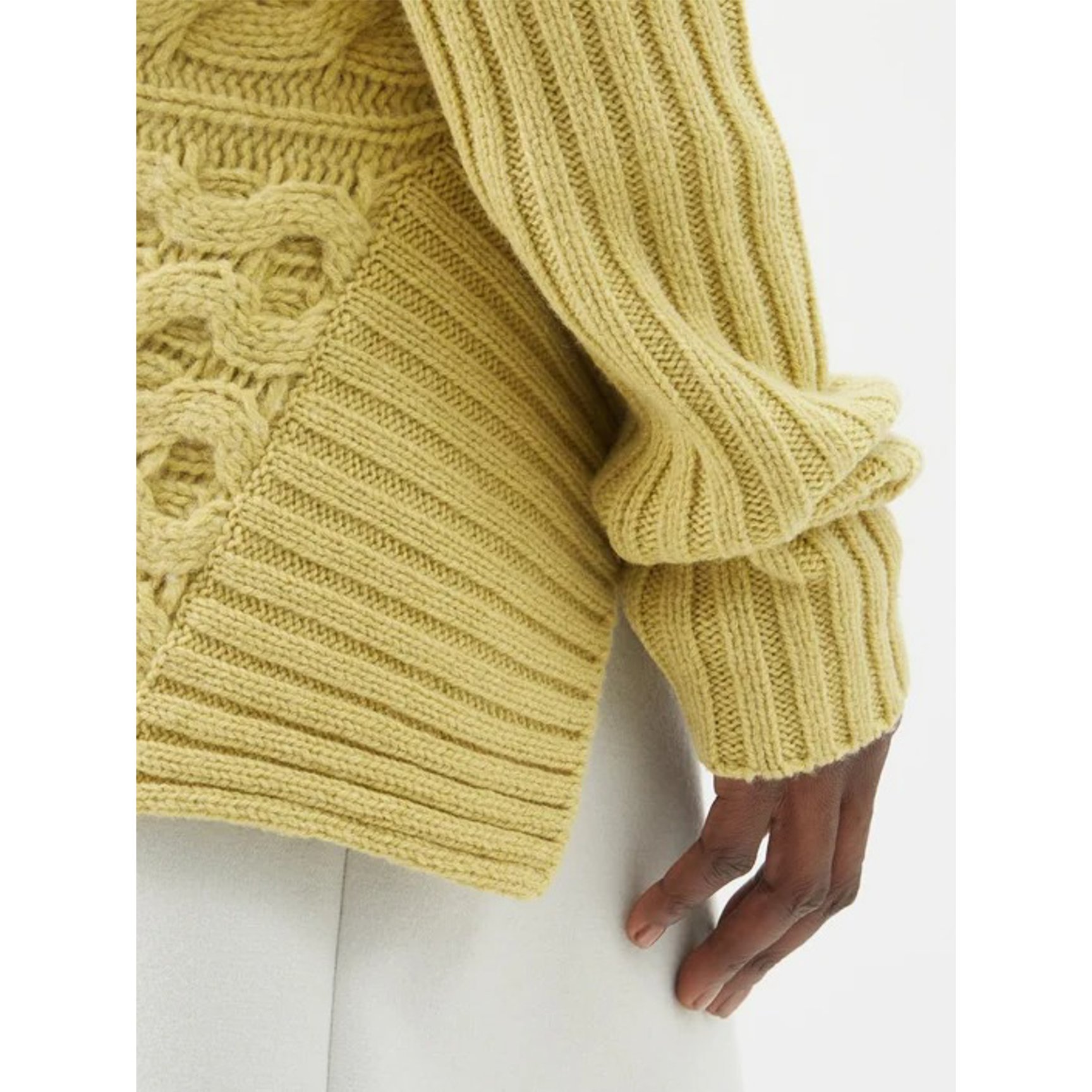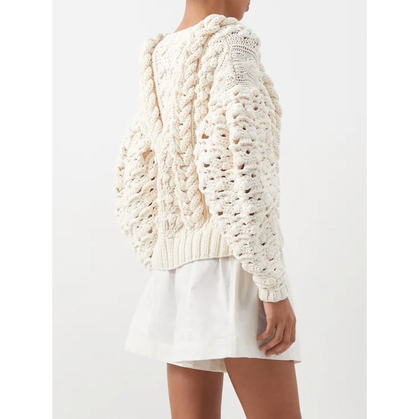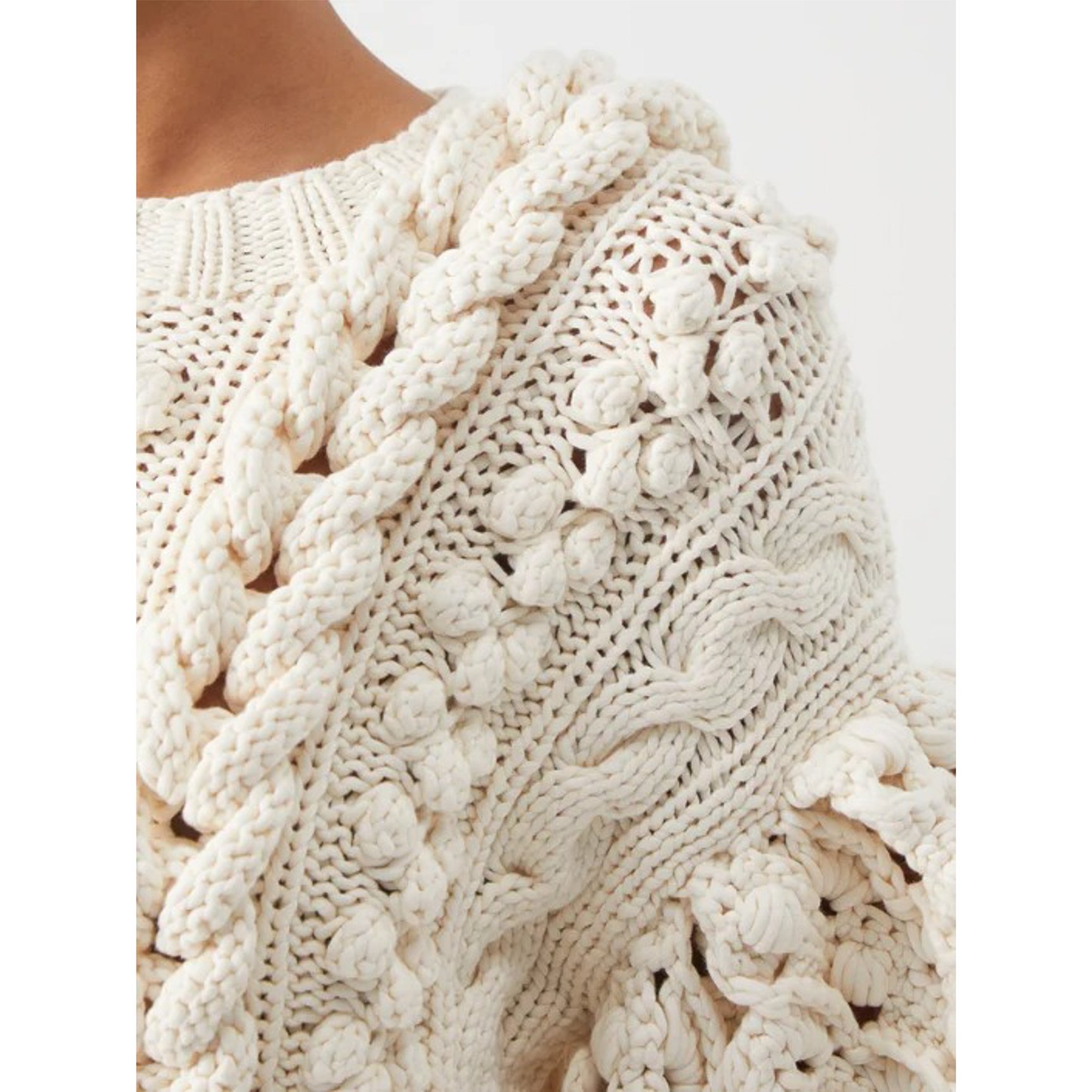ドレープパフスリーブが女性らしいムードを演出してくれる「ウラ ジョンソン(ULLA JOHNSON)」のセーター。ざっくり感が可愛いケーブル&クロシェ編み。ボリュームがある分、ボトムスはコンパクトにするとバランス良くまとまります。