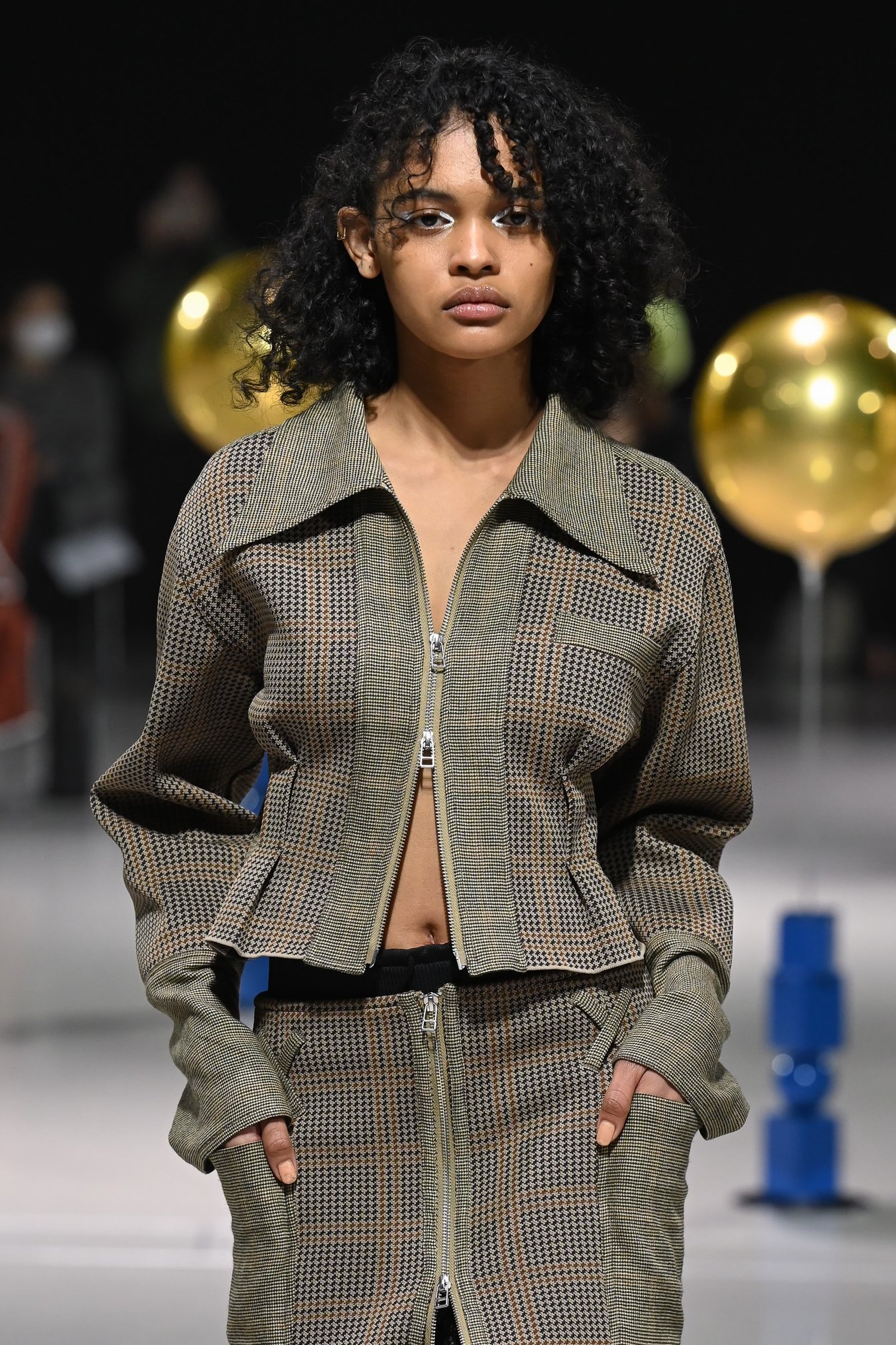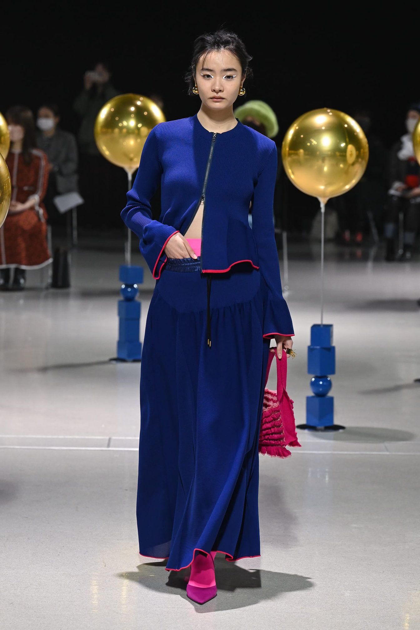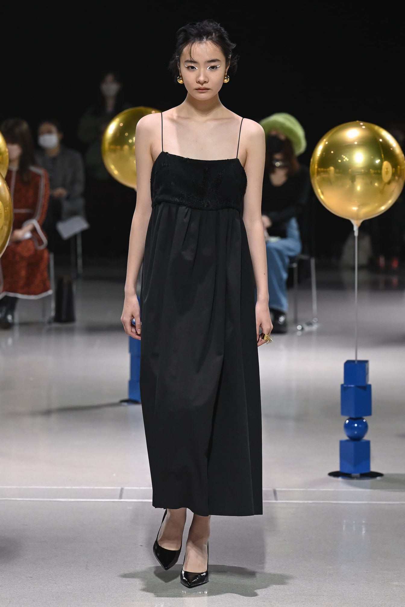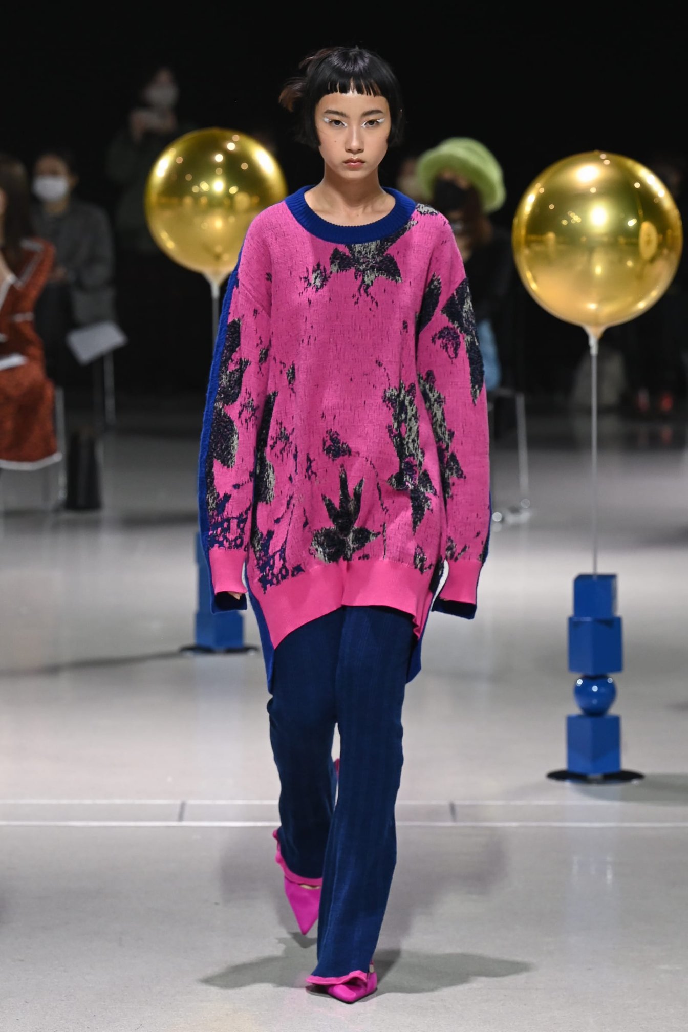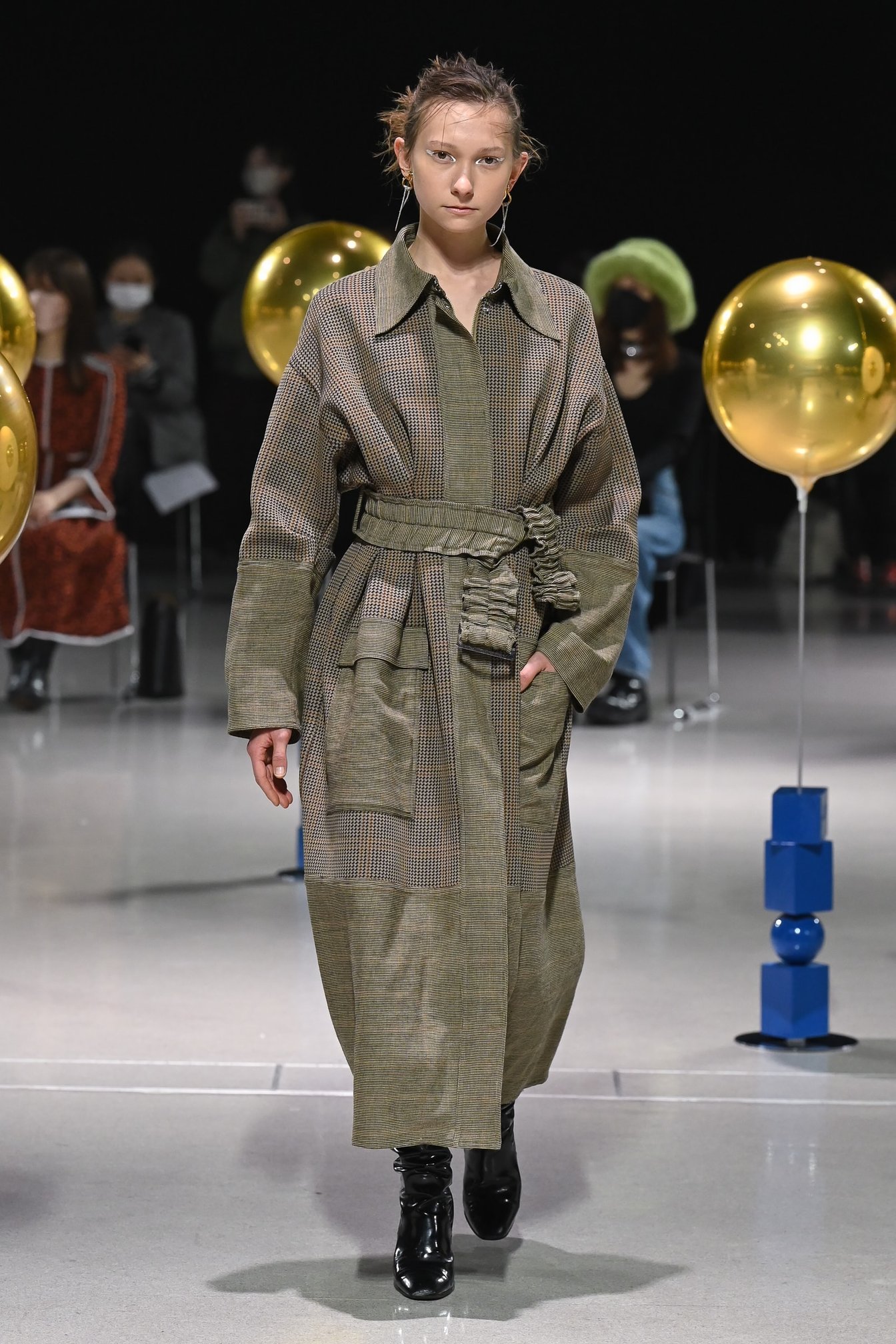 会場に設置されていたのは、青色の積み木のようなものと金色の球体が組み合わさったオブジェ。ラメ糸が編み込まれることで繊細に輝くシルバーのニットドレスをまとったモデルが、球体の合間を縫うように歩く。球体のオブジェが遮蔽物となり観賞者からモデルが見え隠れする光景は、プリーツがほどこされたニットドレス特有の不規則でゆらゆらとした動きも相まって幻影をみてしまったかのような感覚、あるいは誰かの記憶や思い出深いシーンを覗き見しているような感覚に襲われた。会場である渋谷ヒカリエ ホールAは、東京のコレクションウィーク中に最も足を運んだ場所であるはずなのに、「マラミュート(malamute)」が発表した2022年秋冬コレクションを通して観た15分間は、慣れ親しんだ現実の空間とは思えず、デザイナー小高真理の記憶を追体験する巨大な装置として機能していた。