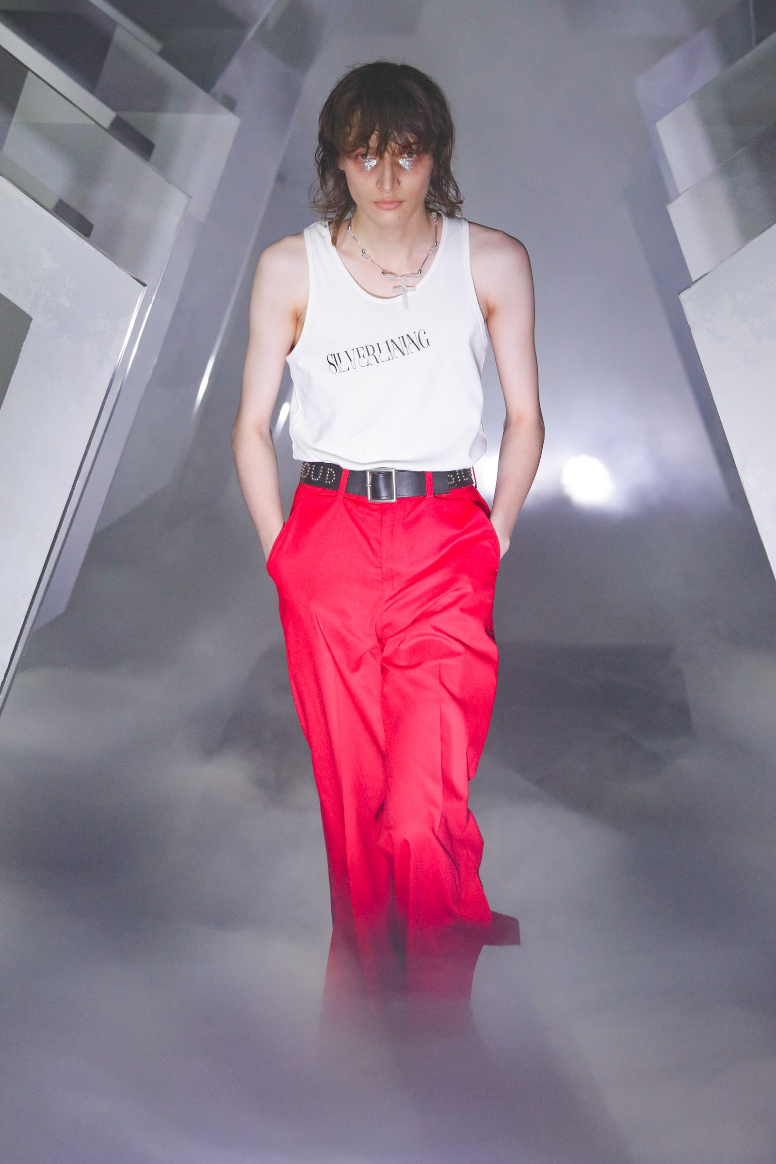 白のタンクトップに赤のフレアパンツをあわせたファーストルックは、後藤が高校時代にしていたスタイルを再現したもの。フレアパンツをはじめ、シルバーの加工が施されたライダースジャケットなど、70’sファッションを彷彿とさせるアイテムが数多く披露された。また前シーズンに引き続き、オーダーシューズブランド「フィルシューズ(Filshoes)」やオーダーハットブランド「ノゾミクロカワ(Nozomi Kurokawa)」など同世代の若い職人と協業した帽子や靴も発表した。