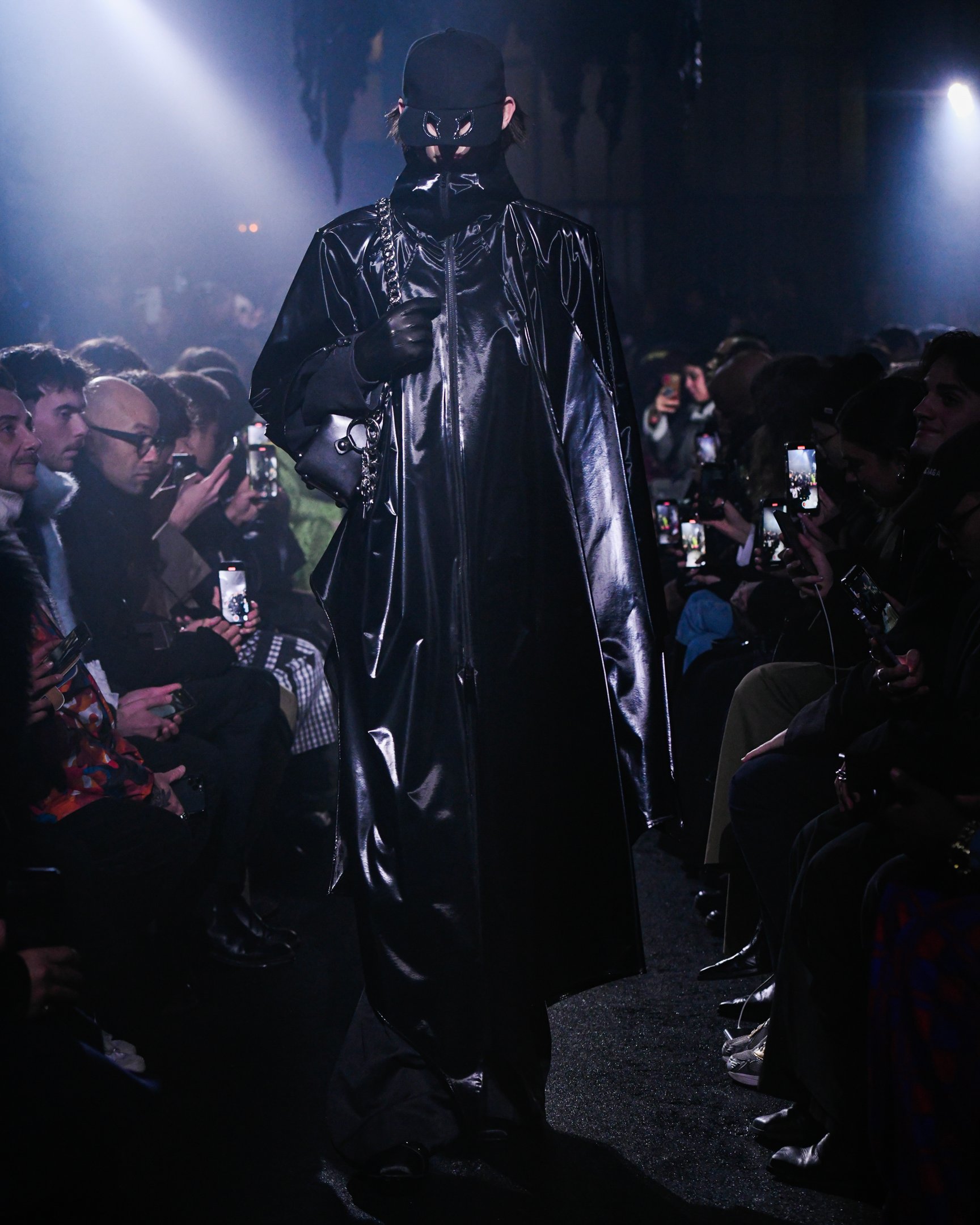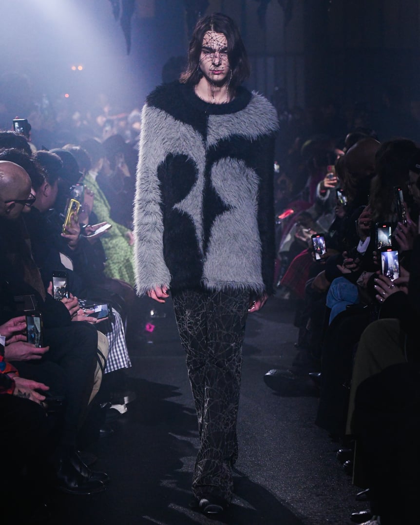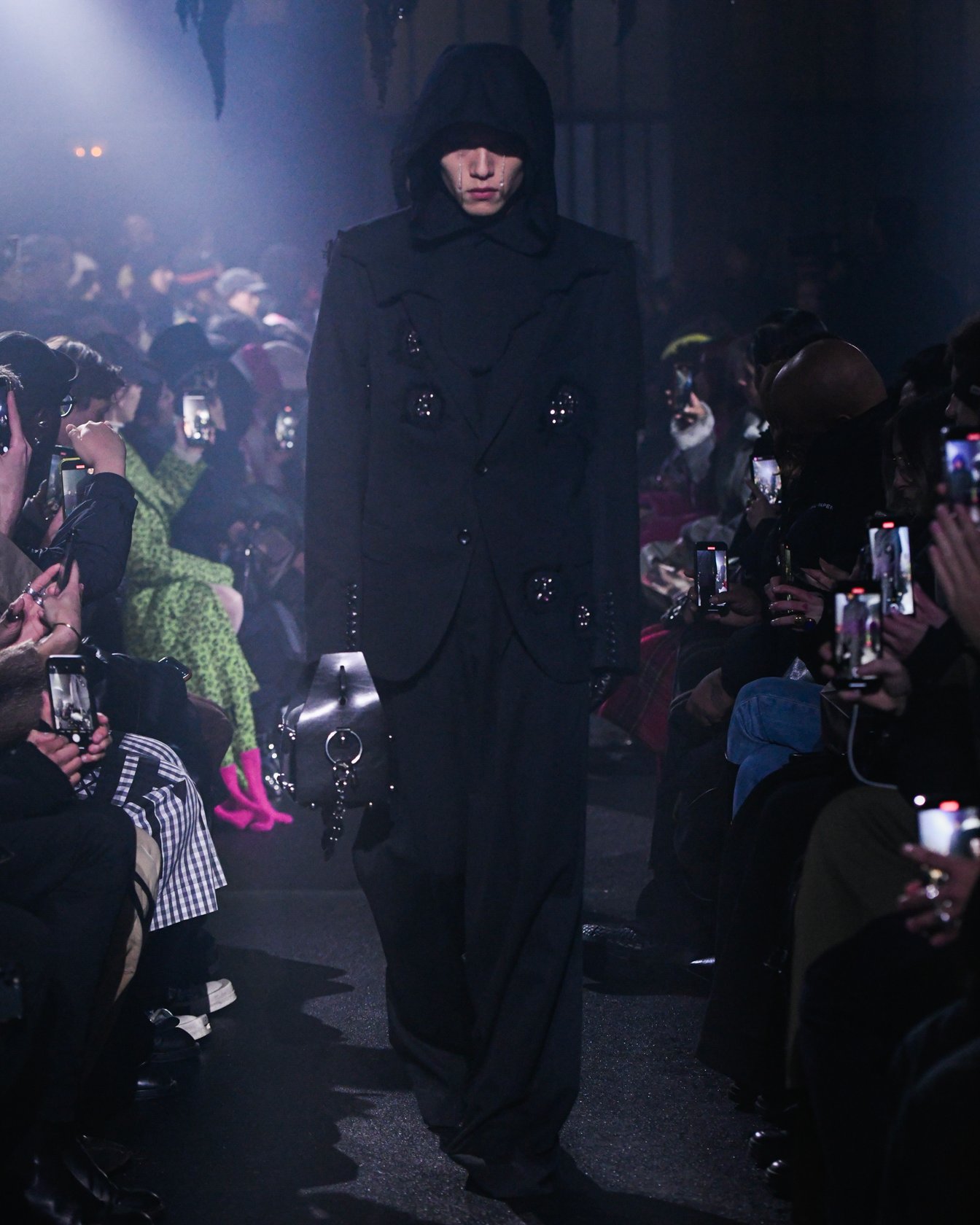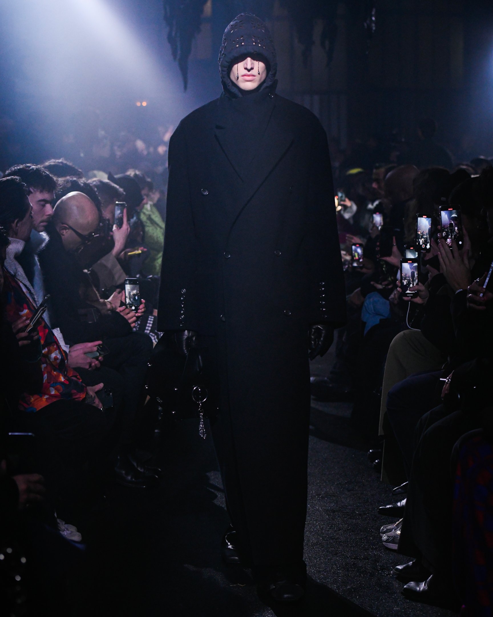 薄暗い会場の天井からは、おどろおどろしい巨大な黒のランプシェードが吊り下げられている。哀愁漂うピアノが鳴り響く中、ゆっくりと歩いてきたファーストルックは、漆黒のセットアップだ。魔術師を思わせるケープのフードを深く被り、虚な瞳にはクリスタルの涙がキラリと光る。