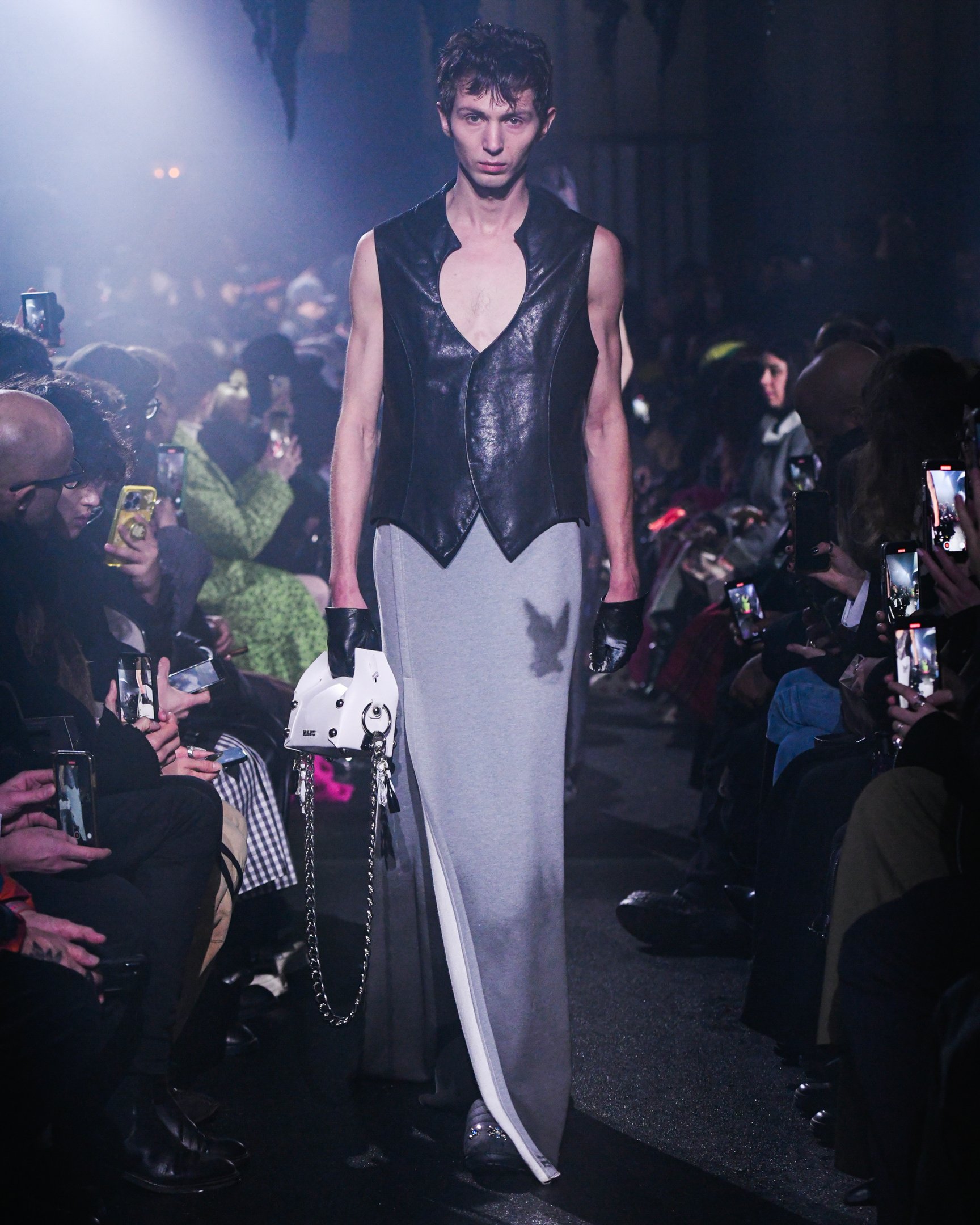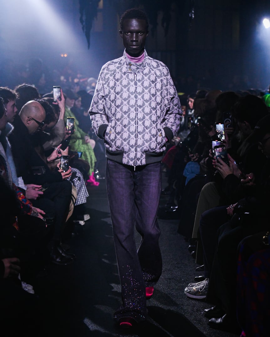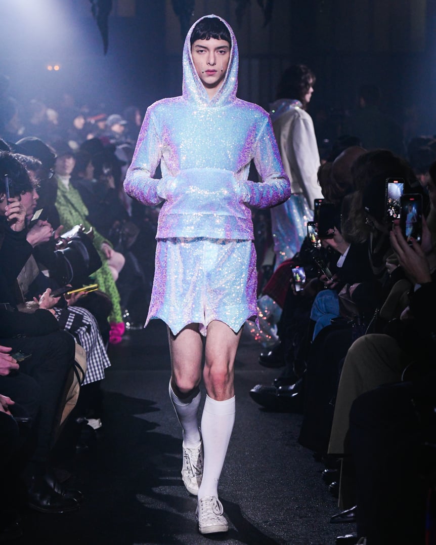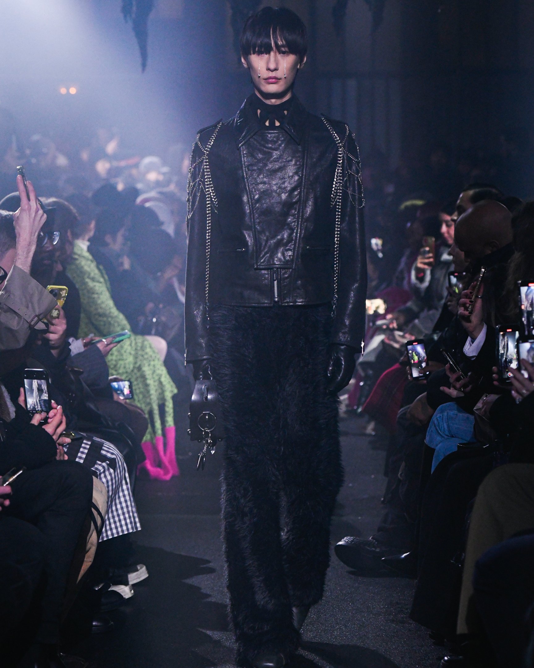 薄暗い会場の天井からは、おどろおどろしい巨大な黒のランプシェードが吊り下げられている。哀愁漂うピアノが鳴り響く中、ゆっくりと歩いてきたファーストルックは、漆黒のセットアップだ。魔術師を思わせるケープのフードを深く被り、虚な瞳にはクリスタルの涙がキラリと光る。