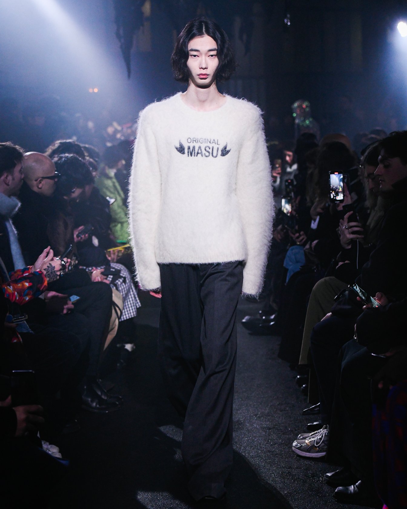 「ORIGINAL MASU」と書かれたニットウエアのルックで締めくくると、会場中にシャボン玉が舞い、フィナーレを迎えた。