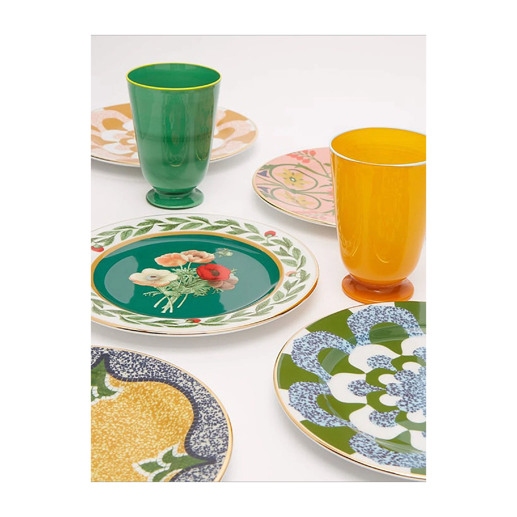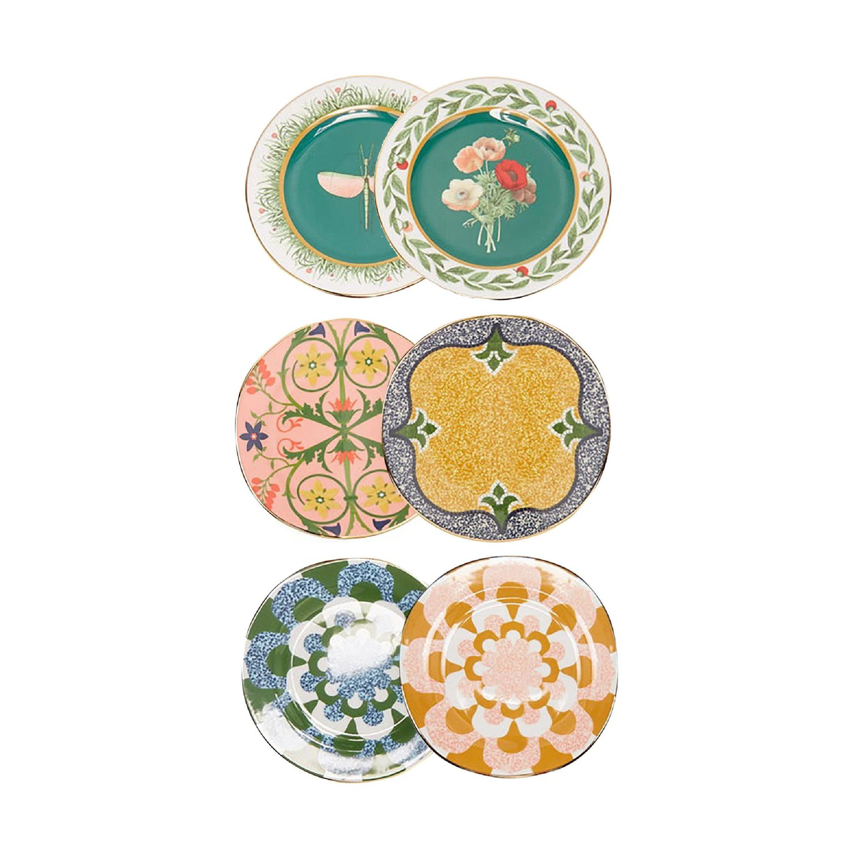 華やかなホームパーティが叶う「ラダブルジェイ(La DoubleJ)」のデザートプレートセット。それぞれが異なる、個性的で美しいアートデザインは彩りが溢れる反面、統一感もしっかりキープ。イタリアのコモ湖を拠点とするシルク専門メーカーのアーカイブからヒントを得た、明るく上品なデザインに引き込まれます。
