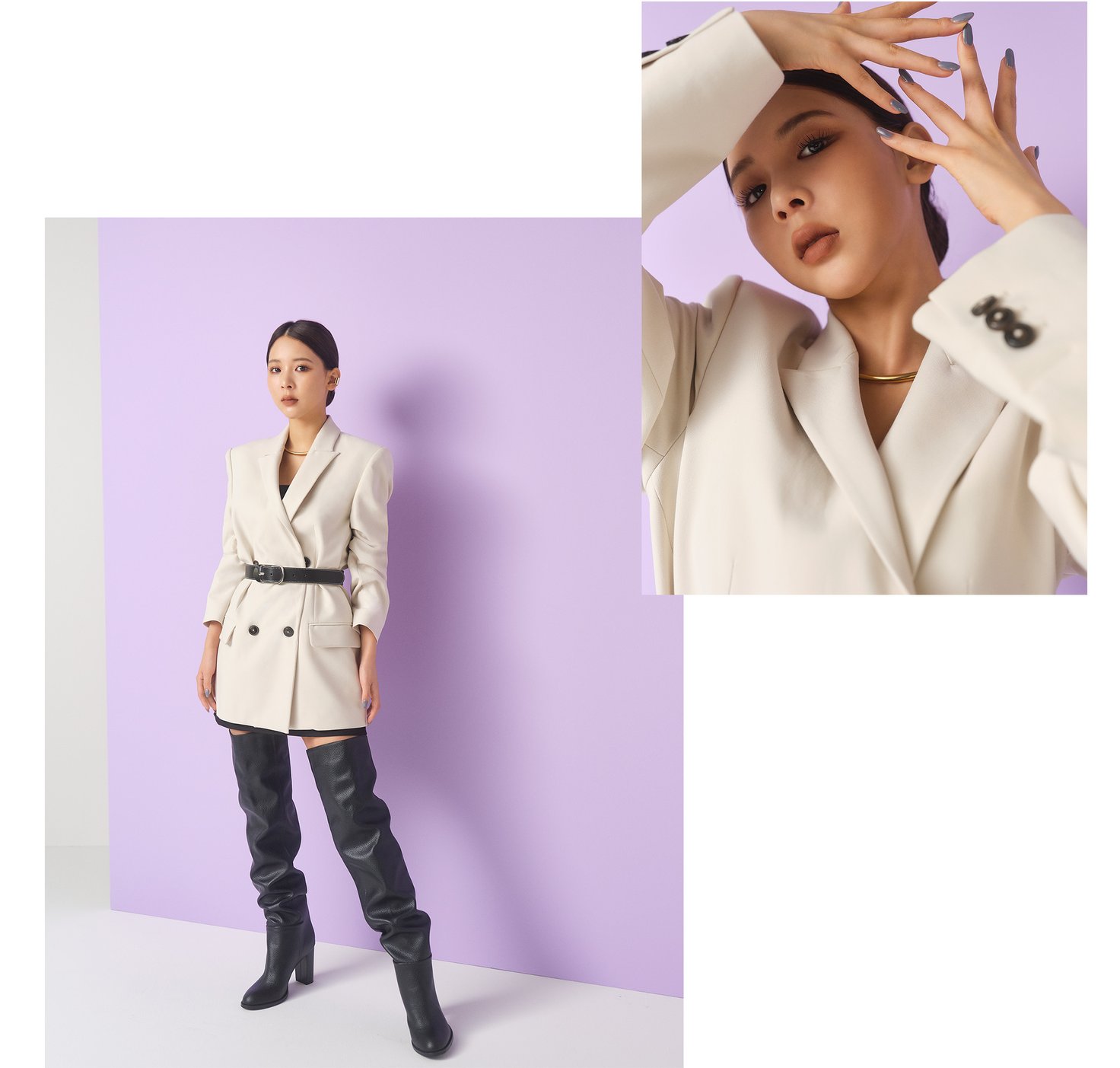 この秋、ぜひ一着持っていたいのは、スマートな雰囲気を作り上げるロング丈のテーラードジャケット。今シーズンはリラックスしたシルエットが特徴で、オン?オフ問わず気軽にまとえそう。また、スラウチーなサイハイブーツを合わせれば、ミチらしいアクティブなミニドレス風にもアレンジできる。洗練されたオフホワイトは、どんなアイテムにも合わせやすい万能カラー。クールにもオーセンティックにも、多様な着こなしが楽しめそう。