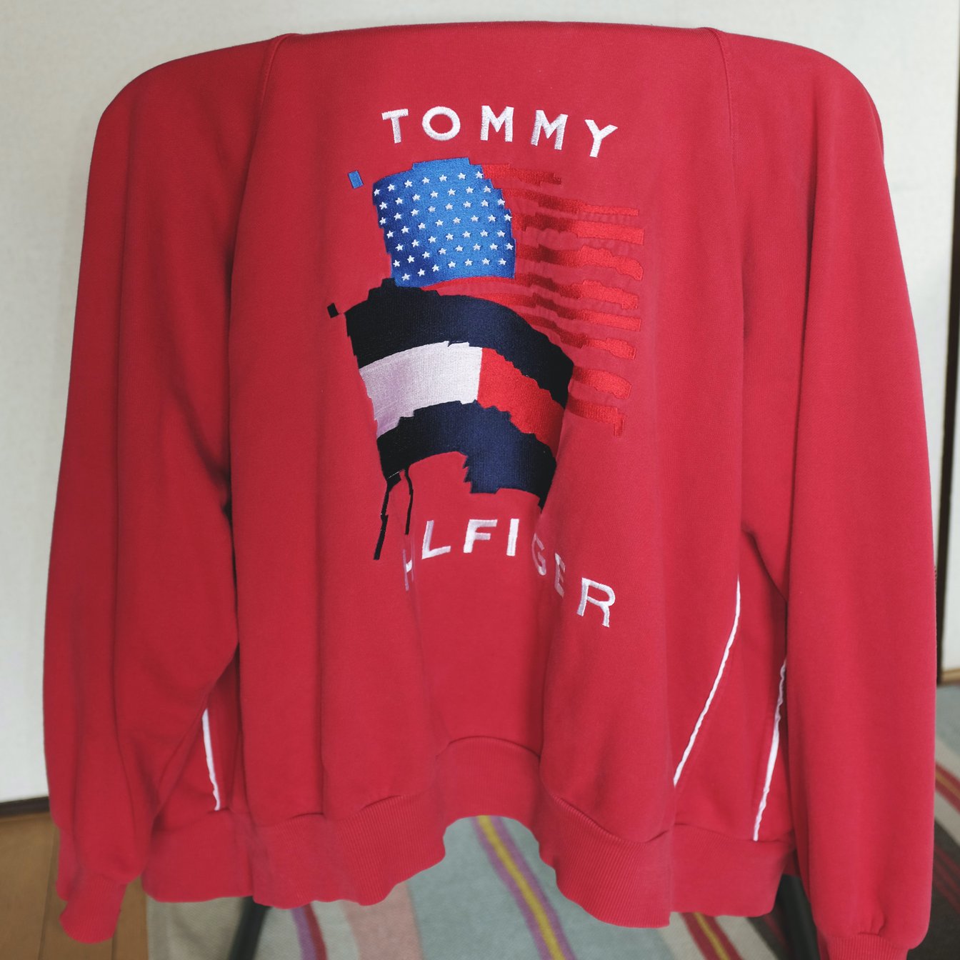 最近ずっとジップアップのパーカを探していたので。真っ赤なボディと白いパイピング、そして背中に施された「クール」とは程遠い刺繍の組み合わせが個人的にドンズバでした。弱いヤンキーが着ていそうというか。つい最近、伊東の古い旅館で泊まりのロケを行った際、寝巻きとして初めて袖を通したのですが、そこで「あ、これはあと数年使うな」と確信しました。