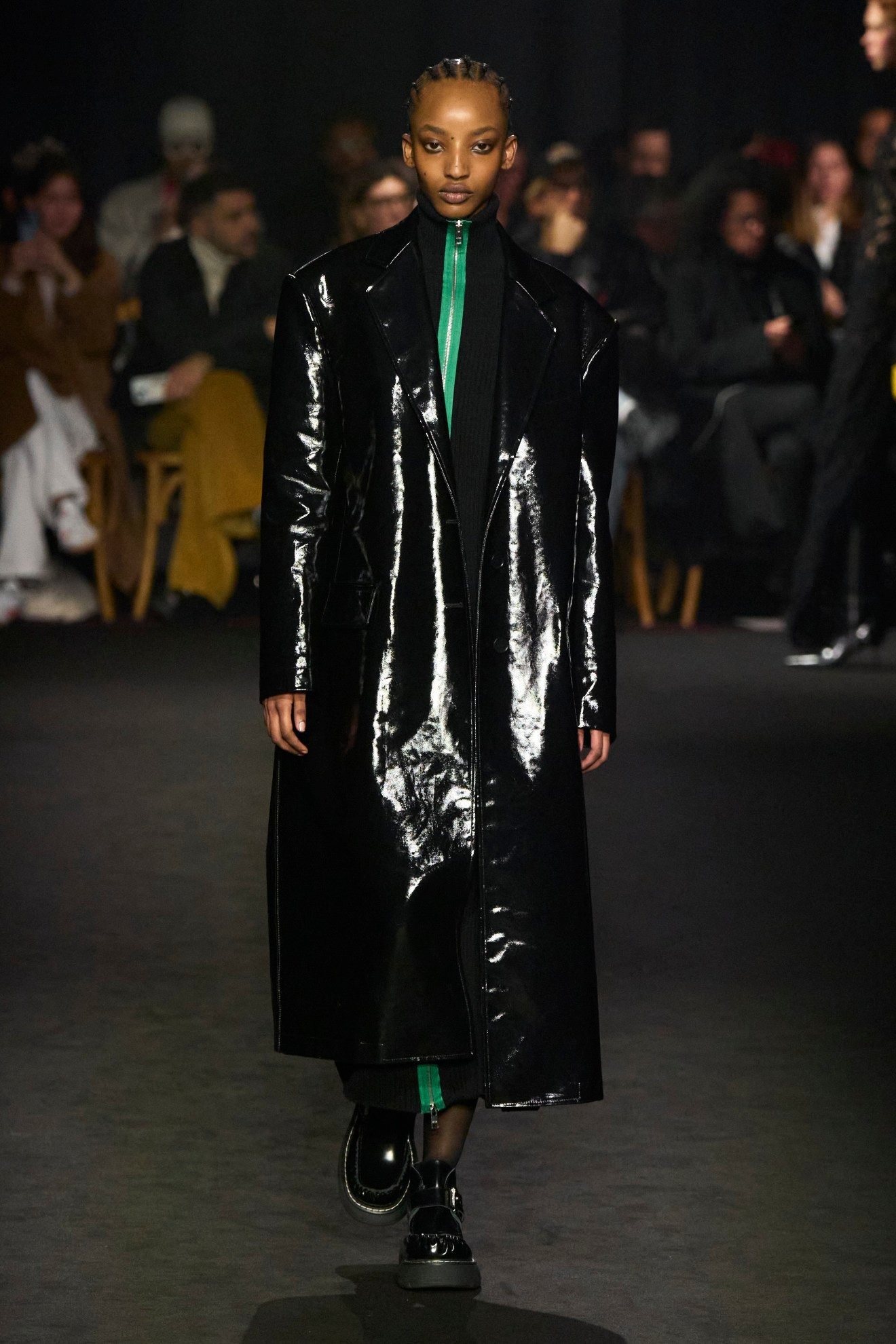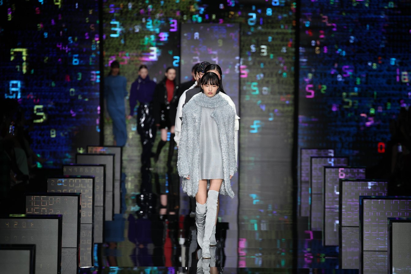 会場にはデジタルサイネージが設置され、カラフルなグラフィックを映し出す。モデルたちがまとっていたのはサイバーパンクやY2Kの要素を取り入れた装い。フューチャリスティックな光沢素材を採用し、エネルギッシュかつ知的な女性像を描いた。