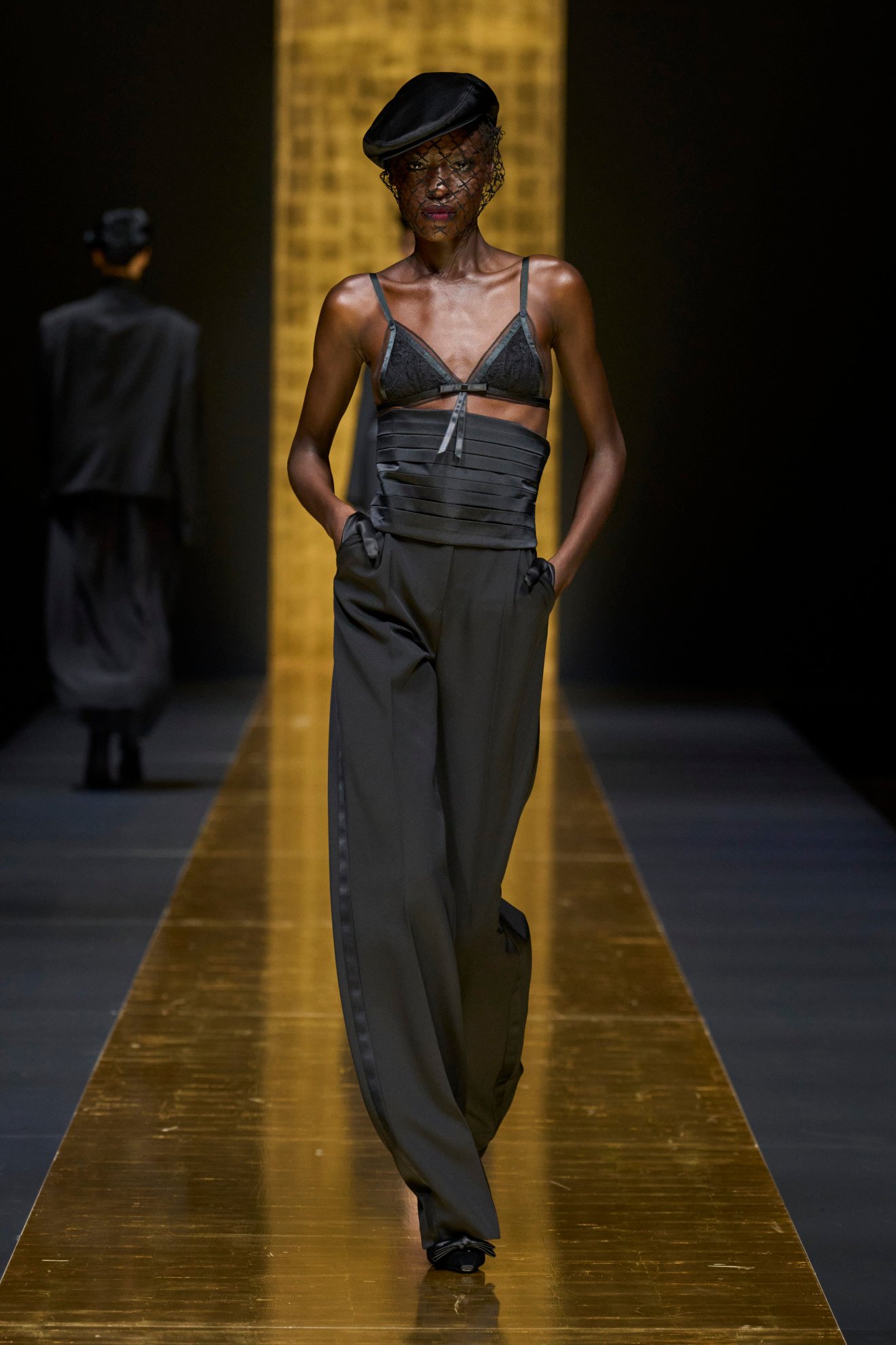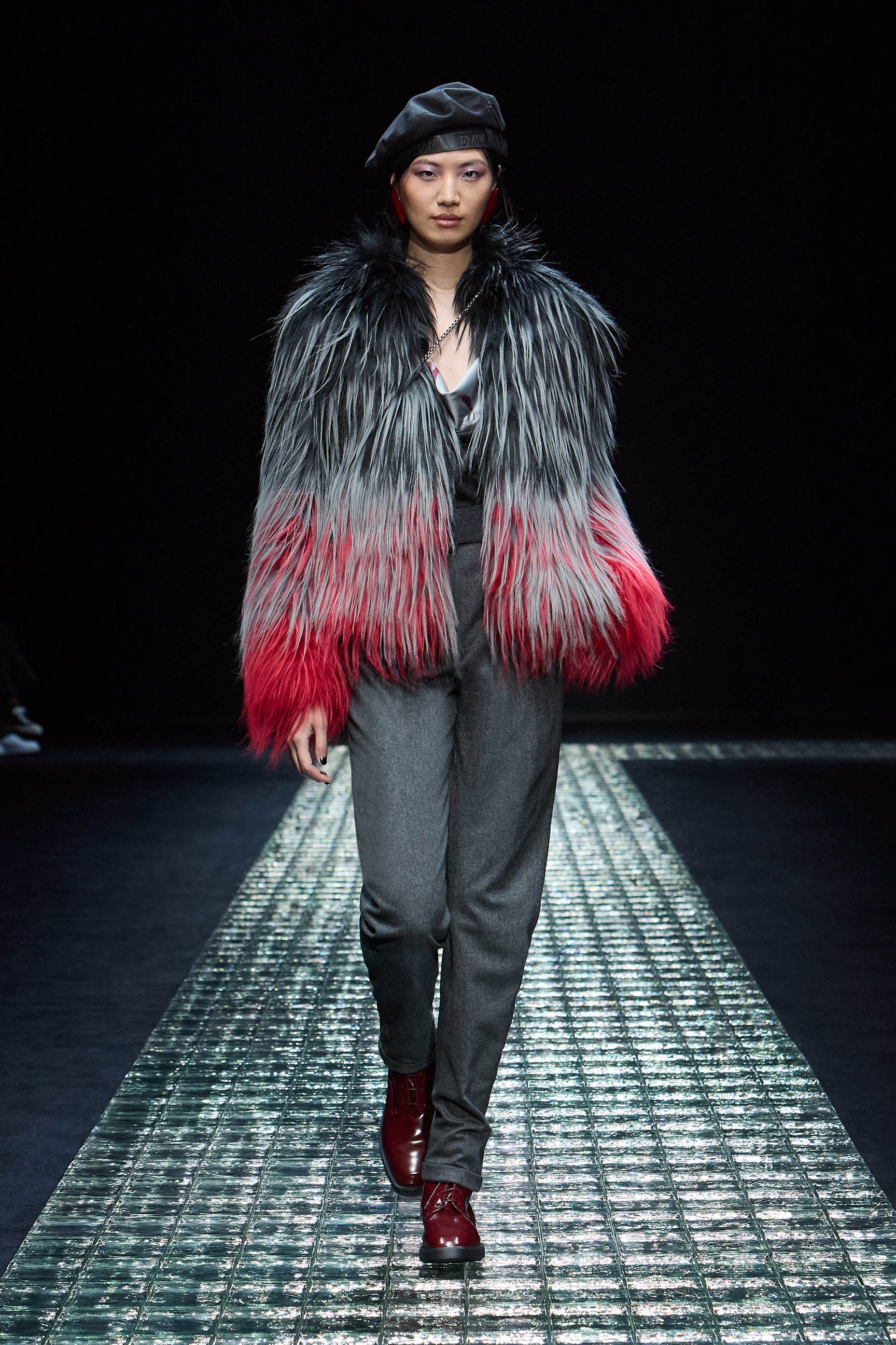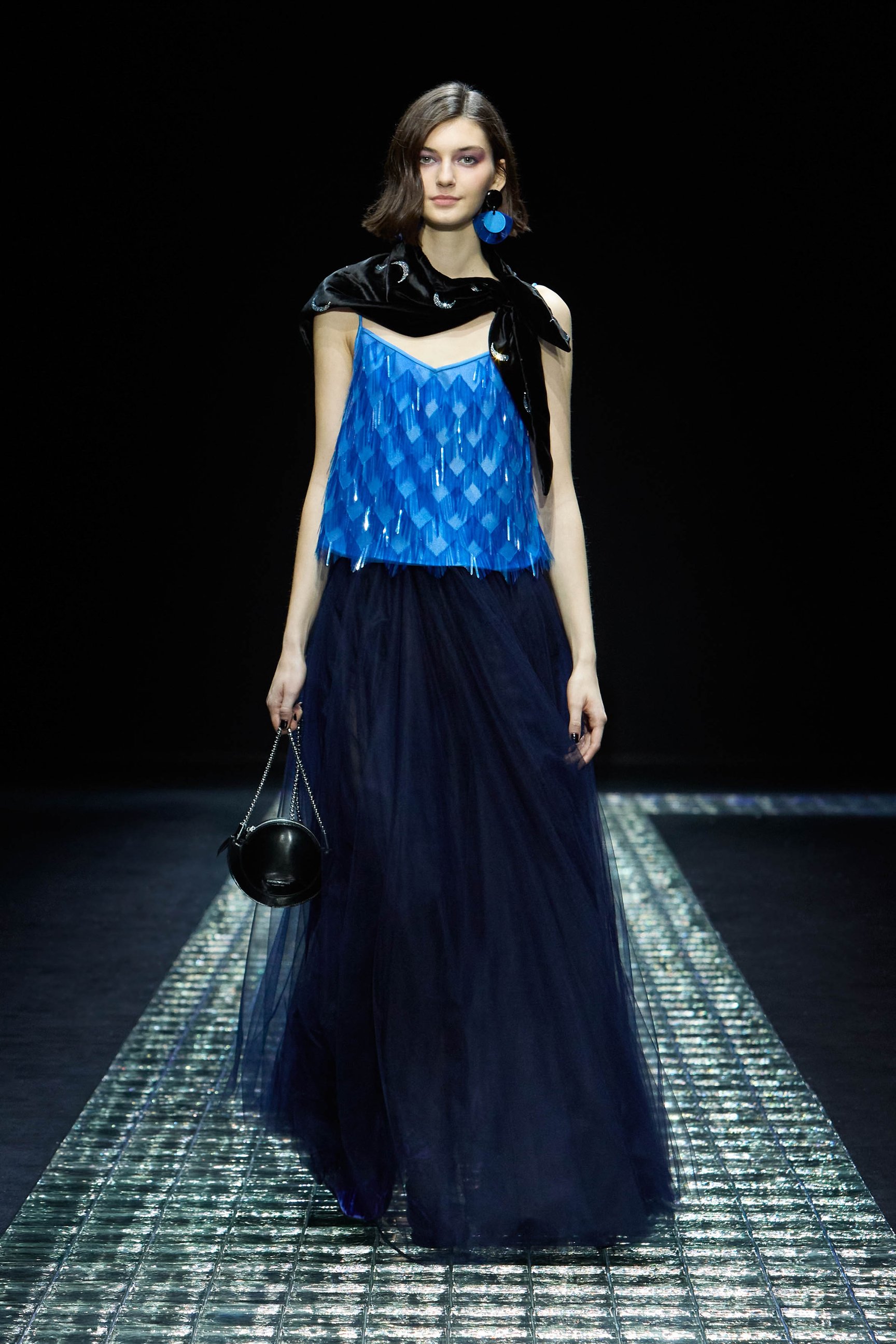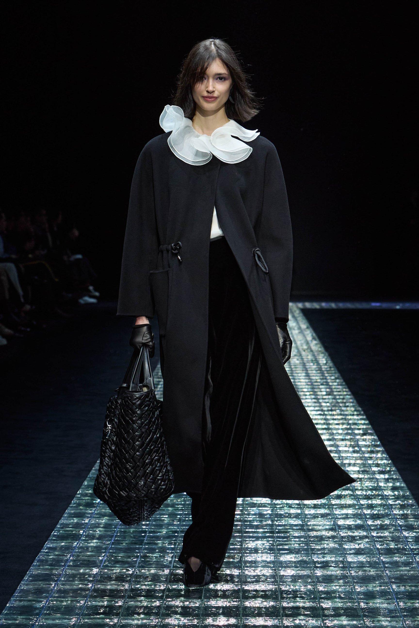 ジョルジオ?アルマーニ(Giorgio Armani)が手掛ける「エンポリオ アルマーニ」のテーマは「夜光」。待ちわびた夜に躍動する、自由なマインドの女性像を描いた。ジャンプスーツやルーズなテーパードパンツに、かぎ針編みのベストやフェイクファーニットをコーディネート。夜空を思わせるブラックを基調に、モーブ、バイオレット、ジェイドグリーン、グレーなど、“太陽が沈んだ冬の空”を表現した色彩がルックを彩った。