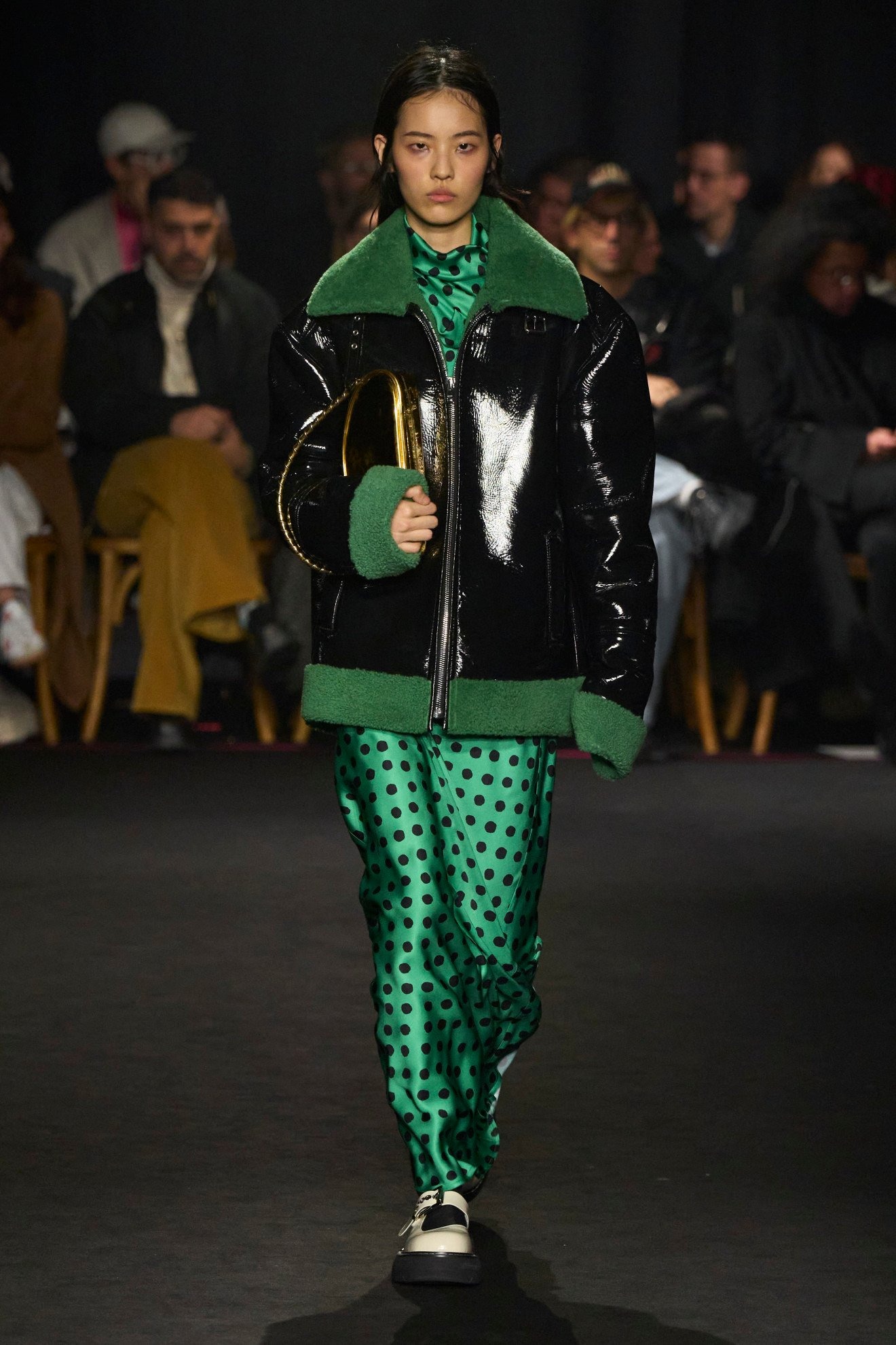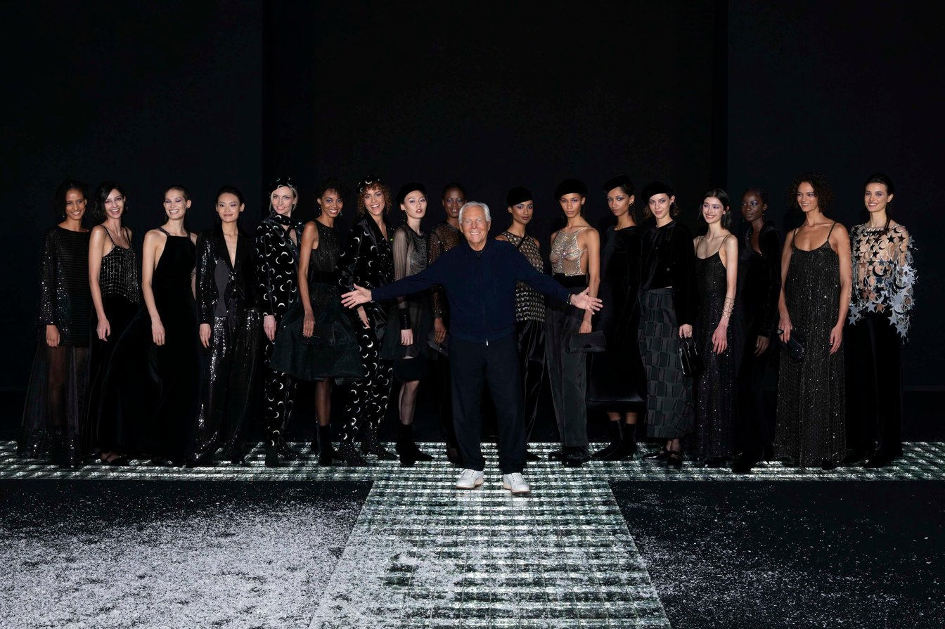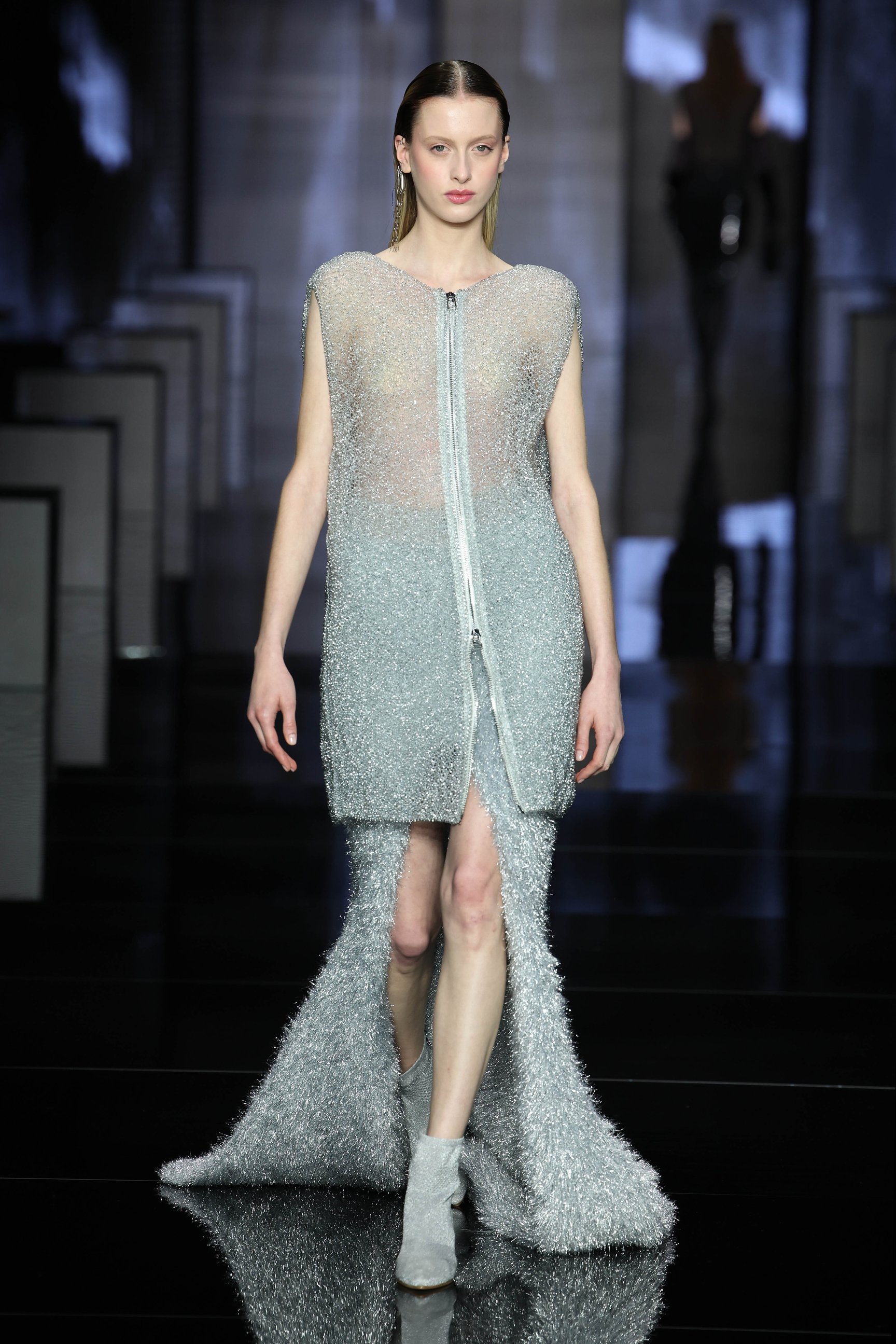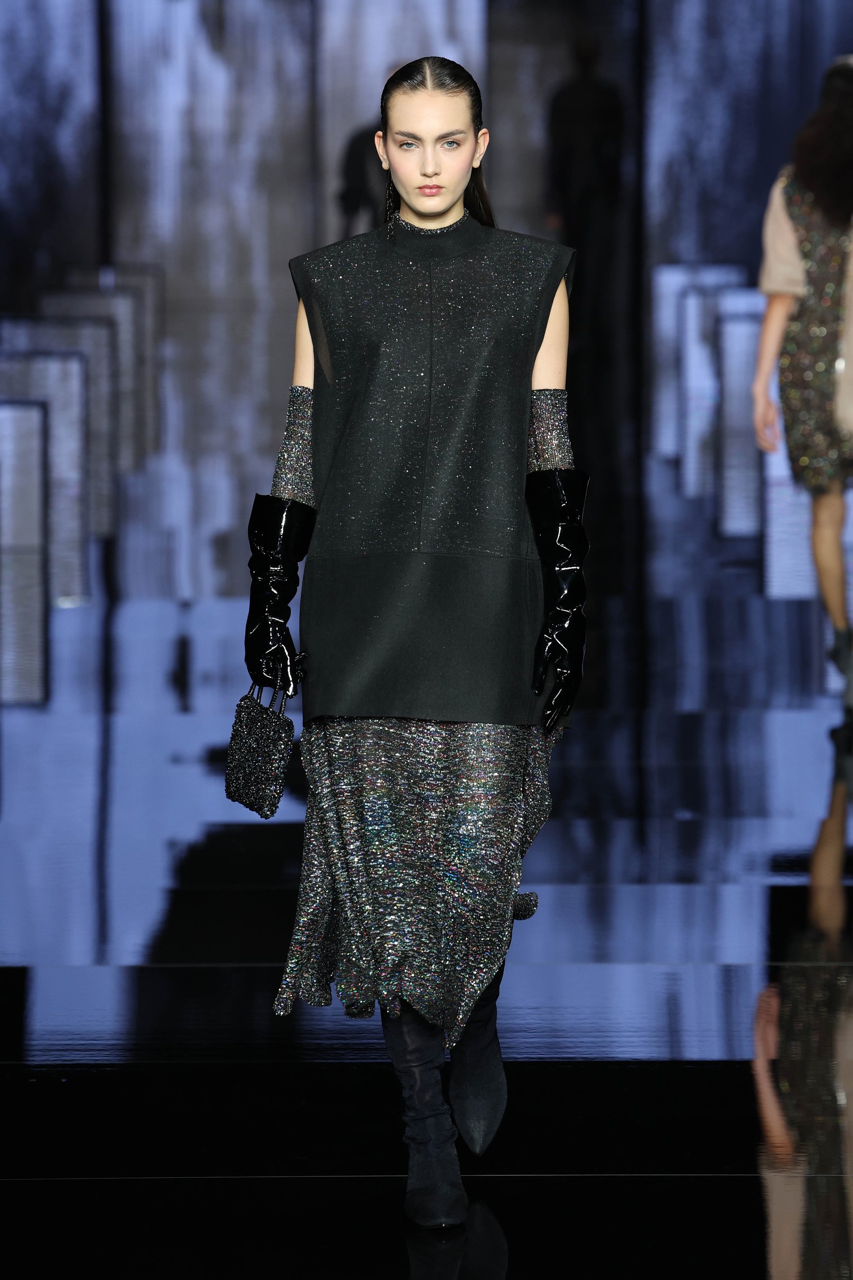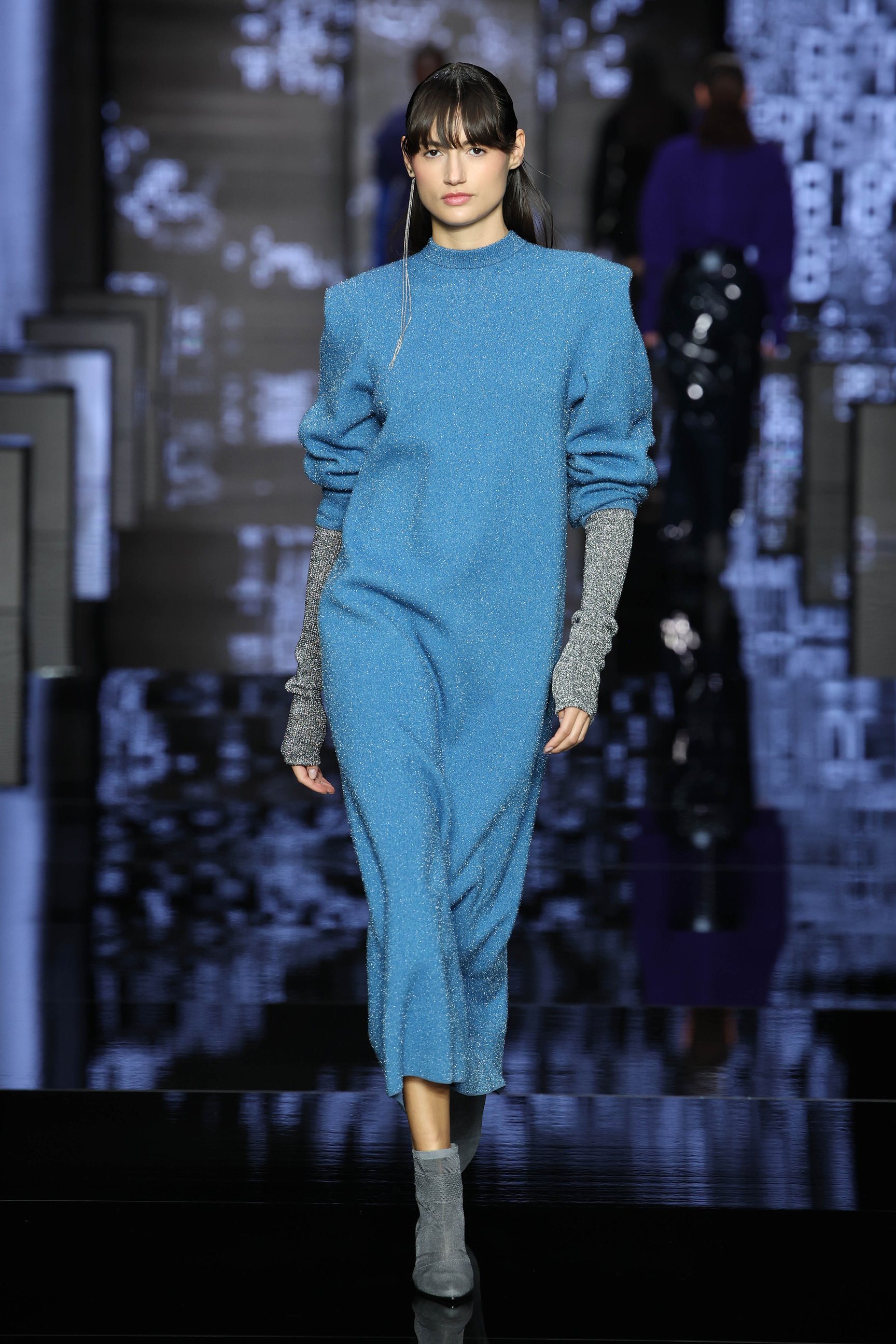 ジョルジオ?アルマーニ(Giorgio Armani)が手掛ける「エンポリオ アルマーニ」のテーマは「夜光」。待ちわびた夜に躍動する、自由なマインドの女性像を描いた。ジャンプスーツやルーズなテーパードパンツに、かぎ針編みのベストやフェイクファーニットをコーディネート。夜空を思わせるブラックを基調に、モーブ、バイオレット、ジェイドグリーン、グレーなど、“太陽が沈んだ冬の空”を表現した色彩がルックを彩った。