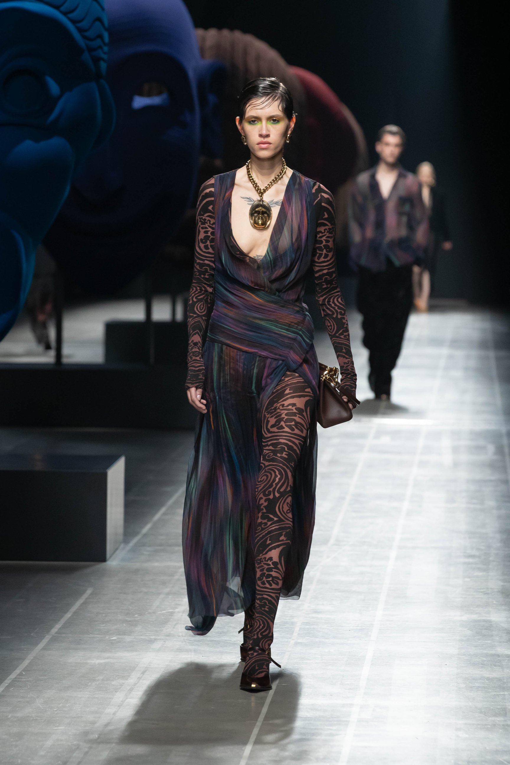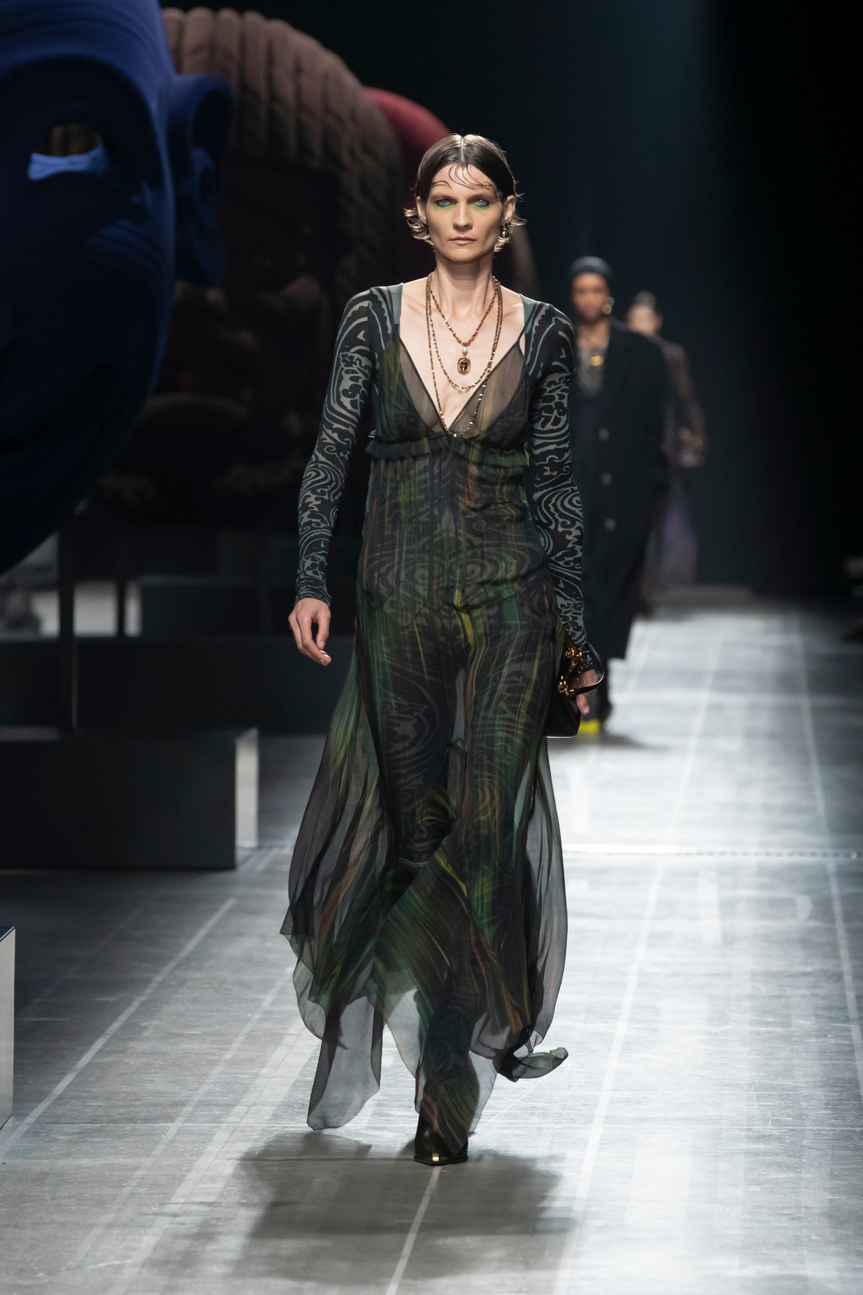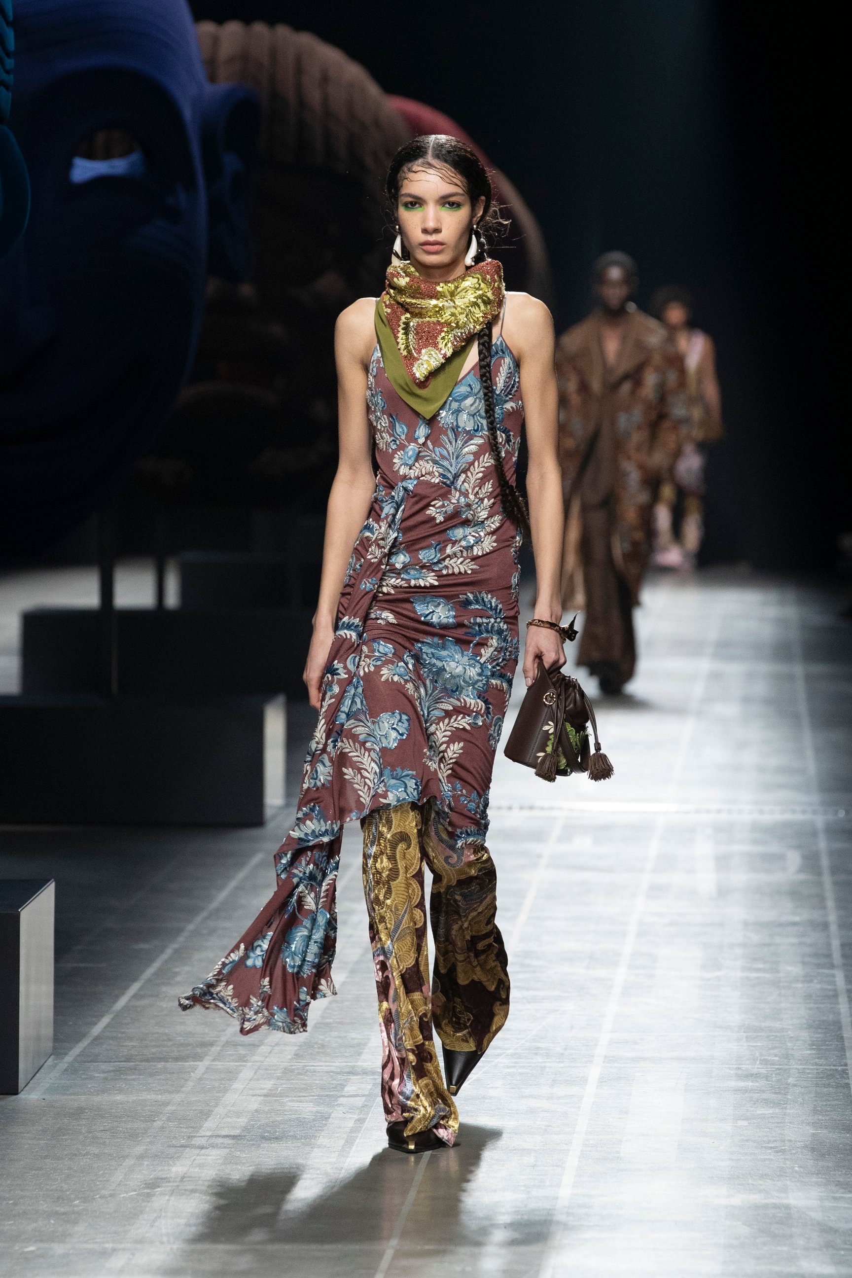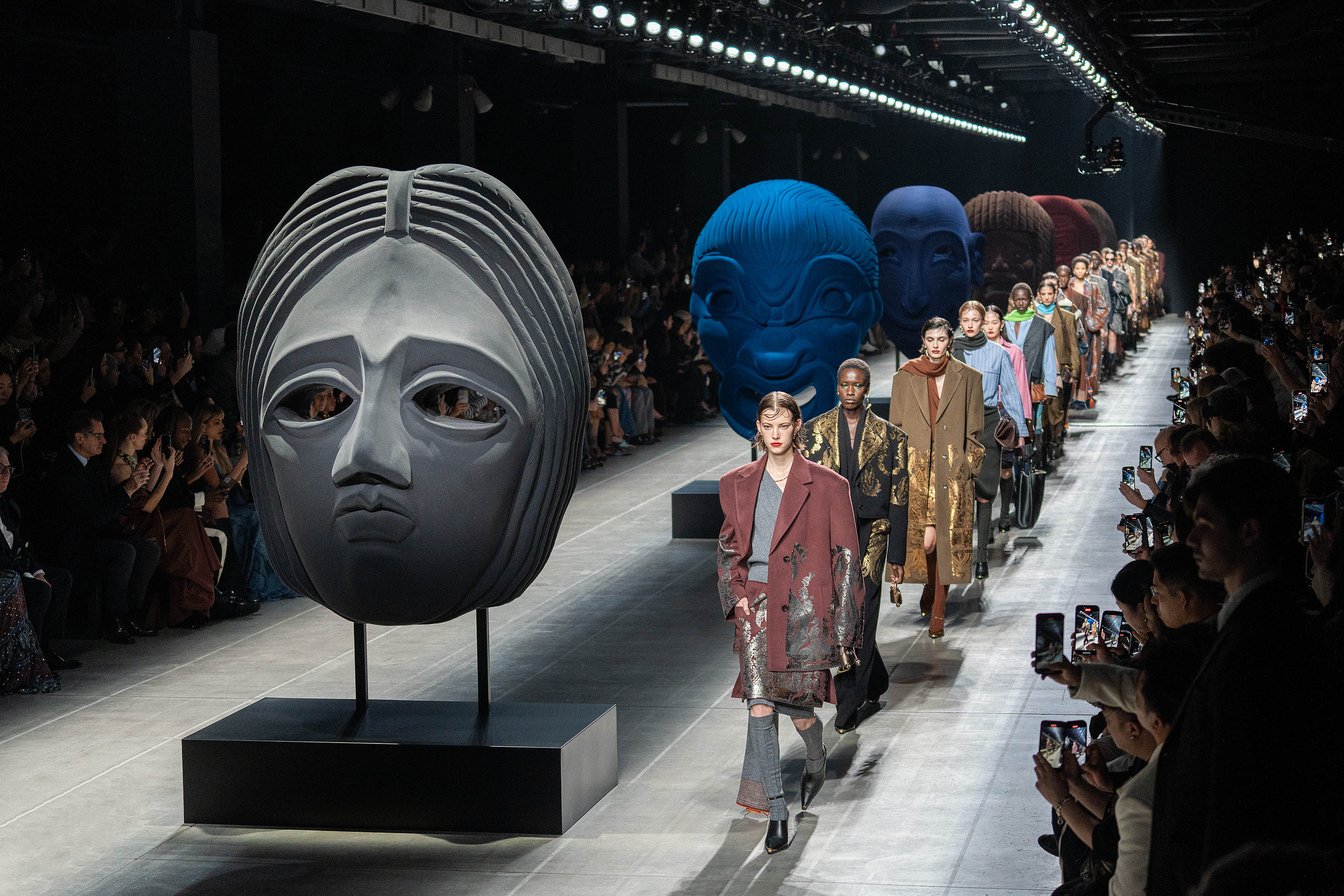 マルコ?デ?ヴィンチェンツォ(Marco De Vincenzo)が手掛けるエトロのテーマは「エトロアクト(ETRO ACT)」。ホメロスの「オデュッセイア」からインスパイアされ、異文化への探究を軽やかなレイヤードの中に表現した。ランウェイにずらりと並んだのは、大迫力の巨大マスク。古代の劇場で感情やキャラクターを表現したモチーフがずらりと並び、まるで遺跡のような雰囲気を醸し出す。