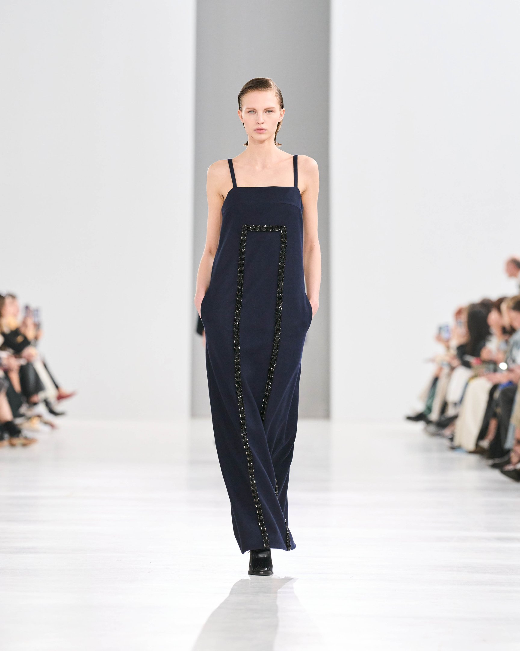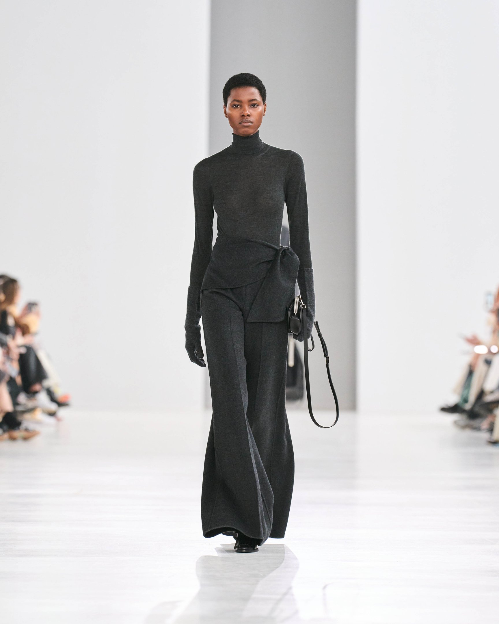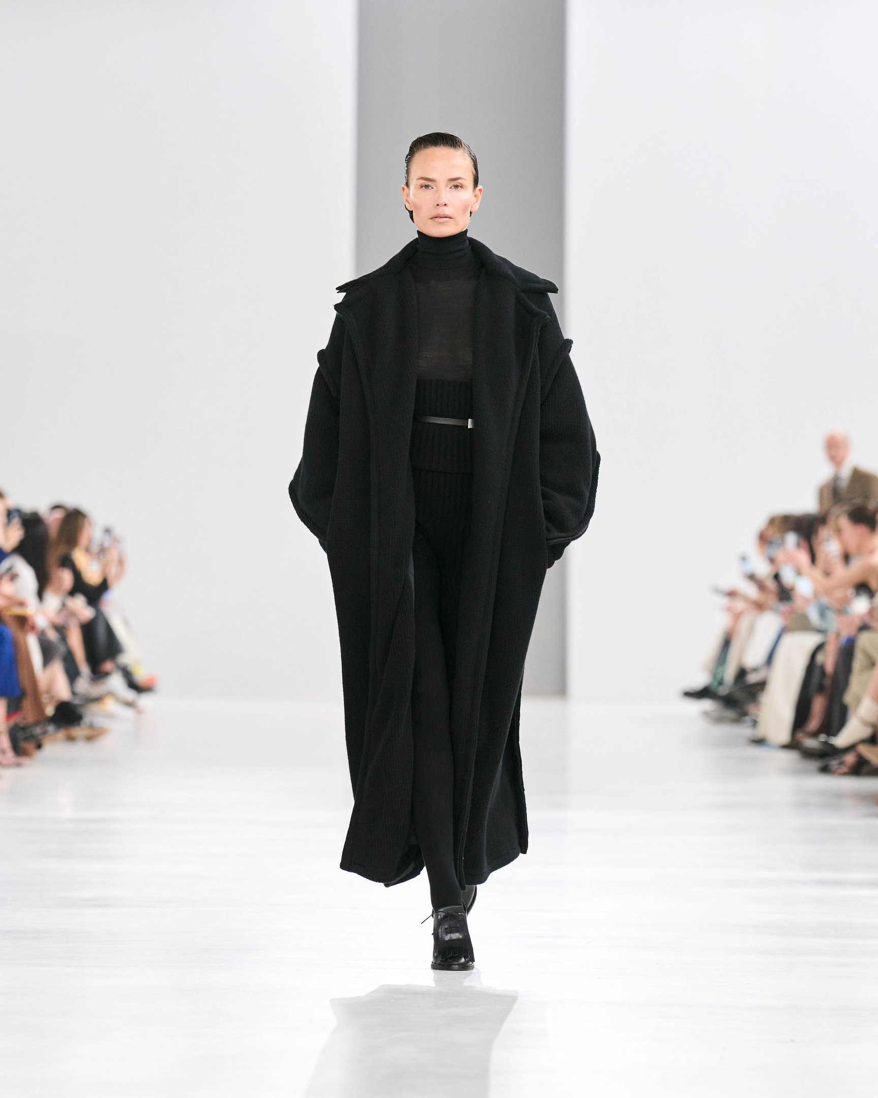 イアン?グリフィス(Ian Griffith)が手掛けるマックスマーラは、フランスの作家 コレット(Colette)から着想を得て、“人生を自らコントロールできる完璧な女性像”を表現。「インナーライフ(THE INNER LIFE)」と題し、余分なものが削ぎ落とされた、モダンかつスマートな装いを探究した。カラーは、深みのあるネイビーや漆黒、スモーキーグレーといった落ち着いたトーン。コレットがしばしば男性のような格好をしていたことから、黒を多用したハンサムな世界観を打ち出した。