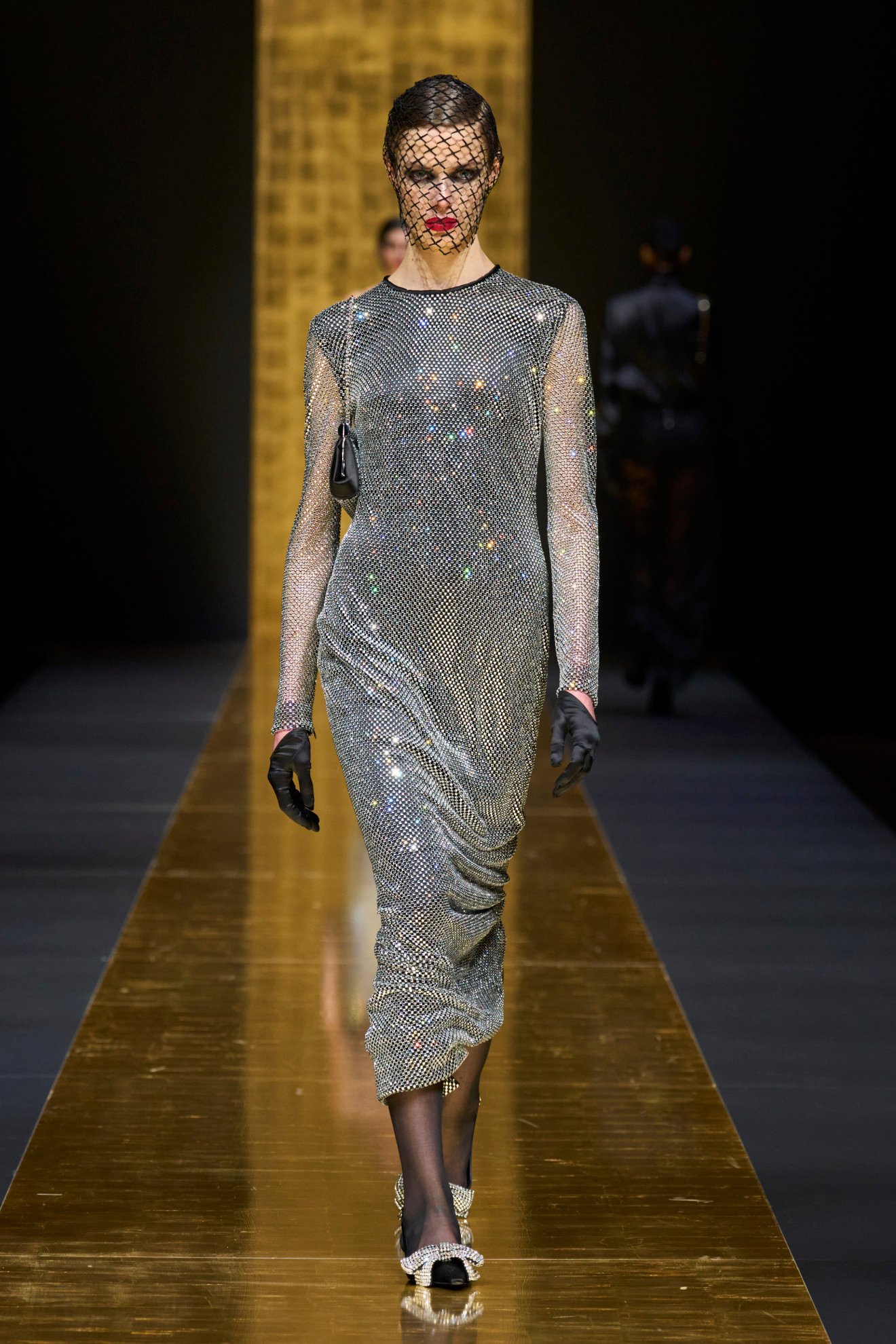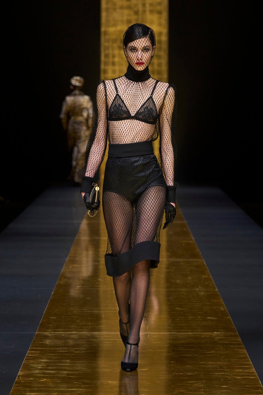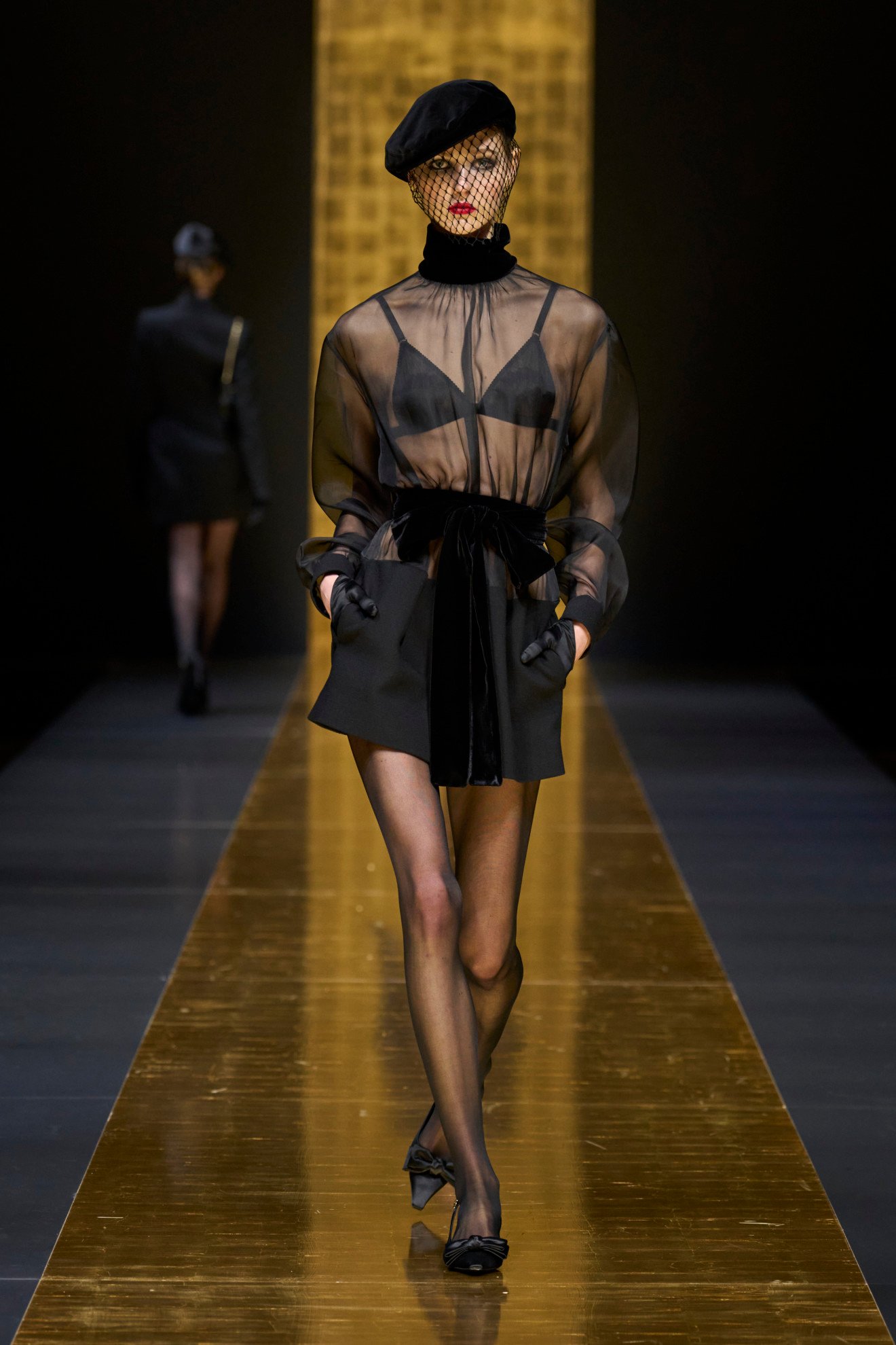 コレクションはブラックを基調とし、クリスタルの装飾が施されたドレスやレオパード柄のコートなどでアクセントを効かせた。フォルムを際立たせるショート丈のジャケットやカマーバンドなどタキシードのディテールは残しつつ、ネットやヴェール、レースなど、女性の体に透明感を与える素材でマスキュリン、フェミニンさを融合。サルトリアの文化に深く根ざしたタイムレスなエレガンスを提案したという。