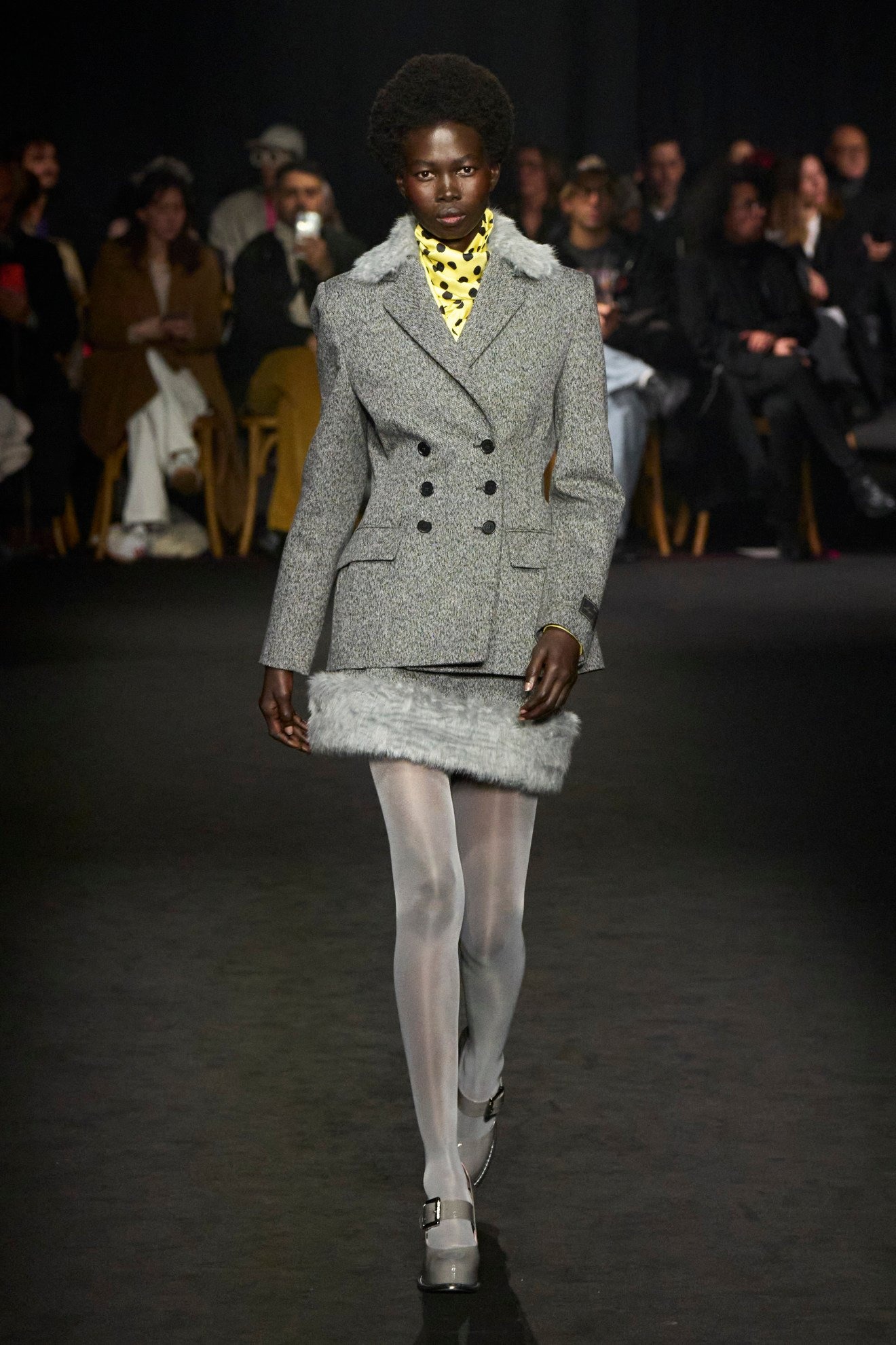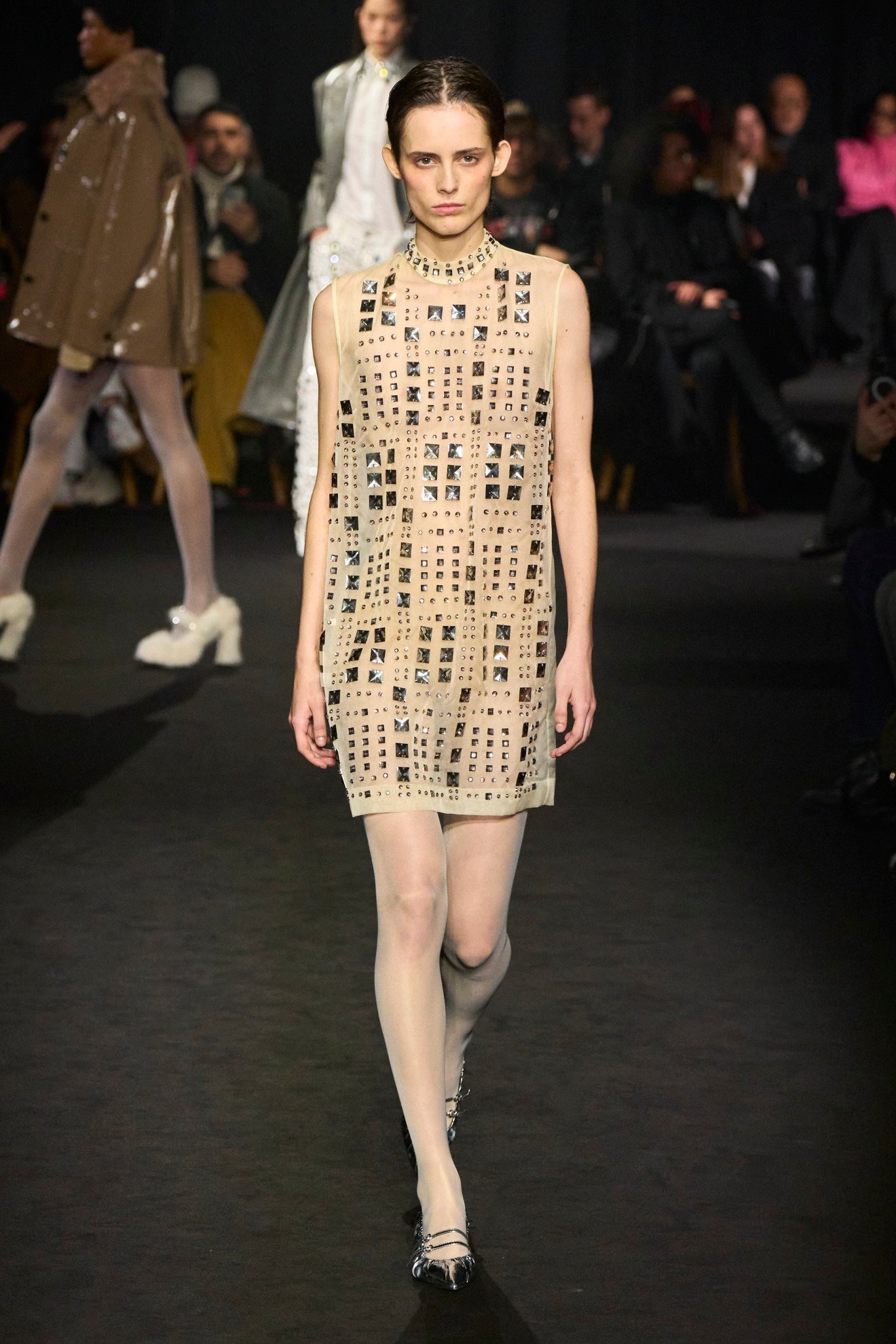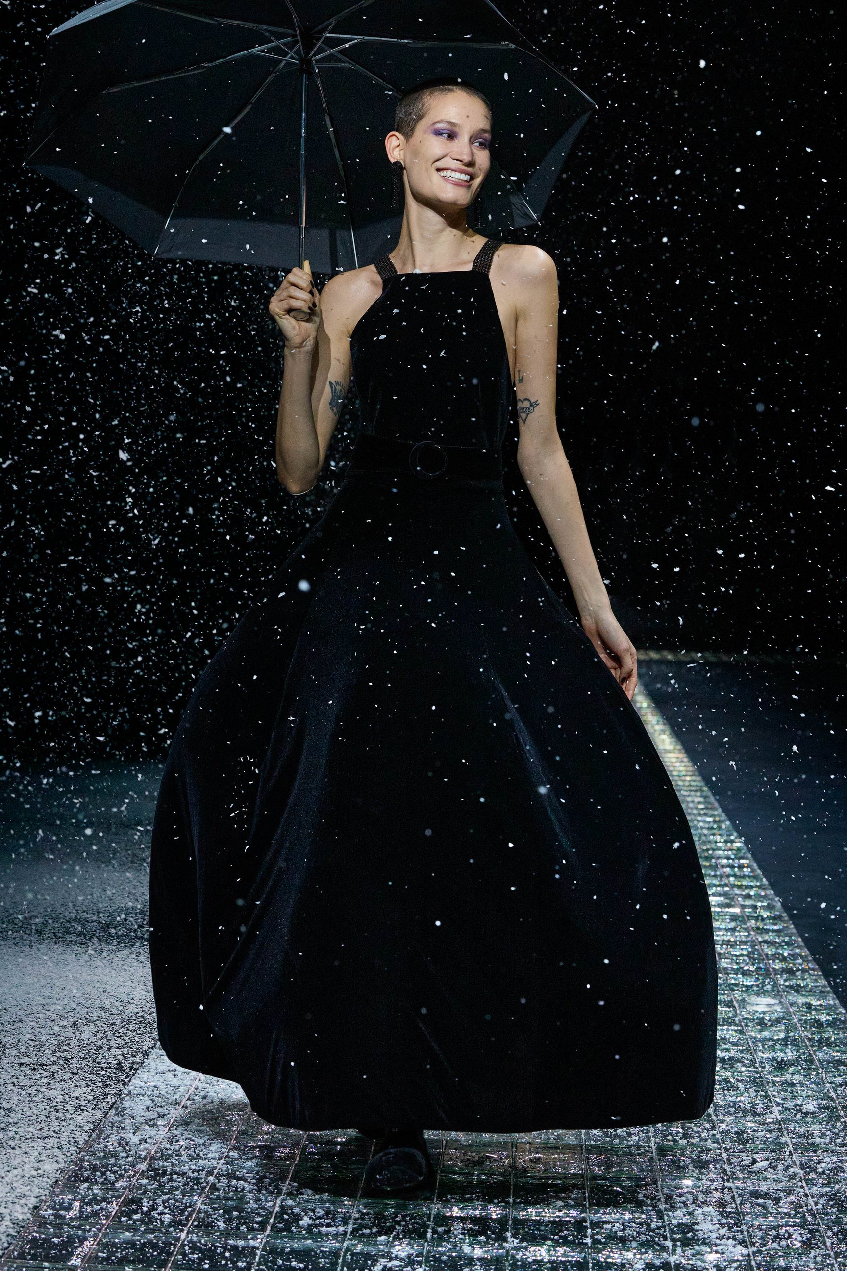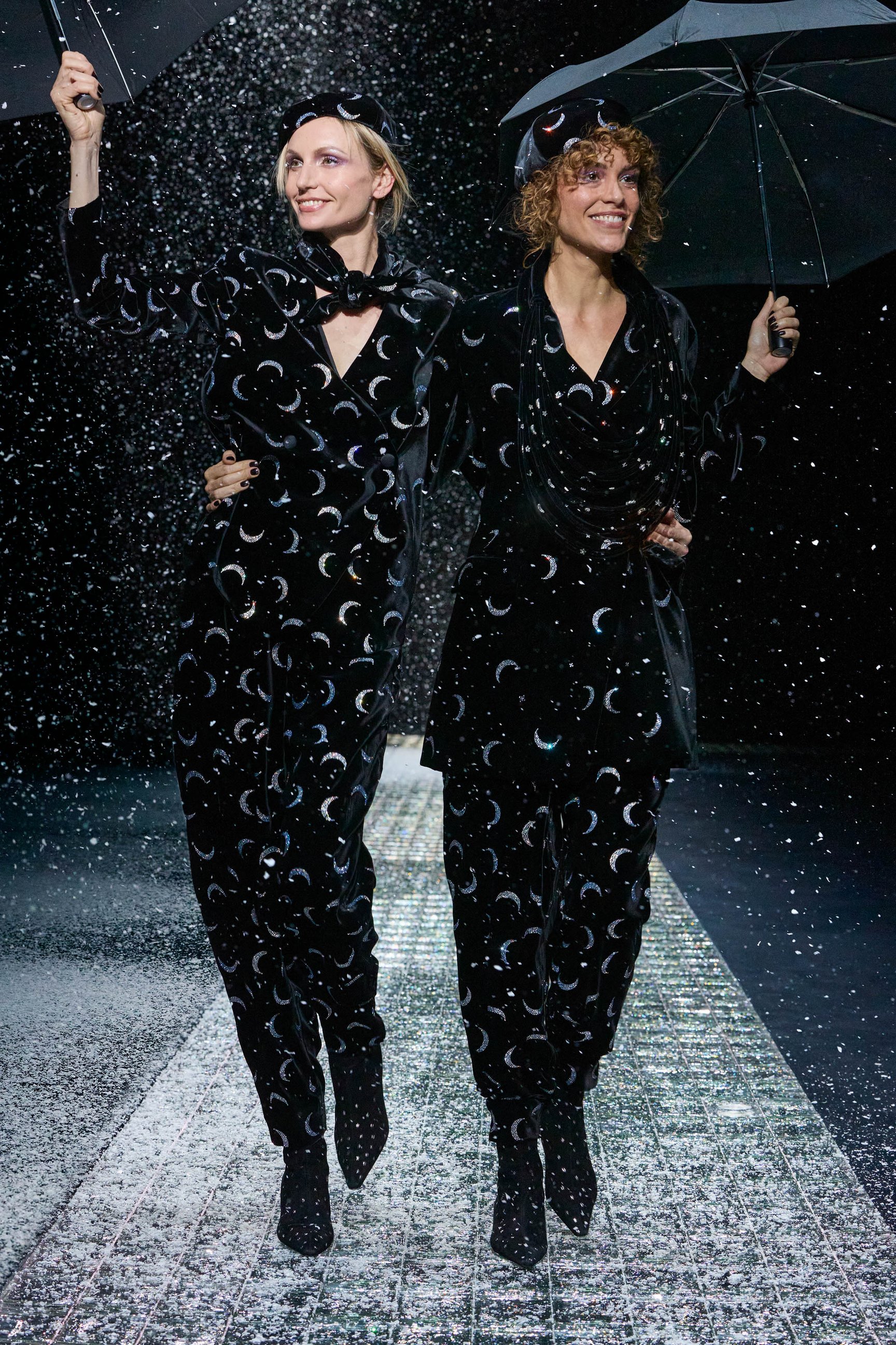 メタリックな装飾、星や月の刺しゅう、そして炎のようなラインストーンのチェーンがきらめきを演出。フィナーレにはモデルたちが雨雪の降る中、傘を手にして登場。弾むような足取りと笑顔が、暗い時代を明るく照らすかのようだった。