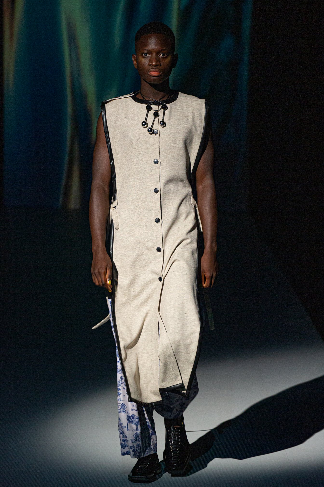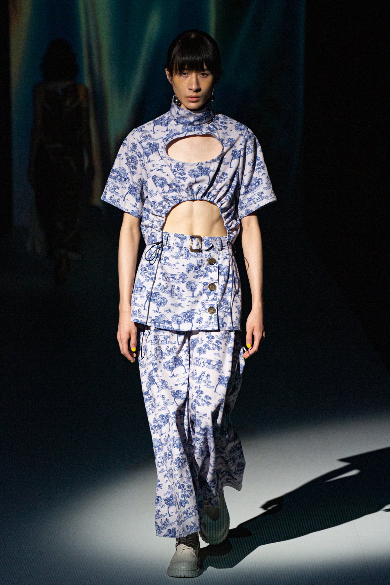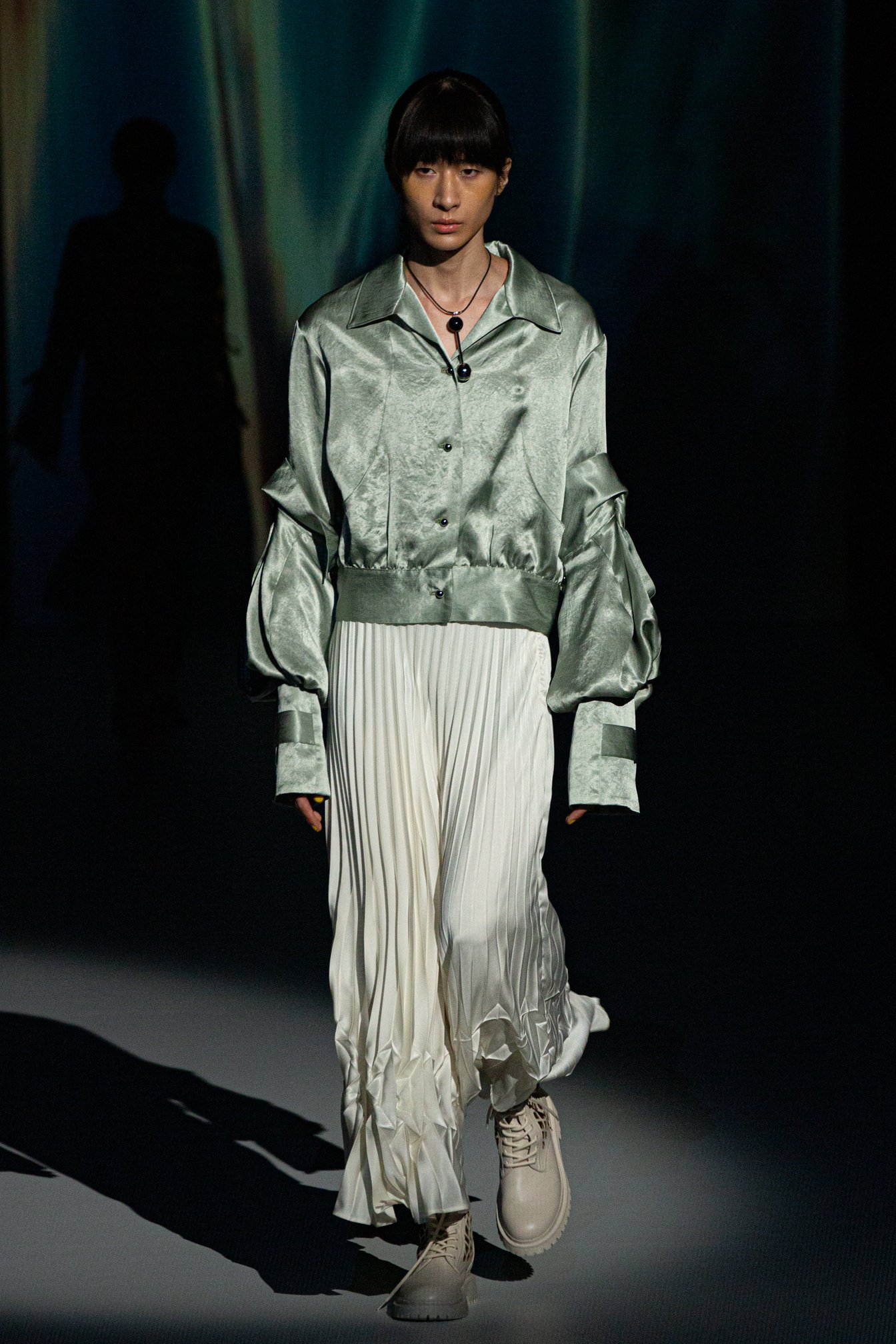 ファーストルックは男性モデルだった。イシヅカユウをはじめとする、男性として生まれながら女性のアイデンティティを持っているトランスジェンダーや、ノンバイナリーを公表しているモデル14人がランウェイを歩く。それらの事実だけでも、デザイナー進美影が手掛ける「ミカゲシン(MIKAGE SHIN)」が、「ジェンダーレスでユニセックス」という言葉に向き合っているとわかるだろう。「Rakuten Fashion Week TOKYO 2022 S/S」の初日である8月30日に発表された、ミカゲシンの2022年春夏コレクションテーマは「BUNRIHA」。コロナ禍直前の2019年にデビューしてから2年目を迎えた今季、立ち上げ当初から掲げる「ジェンダーニュートラル」というテーマに、分離派建築会のキーワード「都市と田園」「彫塑的なもの」を用いて改めて向き合ったコレクションとなった。