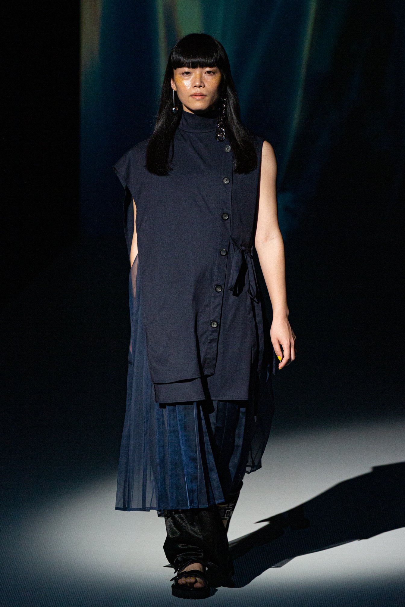 また、曲線や流動的なラインが特徴的なアイテムも数多く登場。アーチ状に穴の開いた衣服は、建築における窓の役割を彷彿とさせ、シアーな素材を用いてデザインされたレイヤードやプリーツは、彫刻的な近代建築を思わせる。