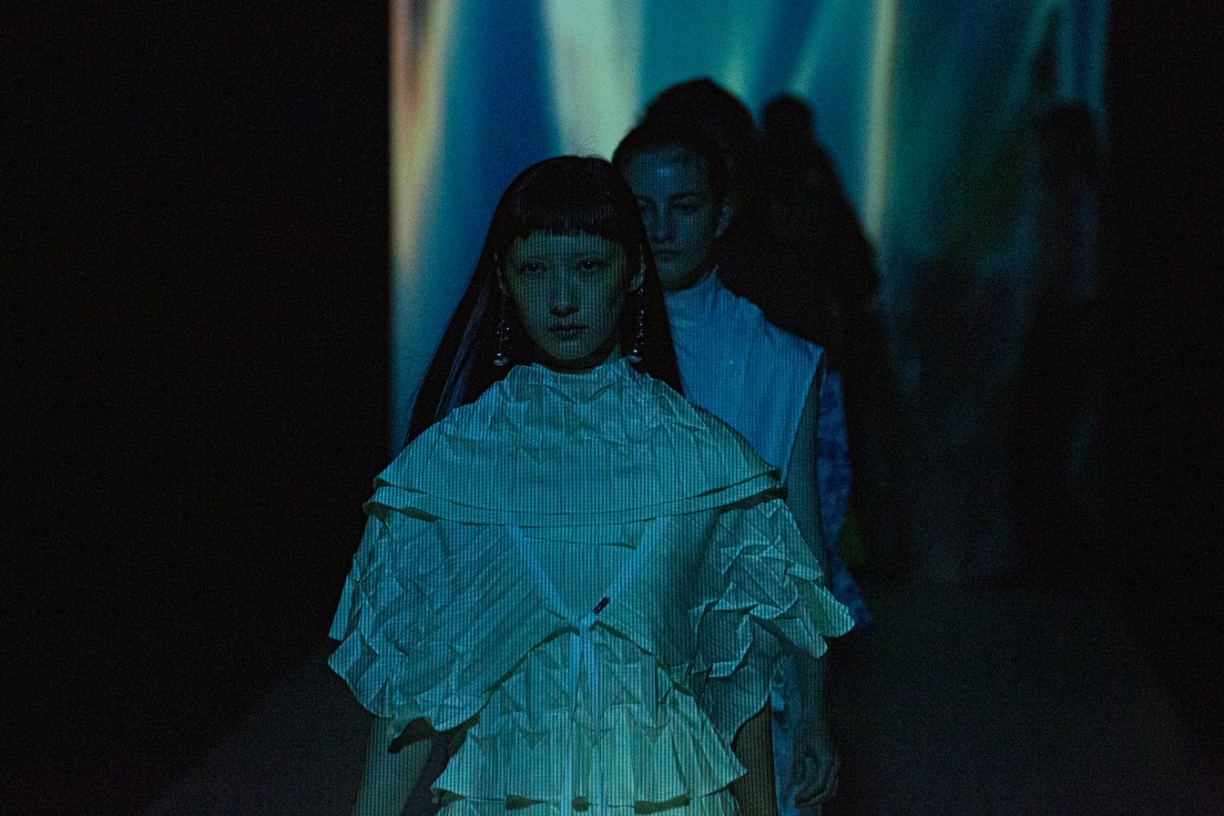 ショー全体を通して浮かび上がるのは、分離派建築の特徴でもある「都市と田園」の二律背反。薄暗い渋谷ヒカリエの会場には、光を受けて乱反射する水面のようなランウェイと巨大なモニターが出現し、小川のような会場をモデルたちが歩いた。