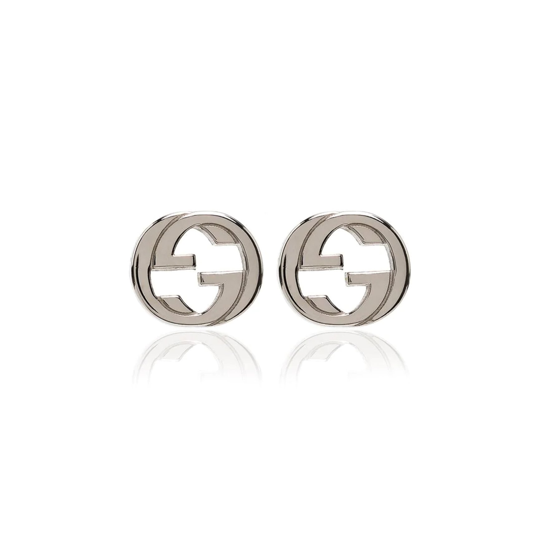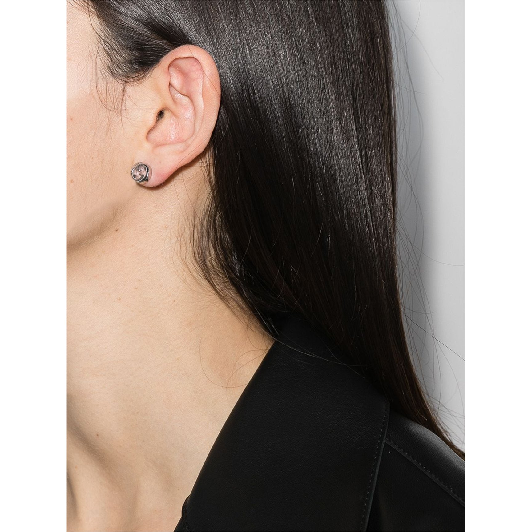 光沢のあるスターリングシルバー、ひと目でブランドがわかるミニピアスは「グッチ(GUCCI)」のもの。主張が強すぎず、さりげないサイズ感だからこそ、日常使いに最適です。