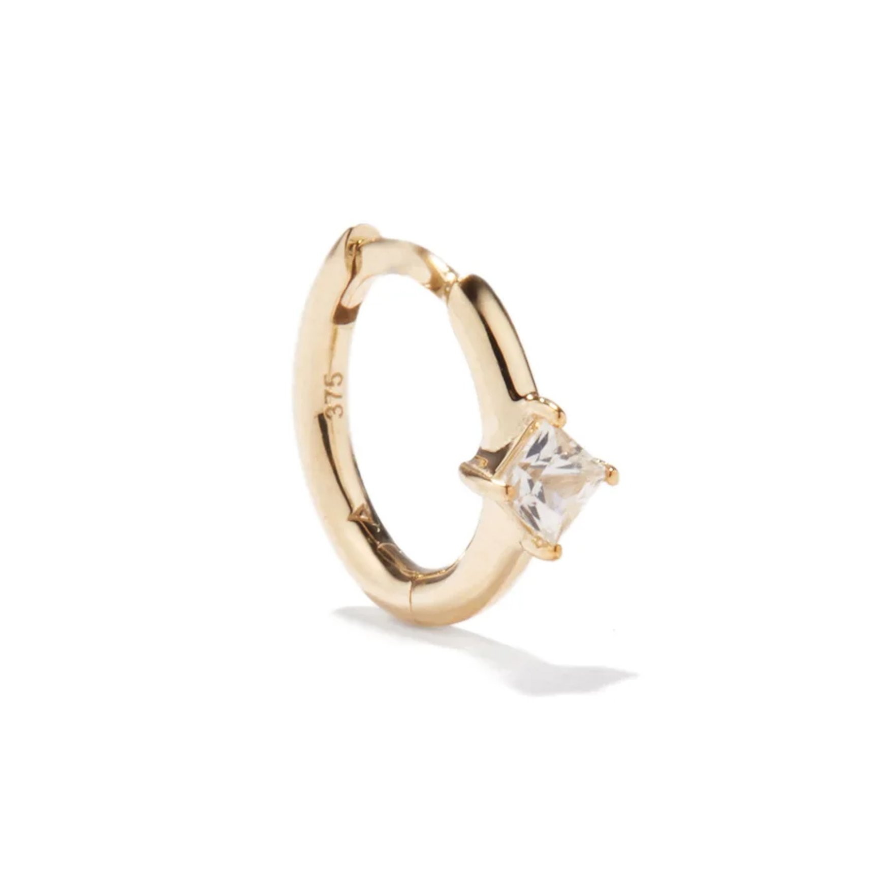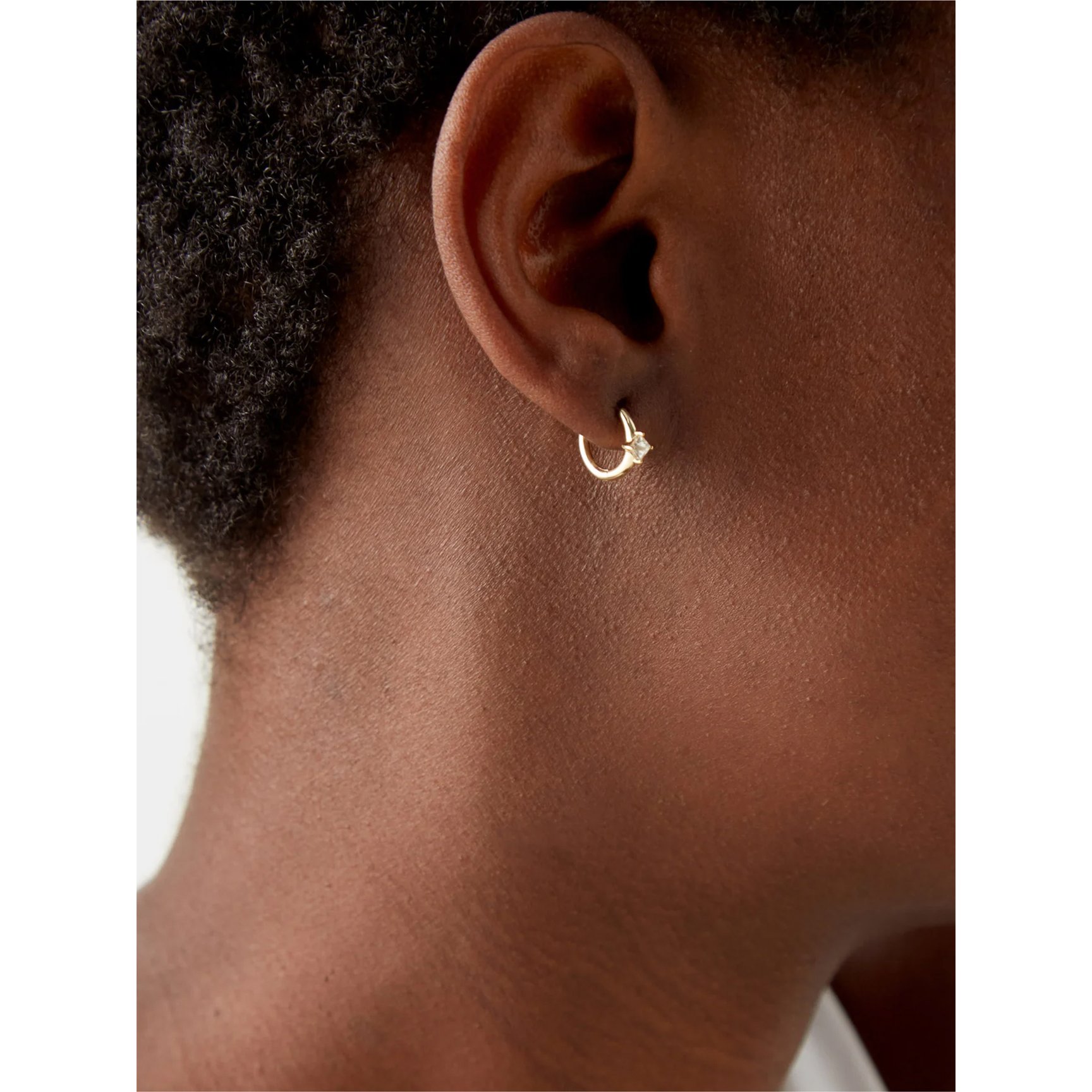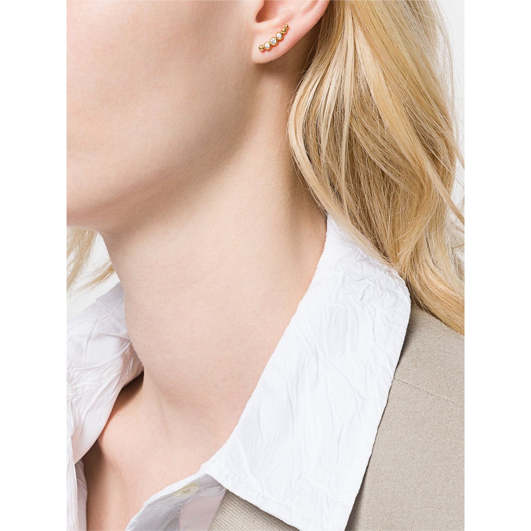 環境に配慮したブランドの哲学を反映し、リサイクルされた9kゴールドを使用したピアスは「オティウムバーグ(OTIUMBERG)」のもの。リングのようなデザインが特徴的で、リング部分にはホワイトサファイアが1粒セットされています。耳元でふと輝きを放つ、美しさ抜群のミニピアスです。