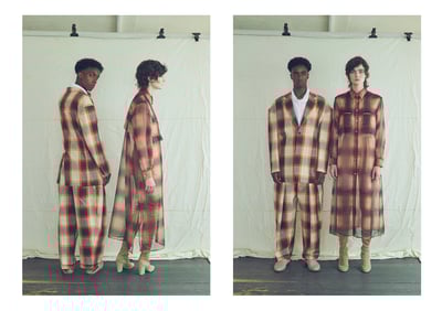 この時期はやはり袖口を開いて軽快さを演出。女性モデルと同様に、シアーな素材を忍ばせると爽やかで涼しげな印象に。中のロングシャツをガウンのように着ることで、コートとコートをレイヤードしたようなお洒落上級者コーデに仕上がります。ジャンプスーツと同様バックサテン素材なので秋冬は下にニットを着ても摩擦が起こらず、かつオーバーサイズの作りなのでインナーを着込んでも野暮ったくなりません。チェックのシャツはグリーンカラーも用意しているので、ワードローブにマッチする方を選んでみてください。