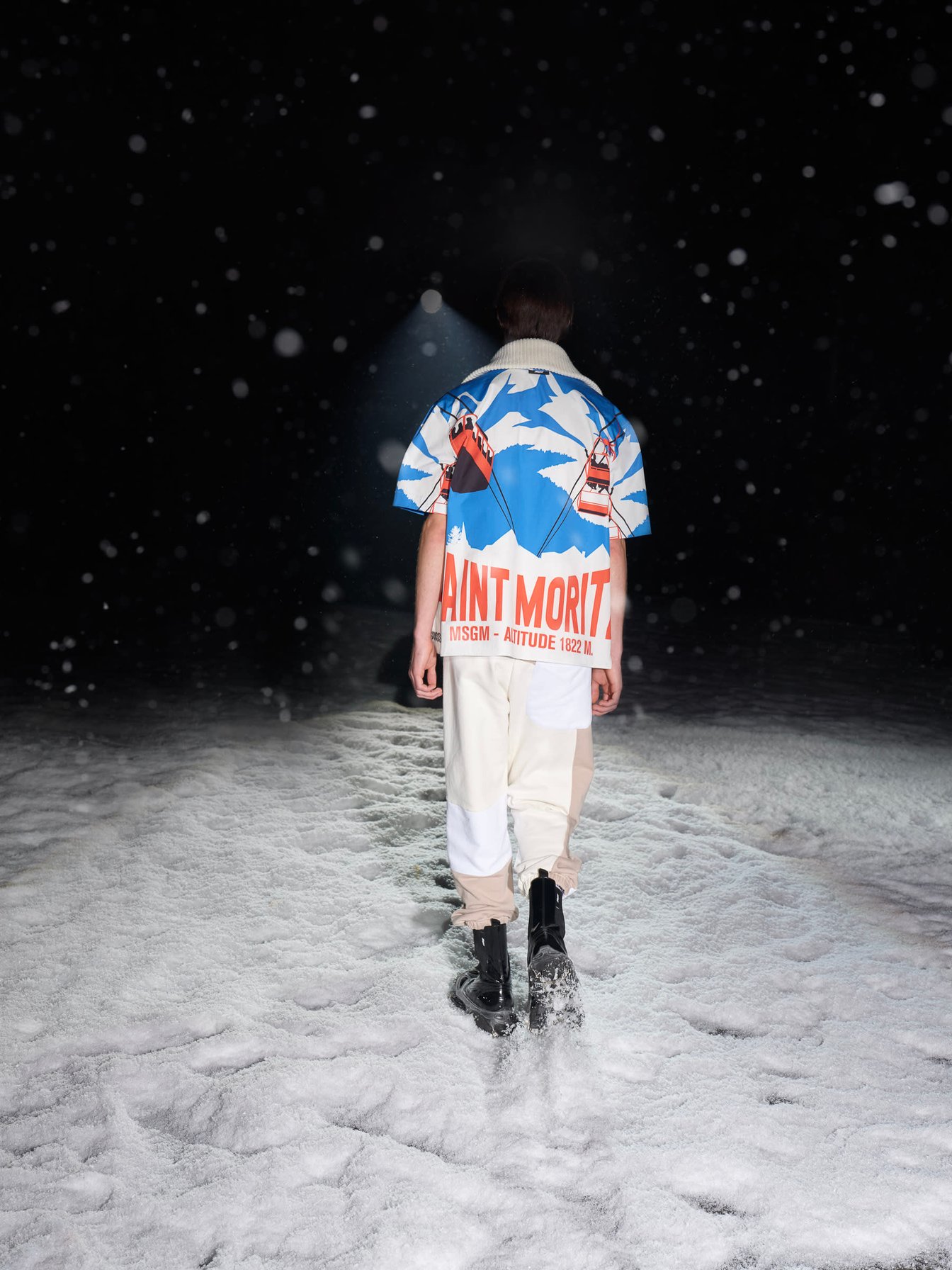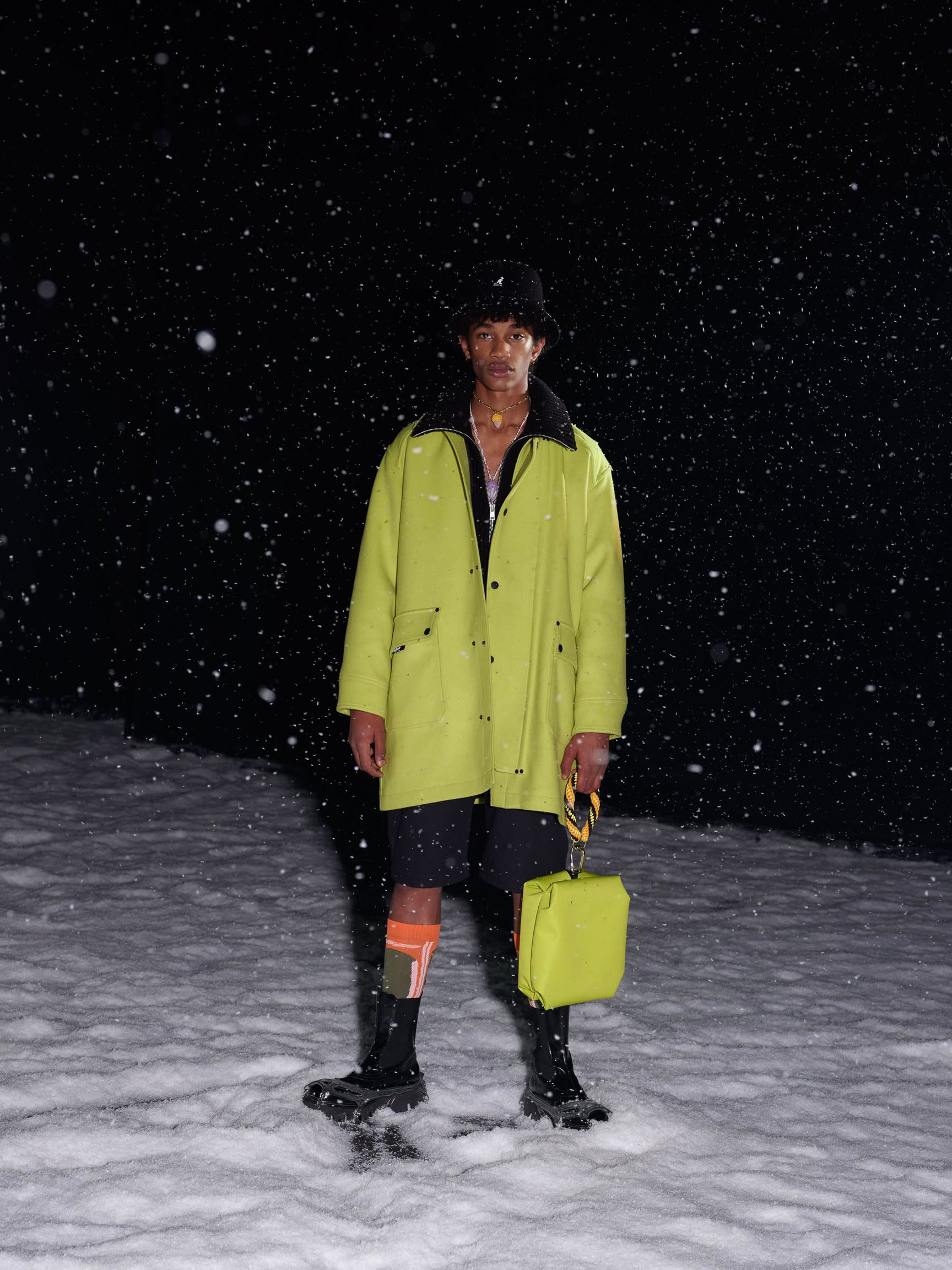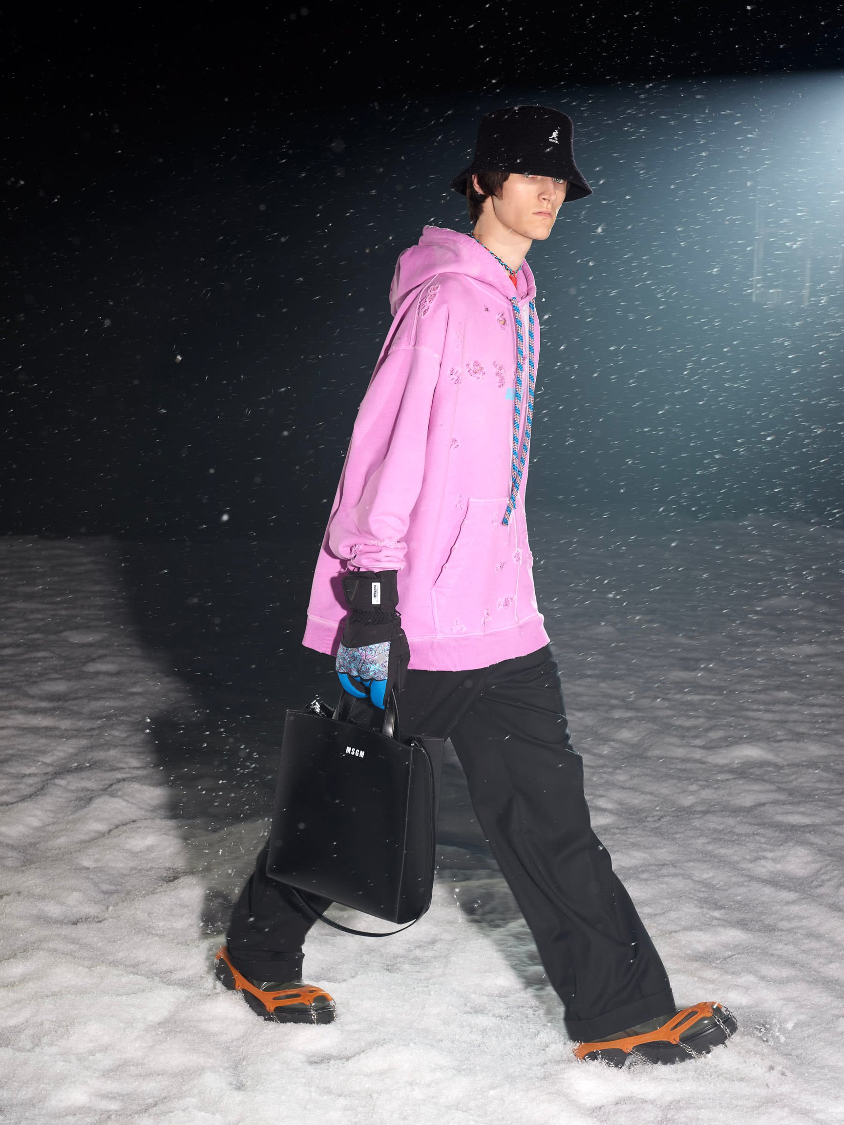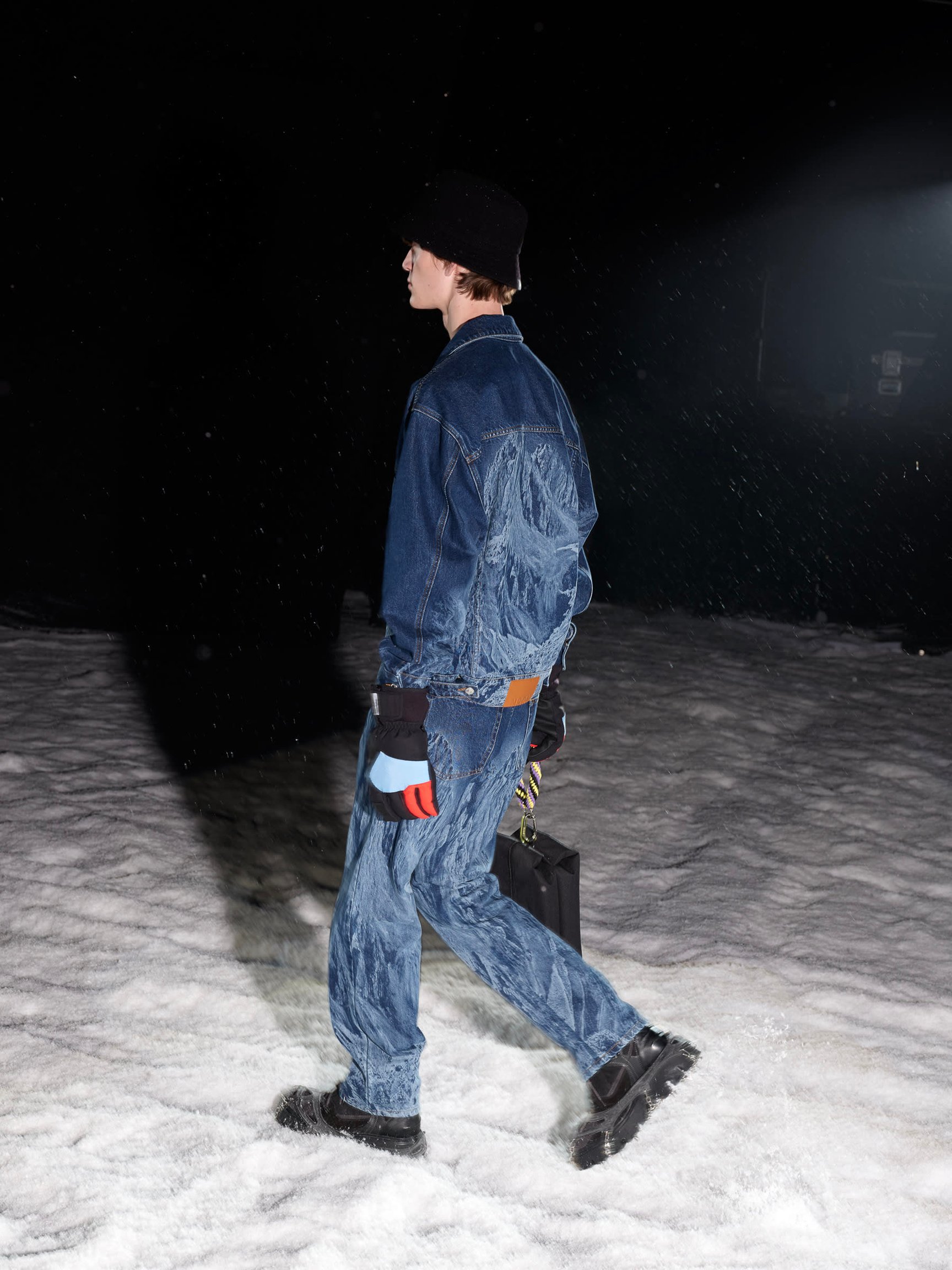旧き良き時代の登山を連想させるルックも目立つ。ツイードのジャケットとショートパンツのルック、ローゲージやケーブル編みのニットは、マッシモの言う「ヘリテージ?スローバック(旧き良き時代の物を見直す事)」なアイテム。ホワイトのB-3を軸とした"冬の白"のスタイリング、氷山に閉じ込めて凍ったような加工を施したデニムのセットアップ、シャモニーやサンモリッツなどの1930年代のスキーリゾートの風景をプリントしたアウターなどは、マッシモらしい遊び心に満ち溢れている。音楽と連動した90年代のレイブカルチャー的なカラフルな色使いも目立つ。やや異質に思える「カンゴール(KANGOL)」とコラボしたバケットハットも、その流れを汲んでいるのだろう。