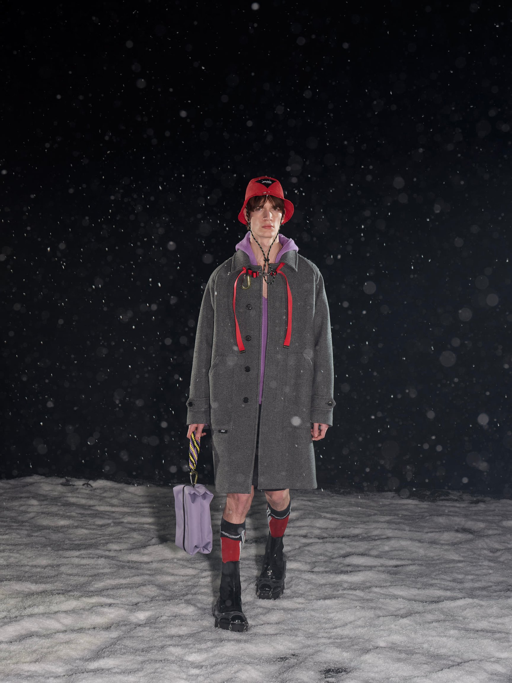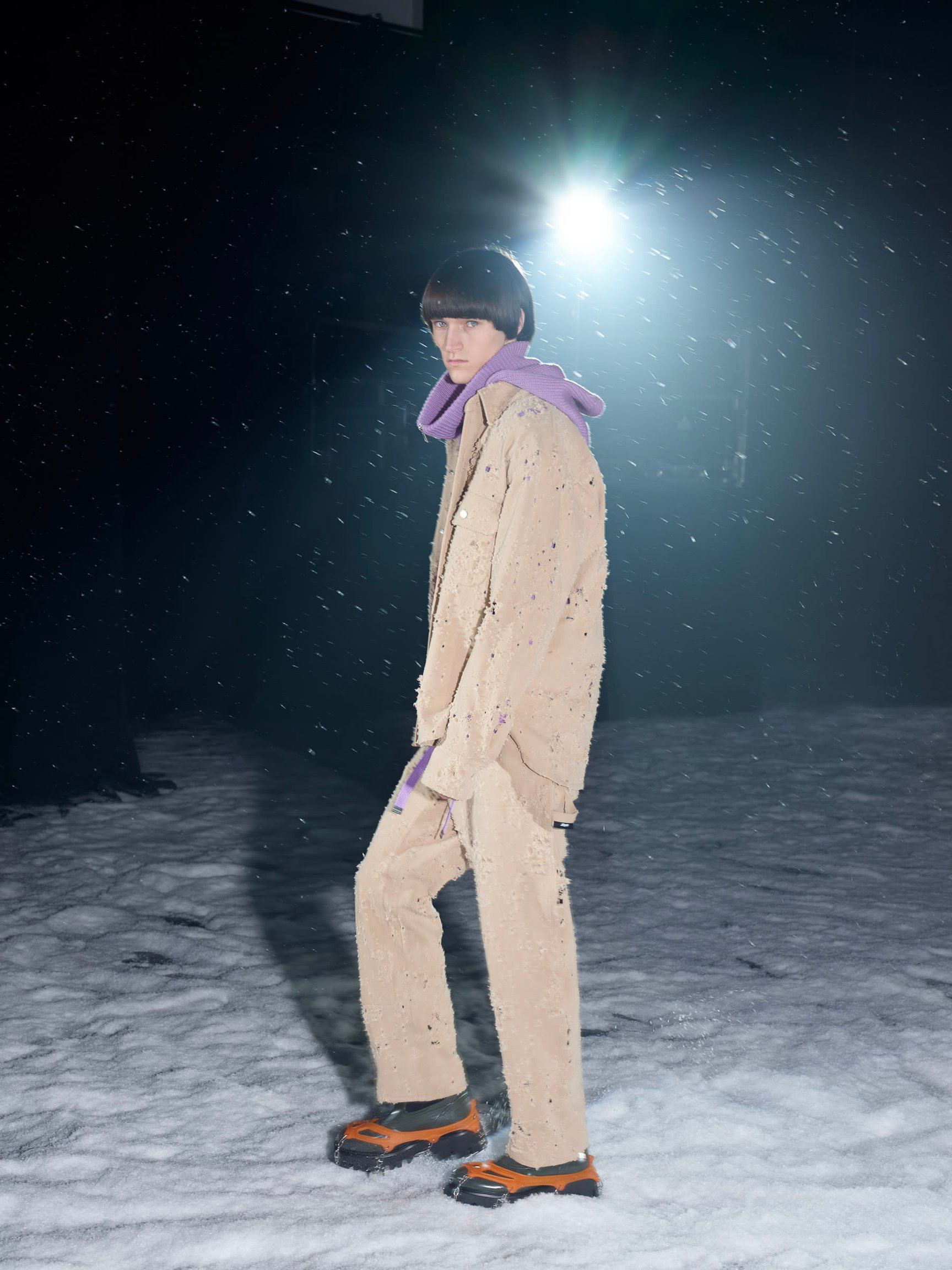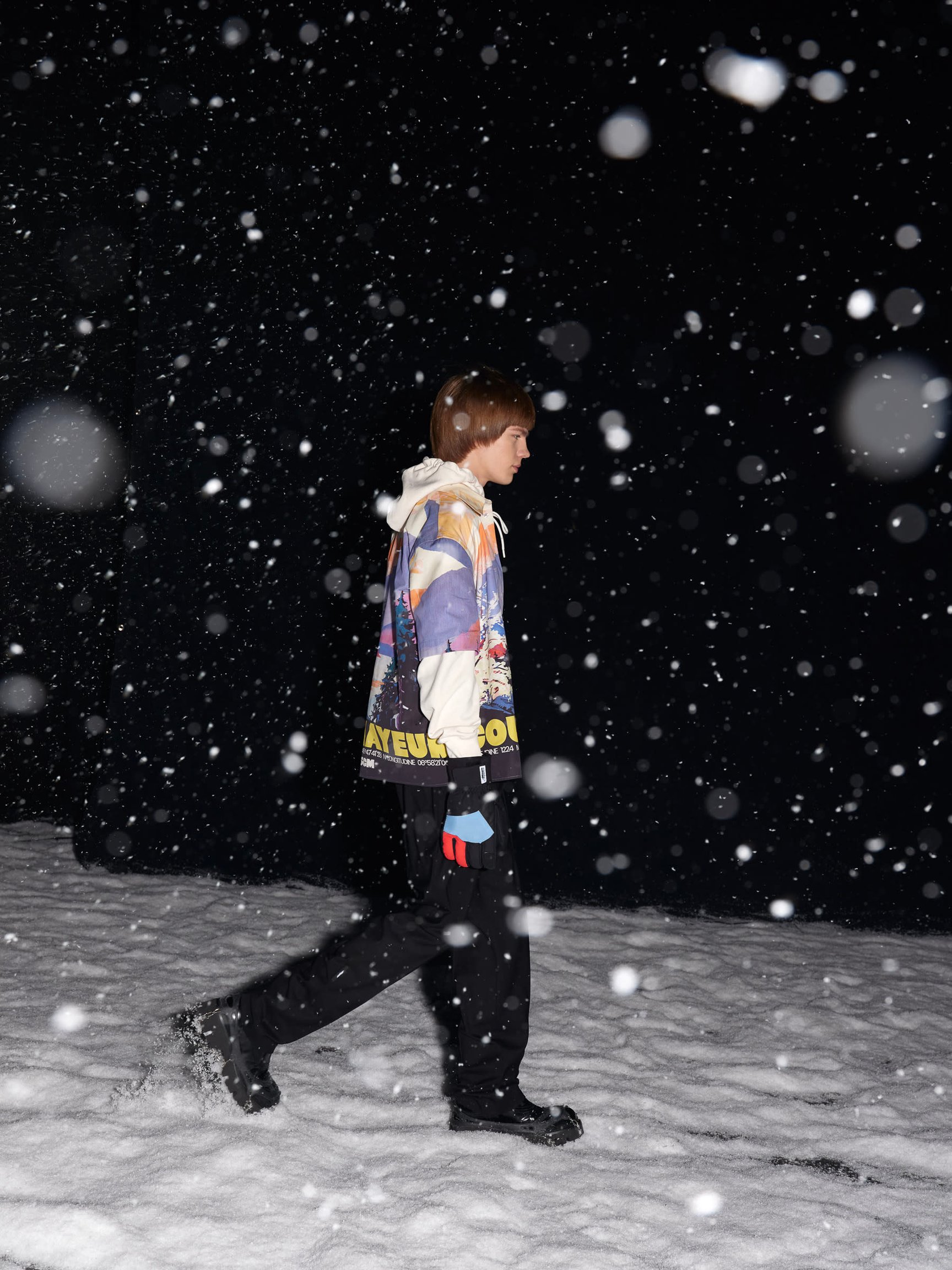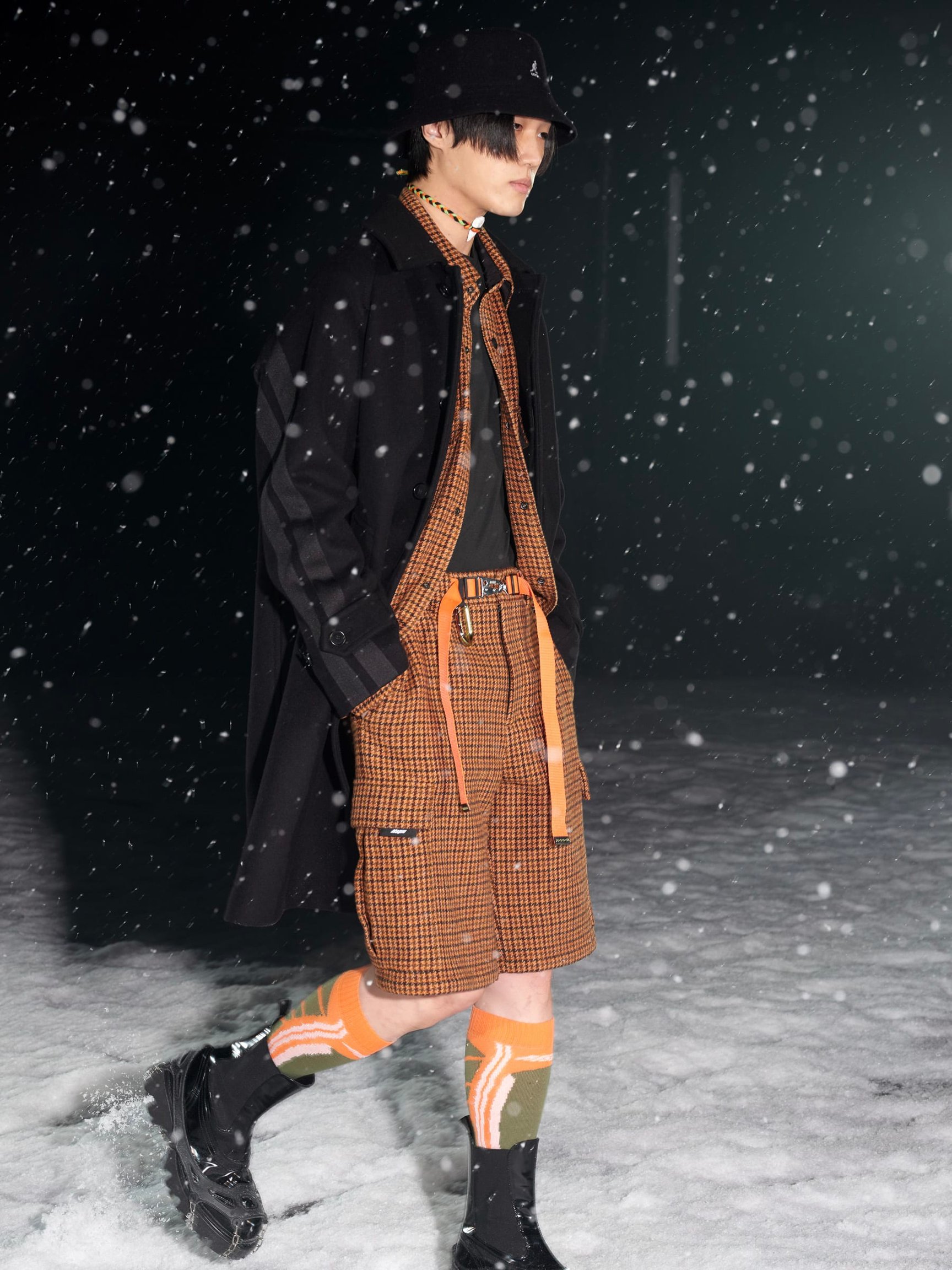 旧き良き時代の登山を連想させるルックも目立つ。ツイードのジャケットとショートパンツのルック、ローゲージやケーブル編みのニットは、マッシモの言う「ヘリテージ?スローバック(旧き良き時代の物を見直す事)」なアイテム。ホワイトのB-3を軸とした"冬の白"のスタイリング、氷山に閉じ込めて凍ったような加工を施したデニムのセットアップ、シャモニーやサンモリッツなどの1930年代のスキーリゾートの風景をプリントしたアウターなどは、マッシモらしい遊び心に満ち溢れている。音楽と連動した90年代のレイブカルチャー的なカラフルな色使いも目立つ。やや異質に思える「カンゴール(KANGOL)」とコラボしたバケットハットも、その流れを汲んでいるのだろう。