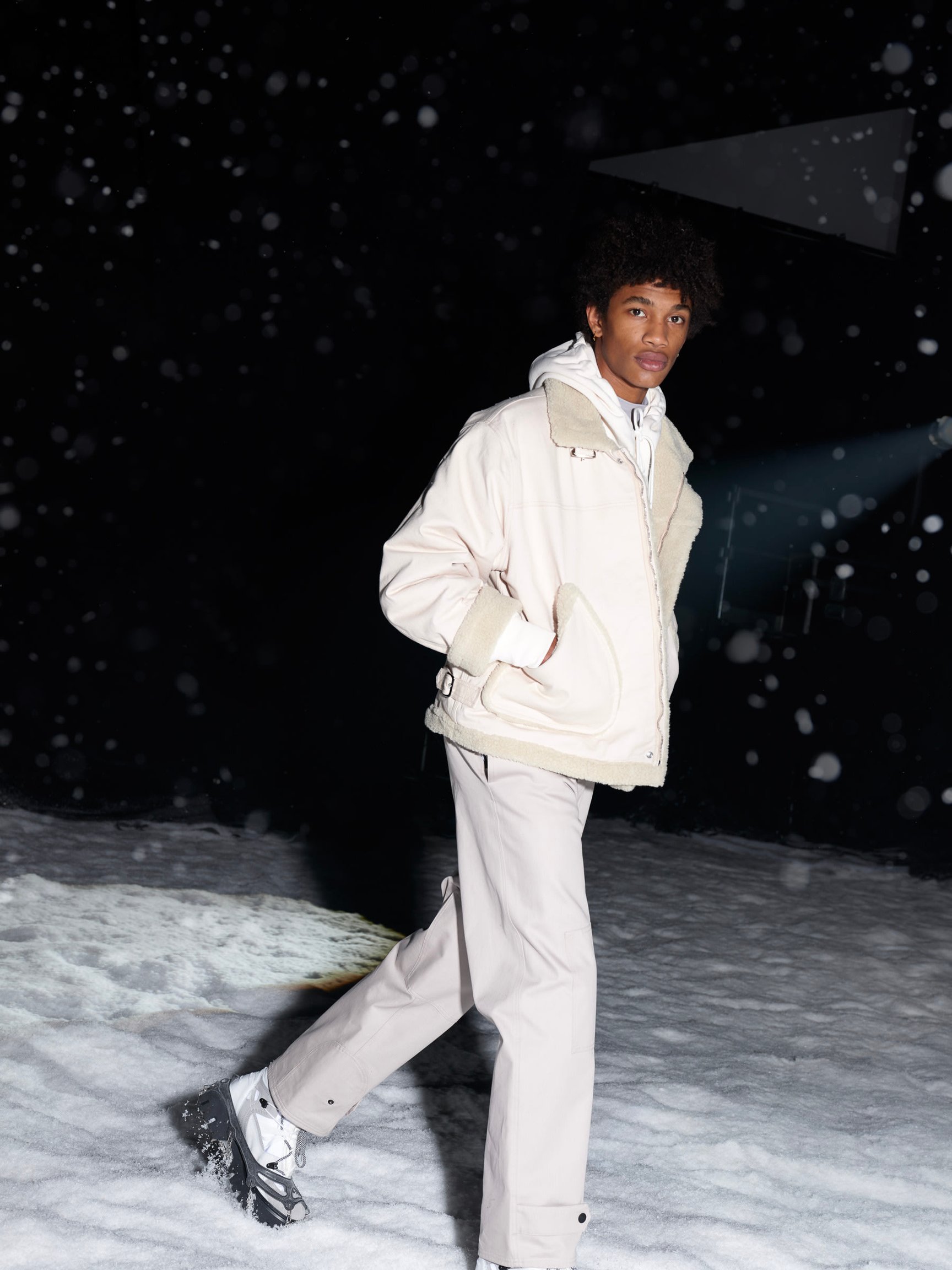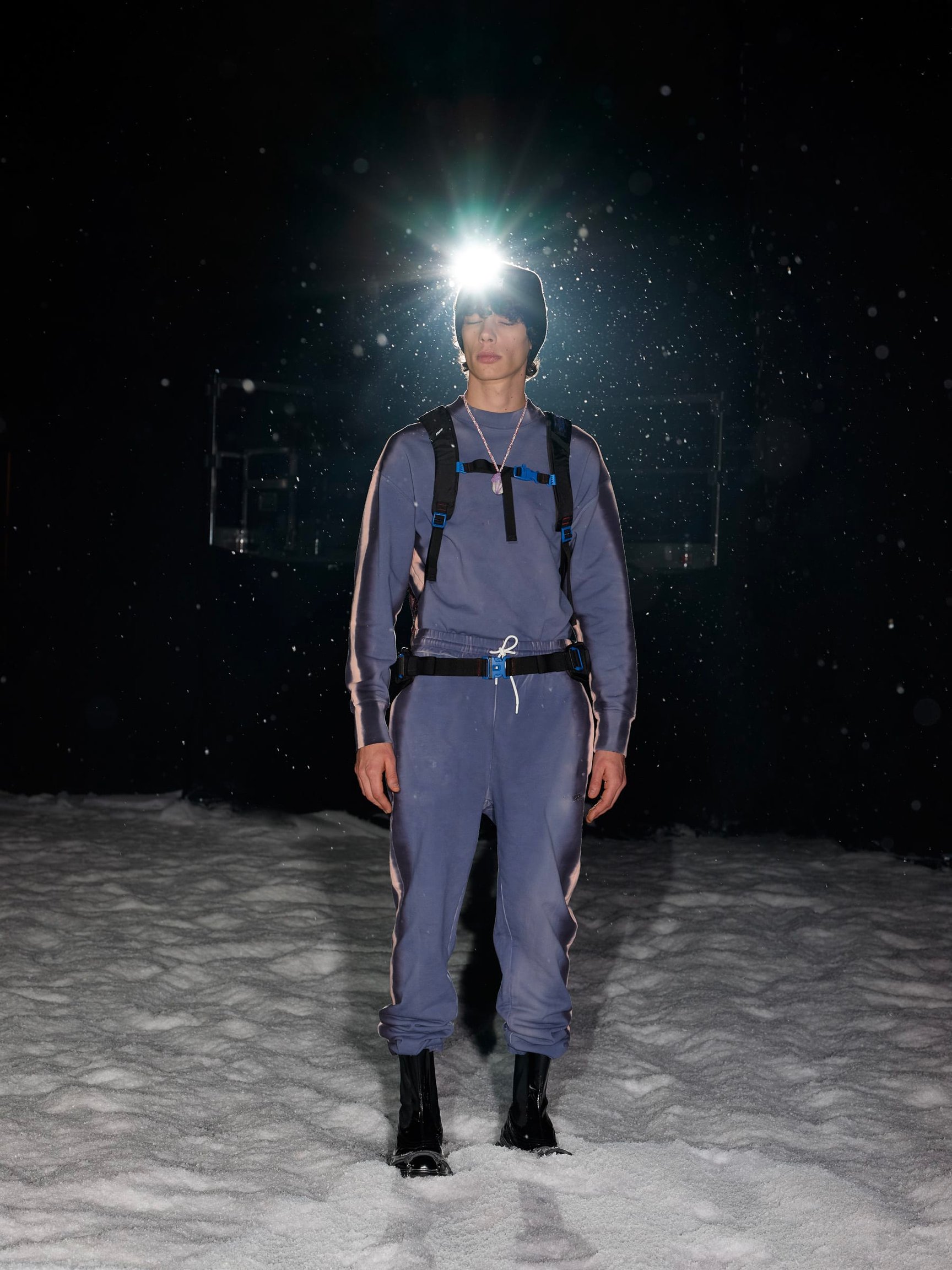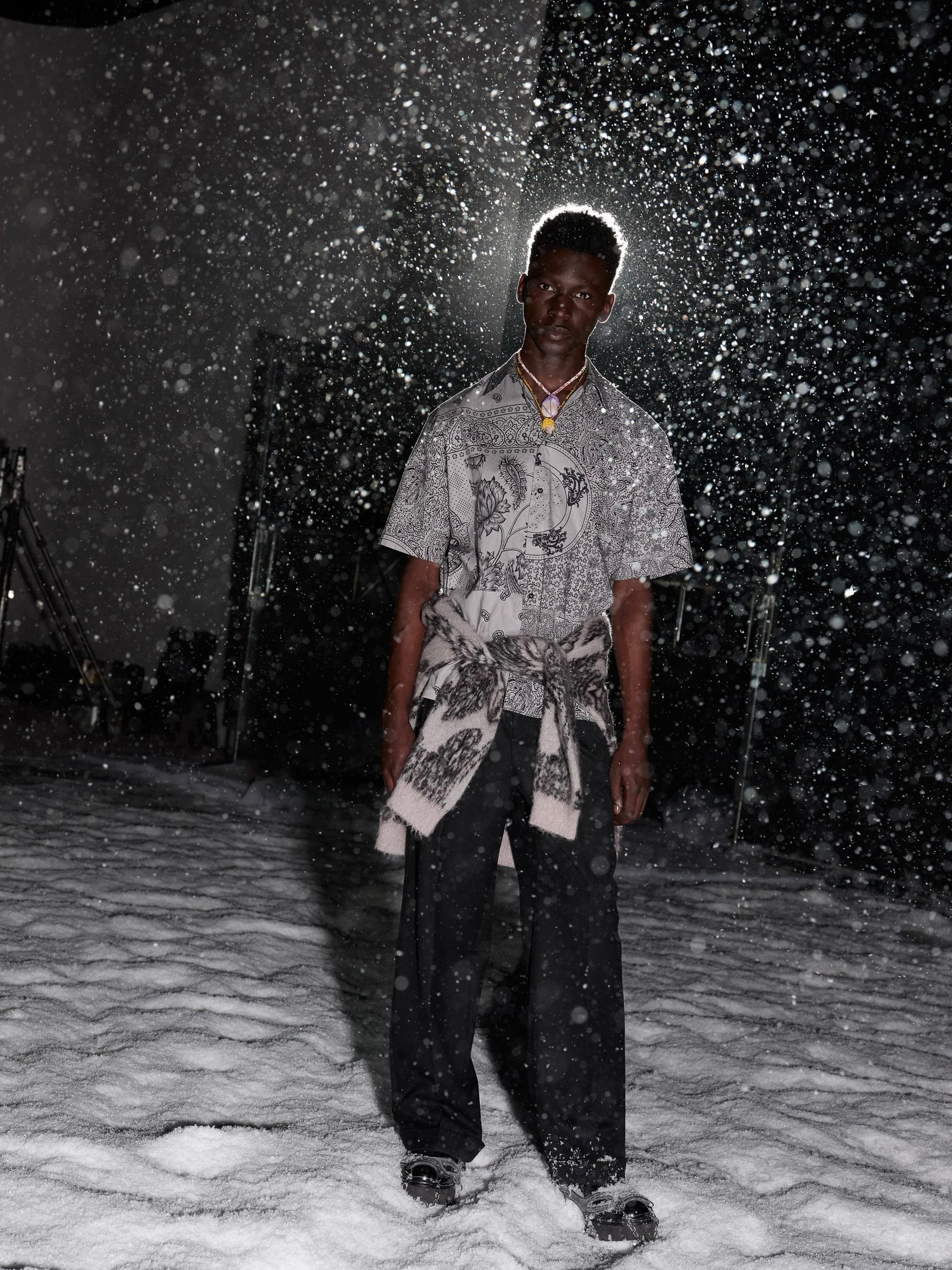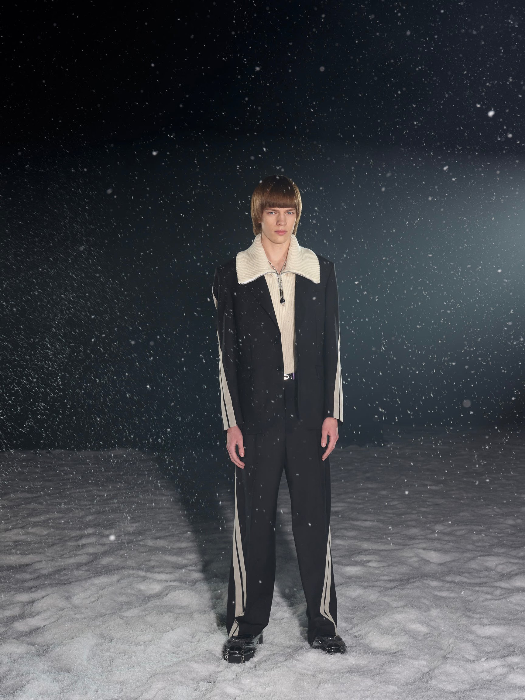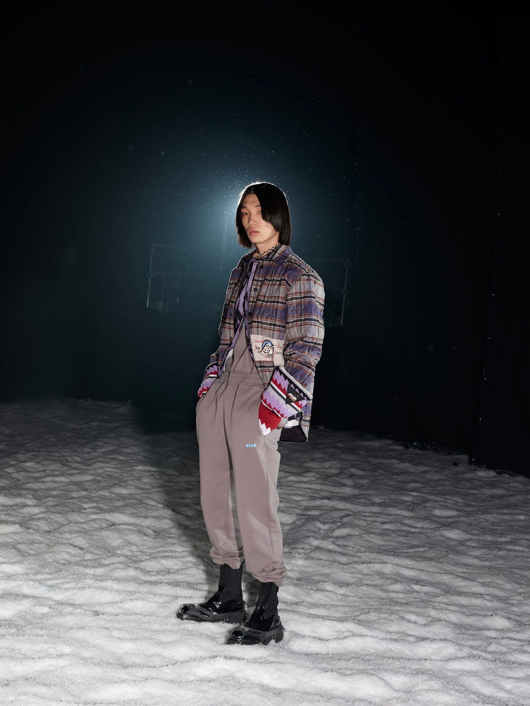 Nico Vascellari(ニコ?ヴァシェラーリ)とNinos Du Brasil(ニノス?ドゥ?ブラジル)が手掛けたテクノミュージックに合わせて、人工雪が吹雪くランウエイをモデルたちが足早に闊歩する。暗闇の中を駆け抜ける演出だから、いつものような底抜けの明るさはないけれど、重苦しい雰囲気というわけでもない。でも、2021-22年秋冬の「MSGM」のコレクションは、想像以上に深い思考から生み出されているのだ。