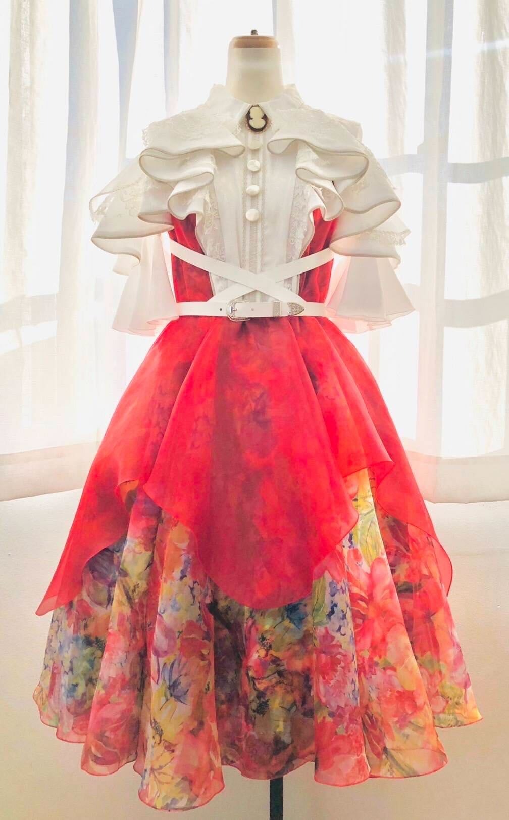 後半戦の「カラフル特別企画 ~明日への勇気をくれる歌~」では、劇場版「鬼滅の刃 無限列車編」の主題歌「炎」を披露。黒と赤のコントラストが美しいドレスは、デザイナーの城間志保さんとディレクターの西家康隆さんが手掛ける「シロマ(SHIROMA)」がデザインしたもの。テキスタイルから制作し、オーガンジーとハードチュールをミックスしたフリルパーツが約1000個施されています。黒の素材はサテン生地にフロッキー加工を施したもので、素材にあしらわれたグラフィックもシロマが制作しています。