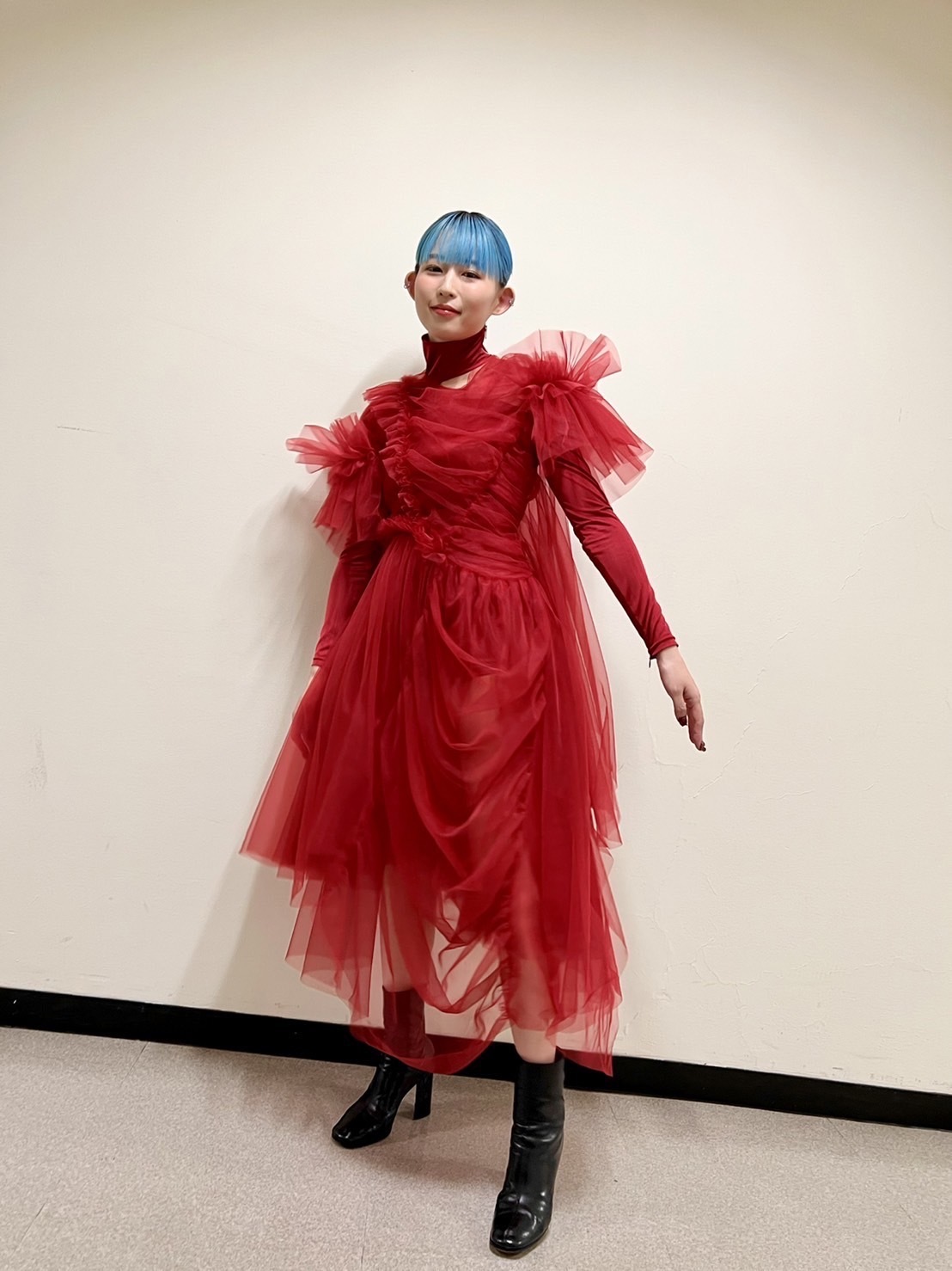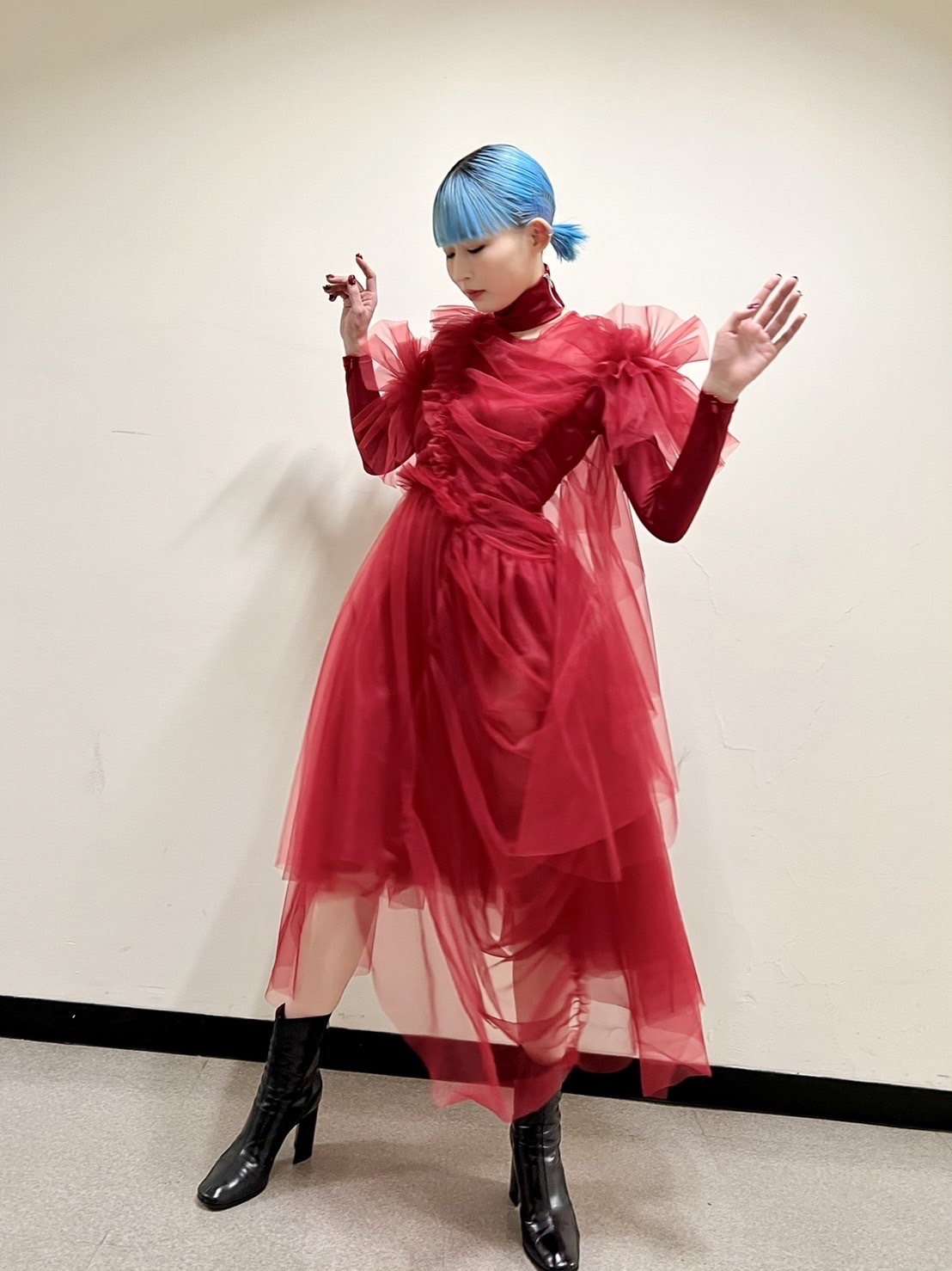 「Awesome City Club」が今年大ヒットした「勿忘」を披露。PORINさんは「ケイスケヨシダ」デザイナー 吉田圭佑さんが手掛けたドレスを着用しました。真っ赤なチュールを用いた華やかなデザインに。