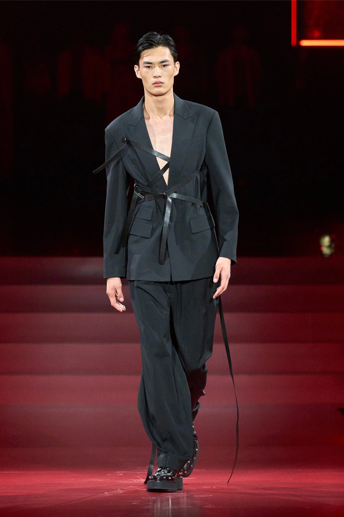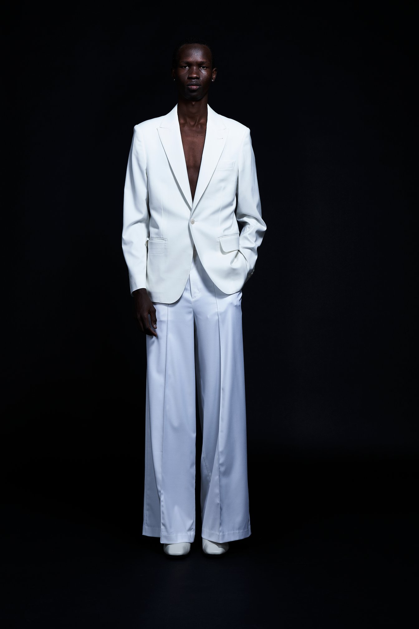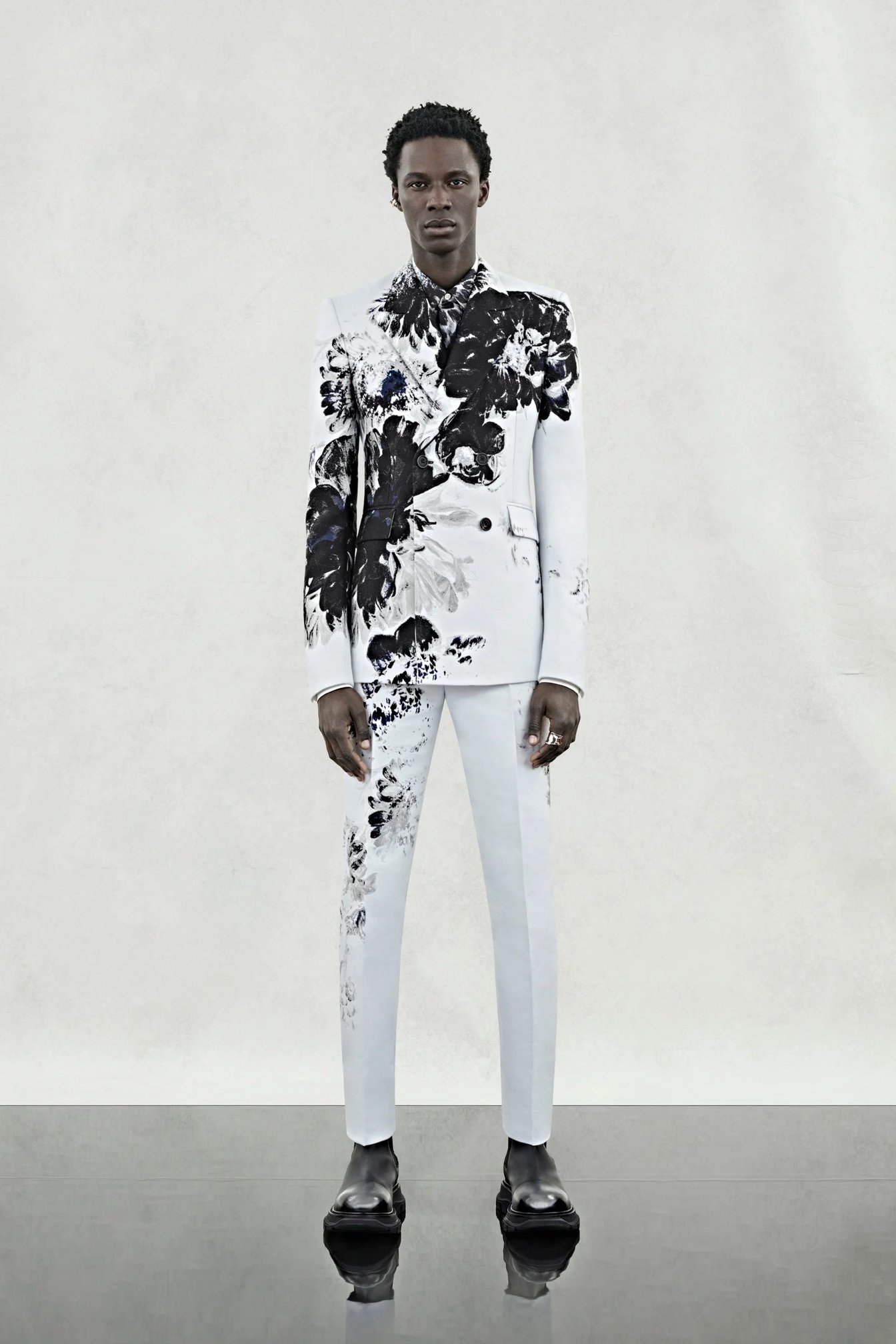 白組のトリを務めた福山雅治さんは、「アレキサンダー?マックイーン(Alexander McQueen)」の2024年春夏メンズコレクションのセットアップを着用。タイトなホワイトのスーツに墨絵のような花のデザインが大胆にあしらわれています。