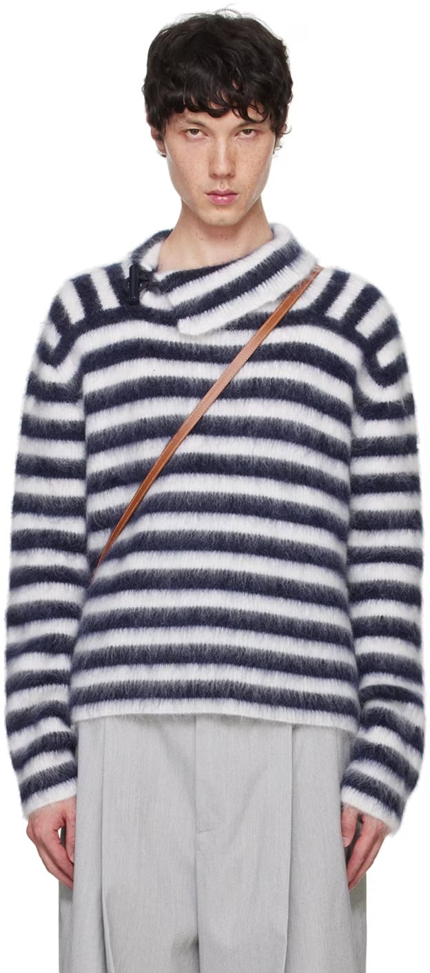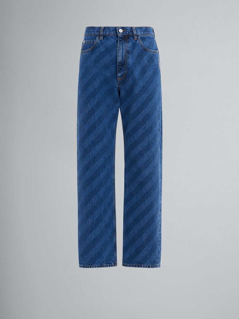 岸優太さんは「マルニ(MARNI)」のベージュ ボクシーデニムシャツとブルー ワイドレッグジーンズを着用。斜めストライプ柄で揃えました。