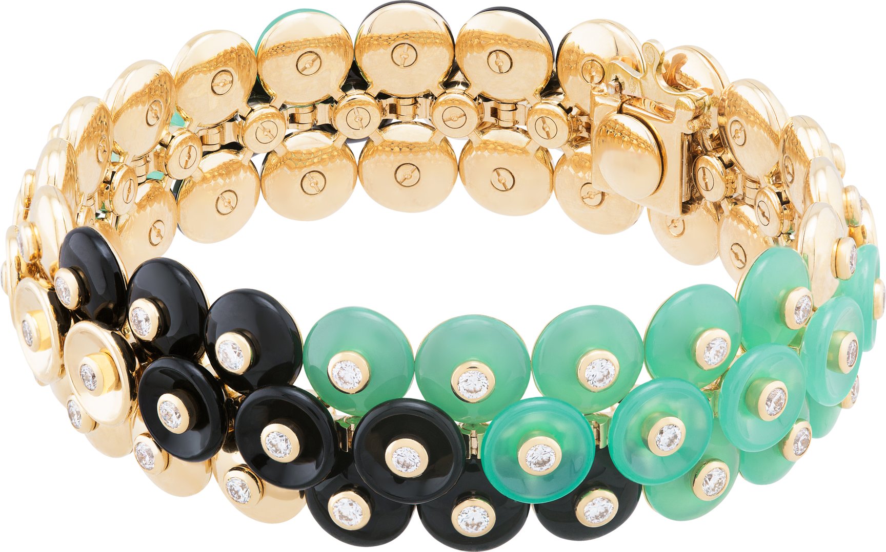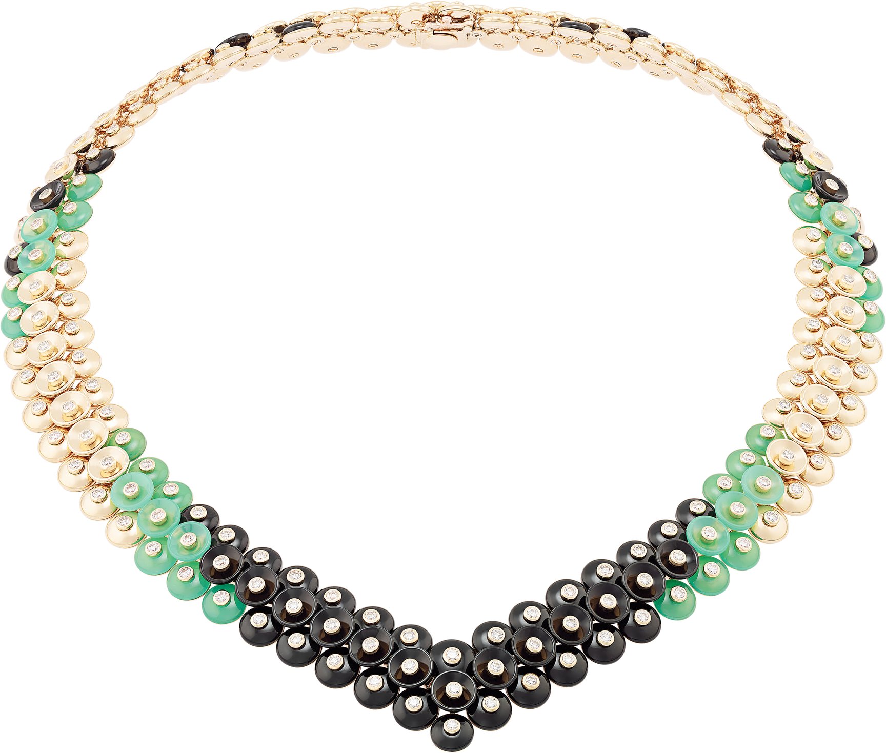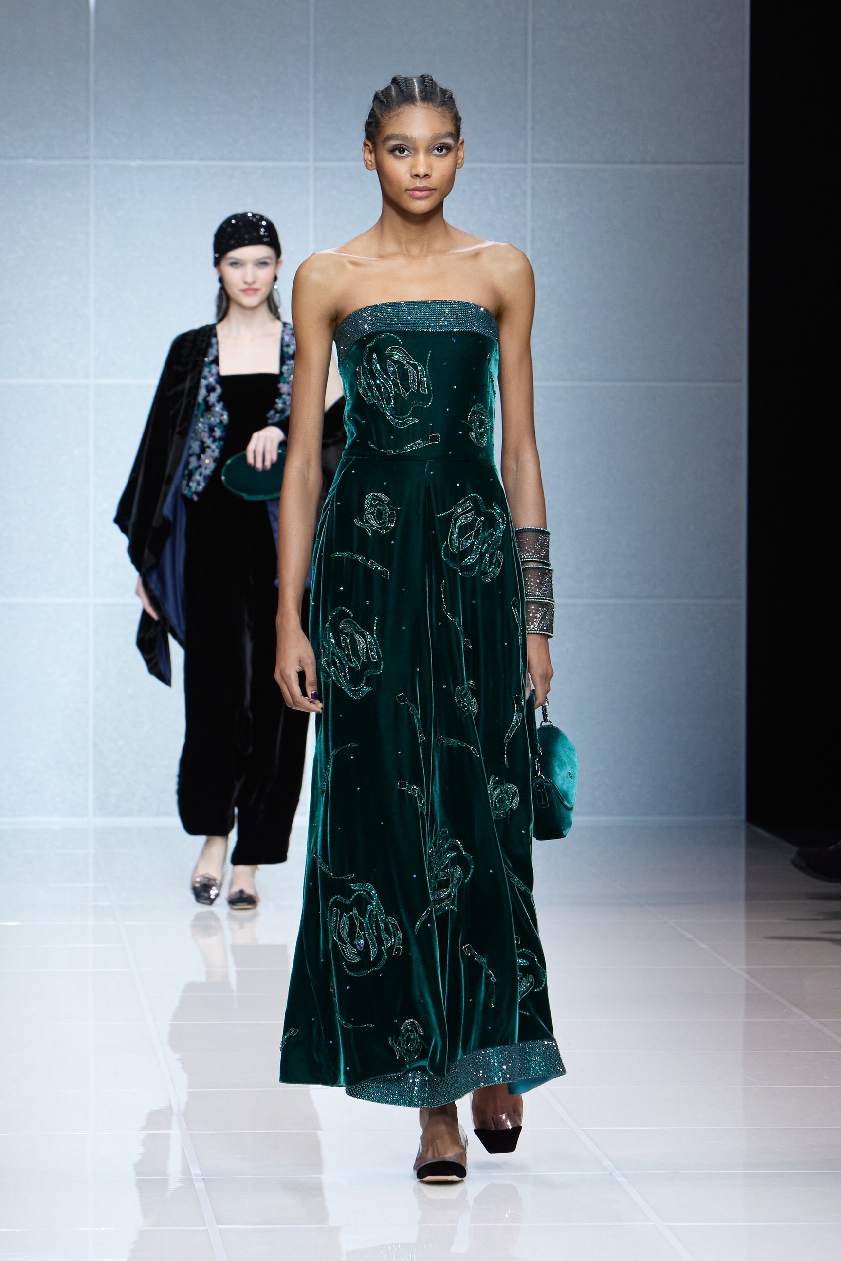 橋本さんは番組の終盤に、「ジョルジオ アルマーニ(GIORGIO ARMANI)」の2024年秋冬コレクションのロングドレスに衣装チェンジ。艶感のあるグリーンベルベッドの生地にビジューが映えます。ジュエリーは、ヴァン クリーフ&アーペルのブトン ドール コレクション × ペルレ コレクションのネックレスとブレスレット、イヤリングに。ドレスに合わせて、ジュエリーにもグリーンを取り入れました。