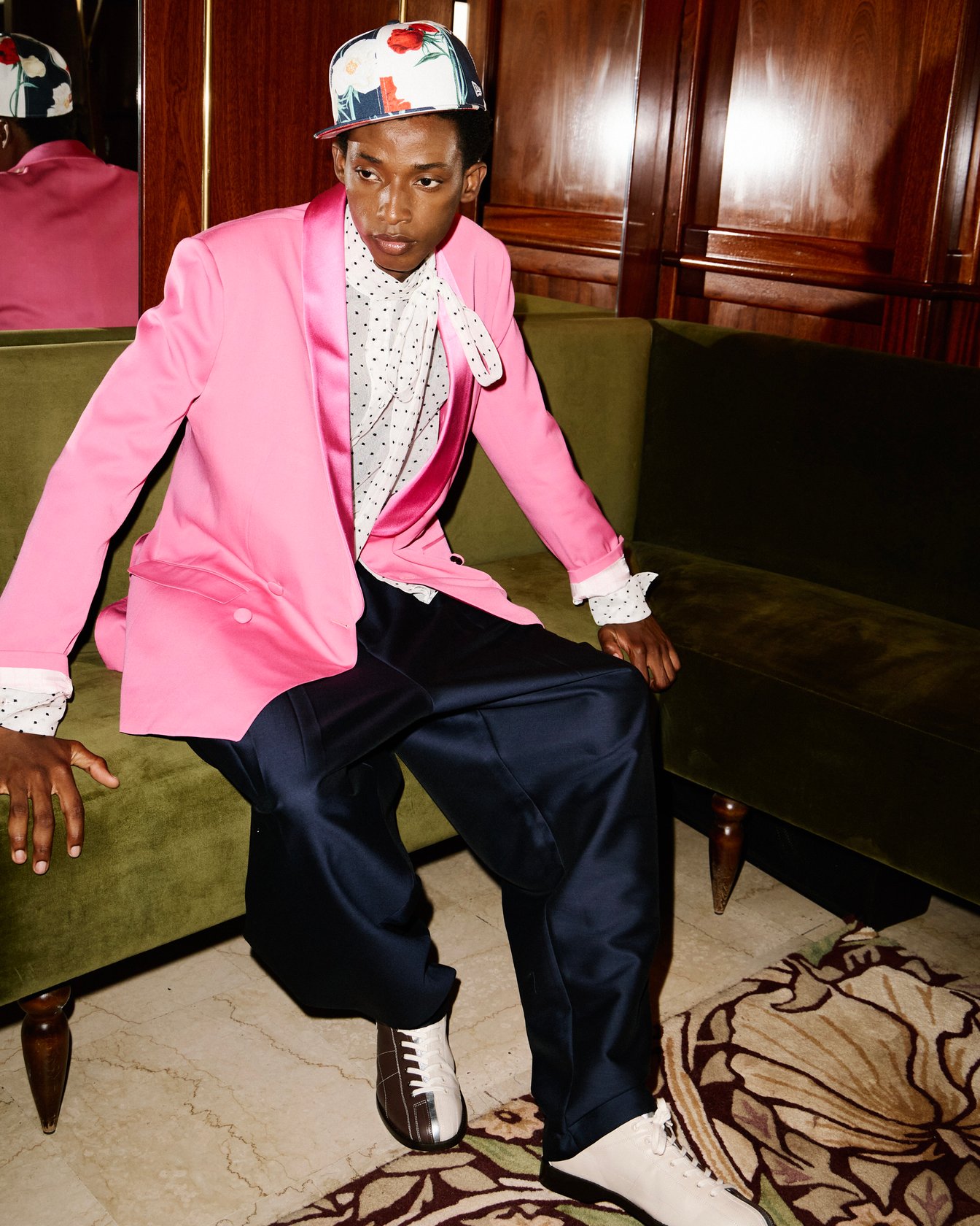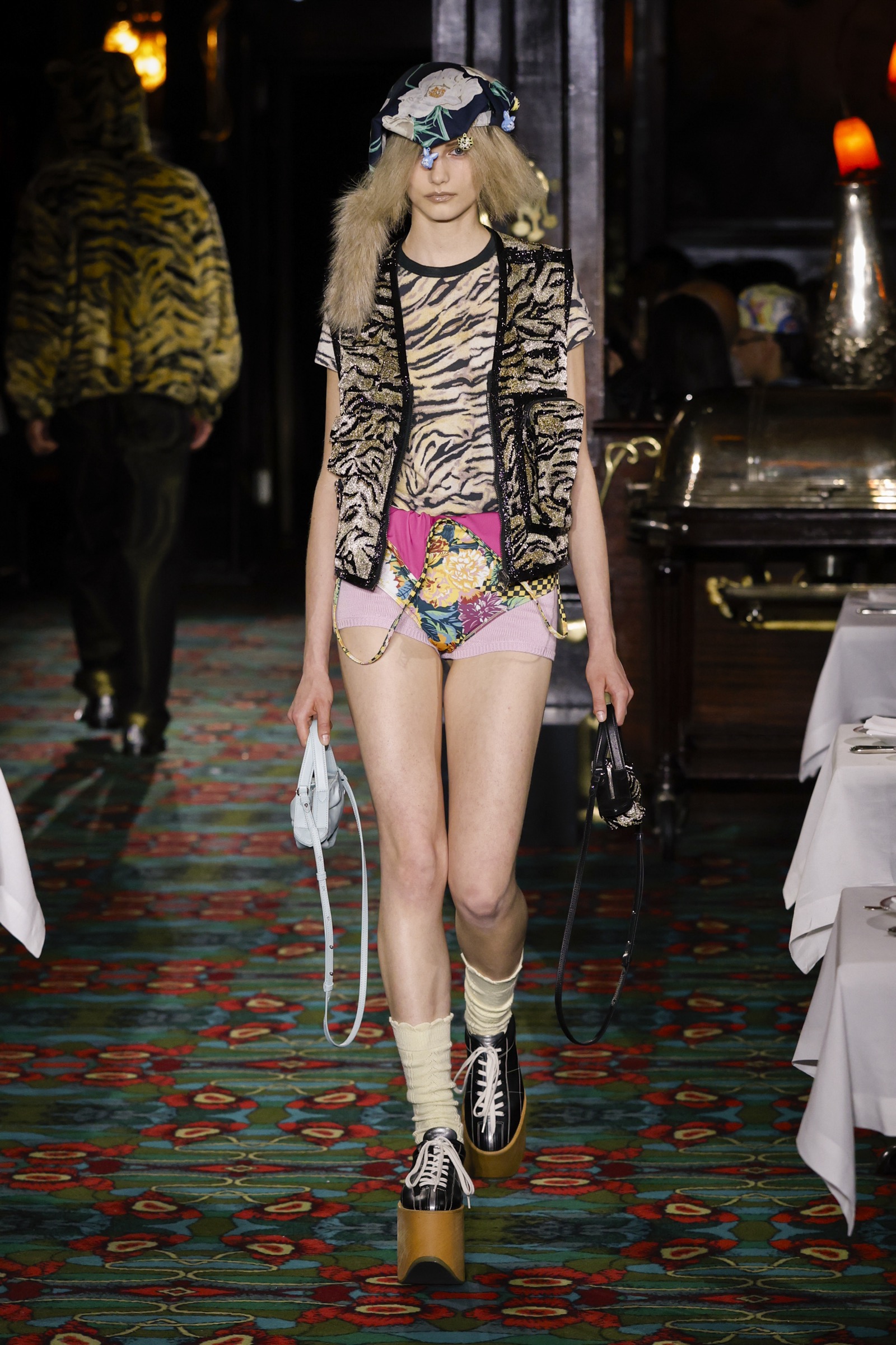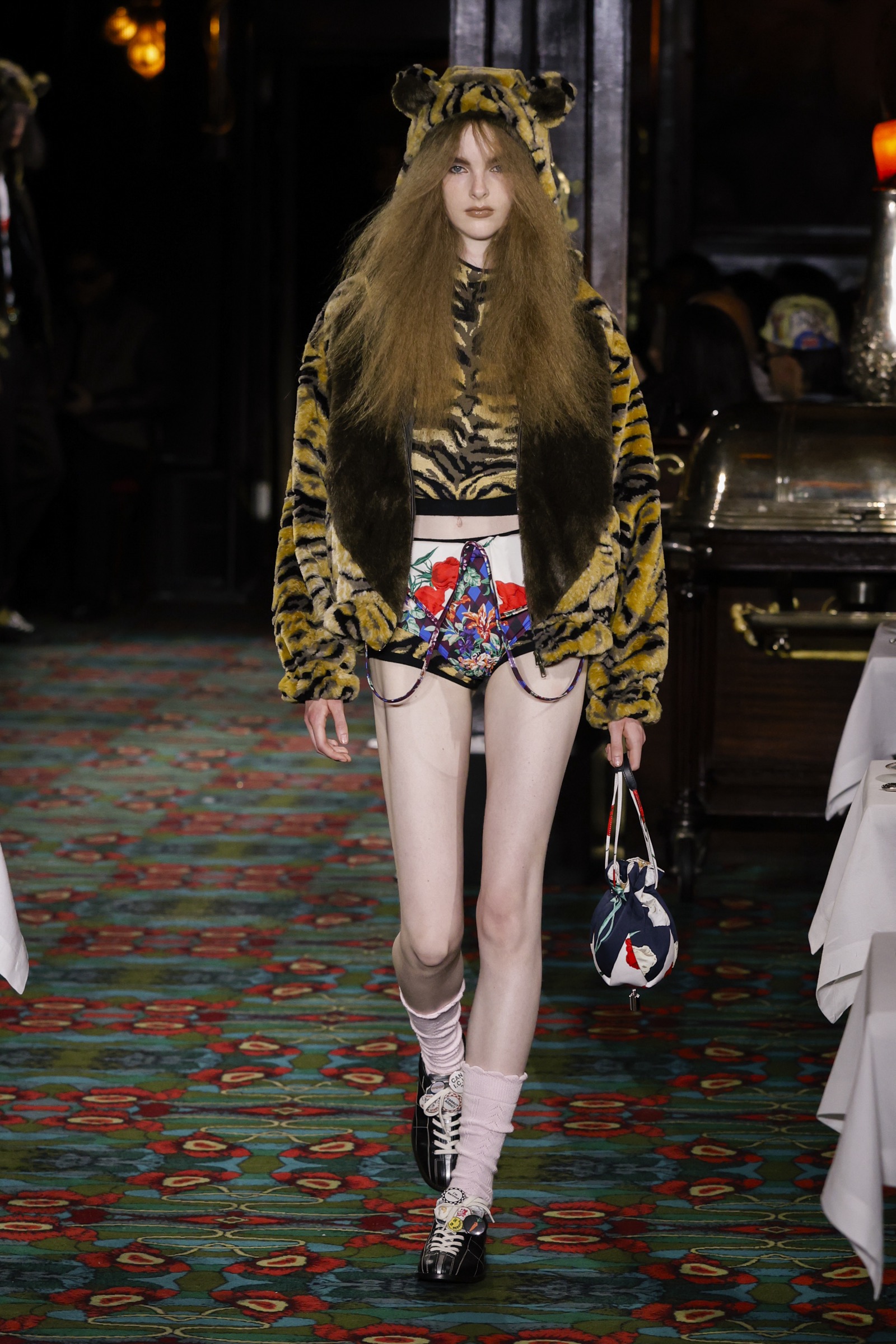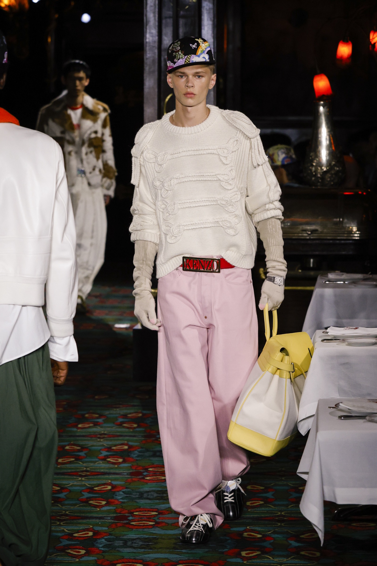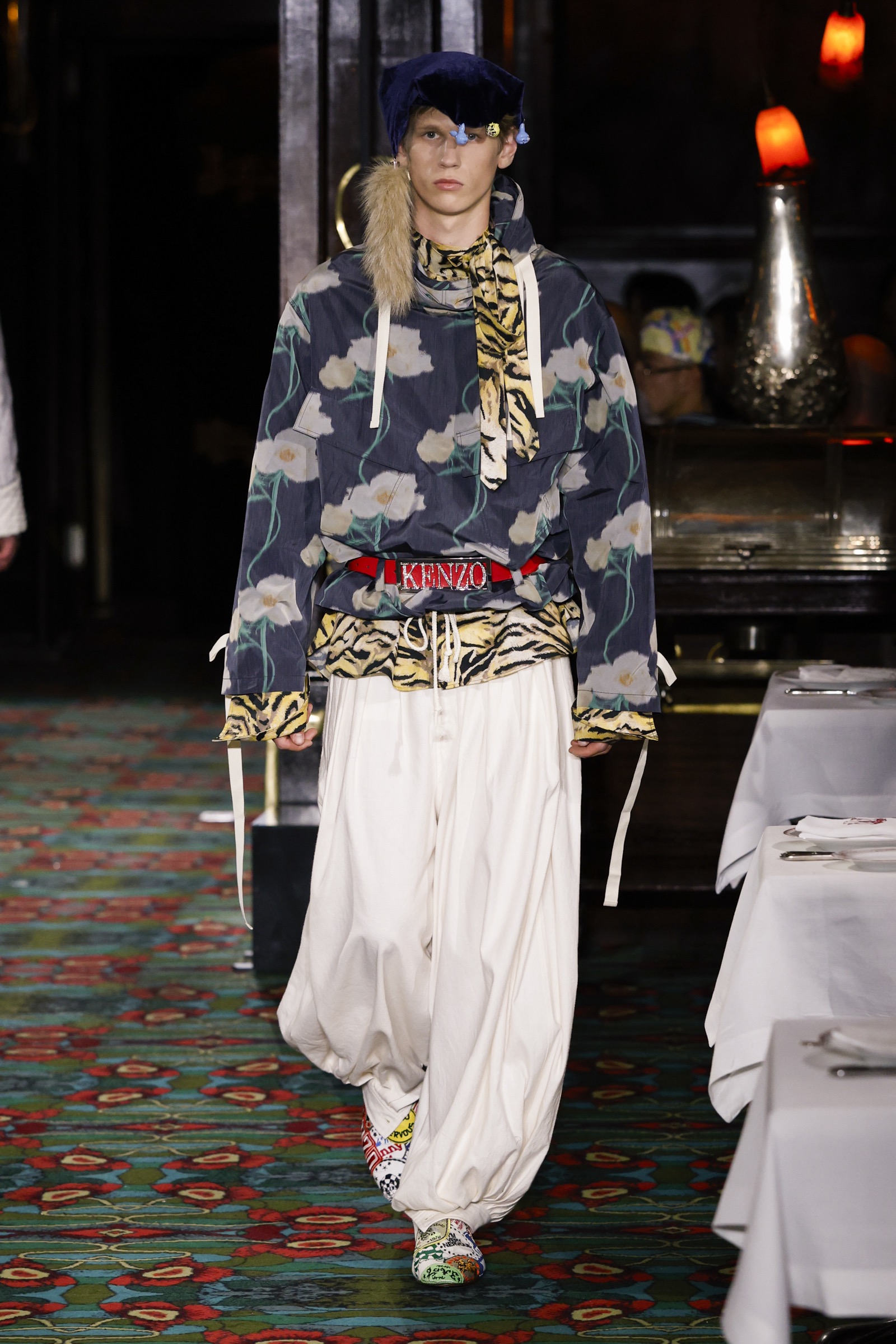 創業者の髙田賢三が着用していたシャフシャツにはバラのプリントが施され、プラットフォームのボーリングシューズ、先シーズンから続くウサギの物語のキャラクターたち(新たにトラと、トラ柄のウサギが仲間入り)、そして「New Era」とのコラホ?レーションによる2シーズン目の「59FIFTY」キャップ──大胆なミックスと遊びの要素がふんだんに注入された。