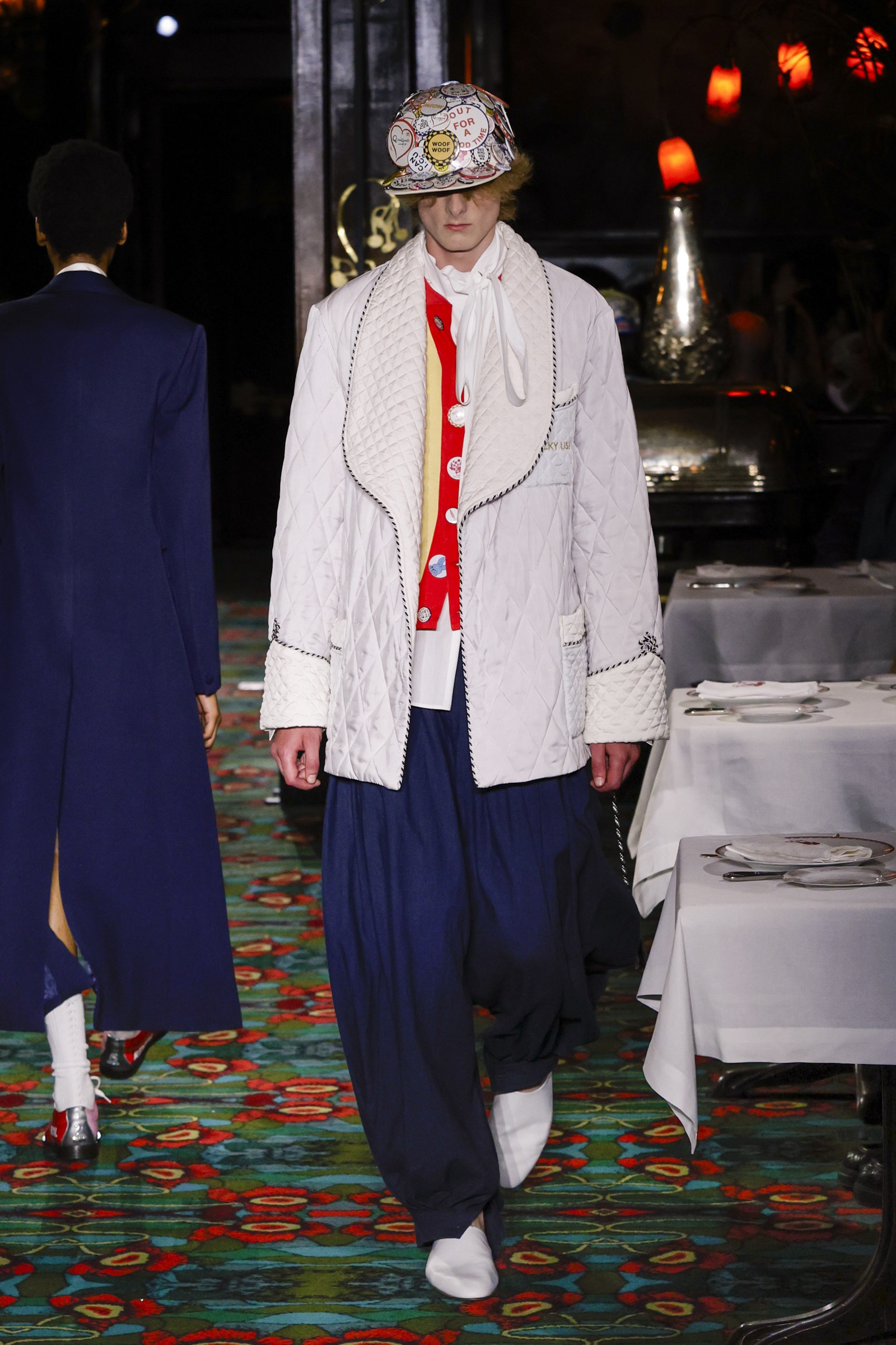 アーカイヴのシルエットとモチーフを再解釈しながら、テーラードはパンクな色彩をまとい、カレッジとアイビースタイルをコラージュしたスタイルも。一部のアイテムはモテ?ル自身か?マーカーを使ってカスタマイス?するなど、DIY要素を取り入れている。