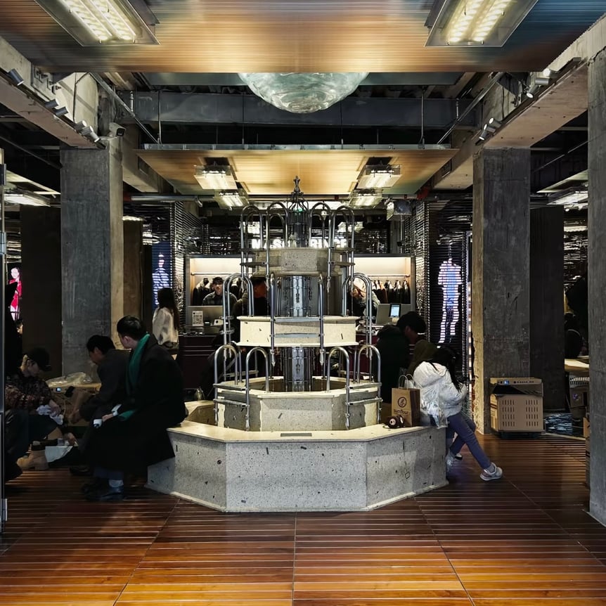 1階の奥には、コンクリート柱と金属梁が交錯する大きなホールがあり、中央には未来の遊具の骨格のような噴水が置かれている。さらに奥へ進むと、フロアの中央が円形にくり抜かれ、その内部に透明なガラスの造形が据えられている。水面のように層を重ねた渦は、光を受けて静かに揺らぎ、近づくほど境界が溶けていく。