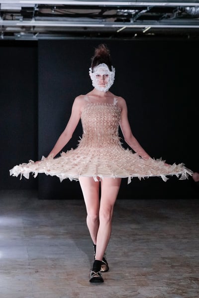 コレクションのラストを飾ったのは、ファーストルックとは打って変わって骨組みのみとなったチュチュ。二宮は「自分の体を律した上で限界まで美の表現を求めていくバレエは、深く強いものを求めていくモノ作りと通ずるものがあると感じる」という。儚く繊細な美しさの裏にあるストイックな精神性は、バレリーナとデザイナーの共通点とも言える。極限まで突き詰める二宮の変わらぬ姿勢と"黒ではないノワール"の表現が、服作りの新たな扉を開けた。