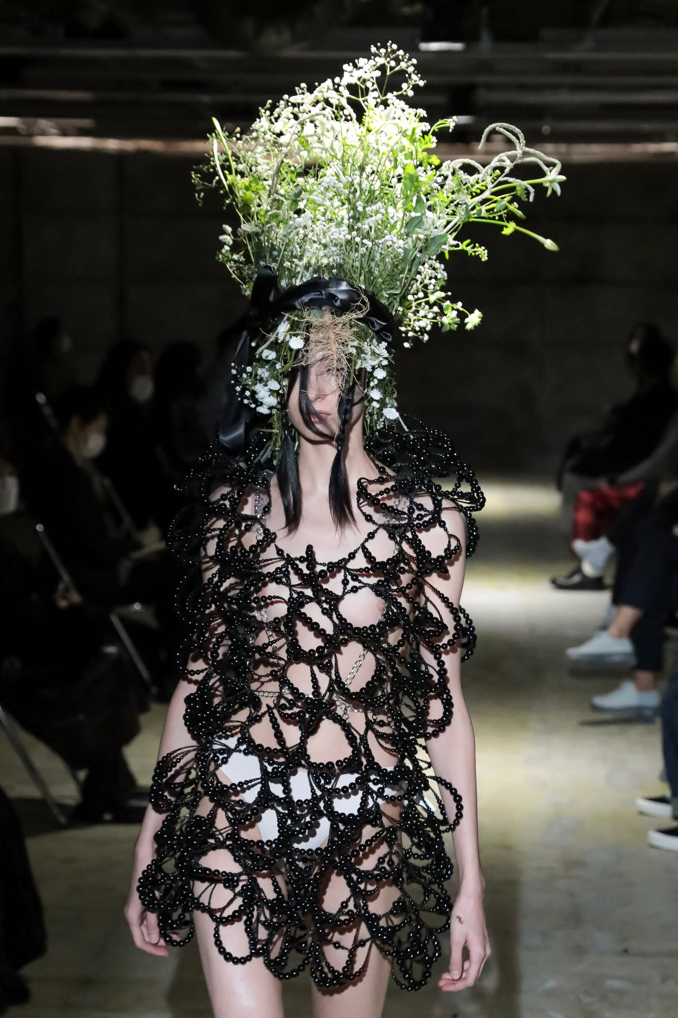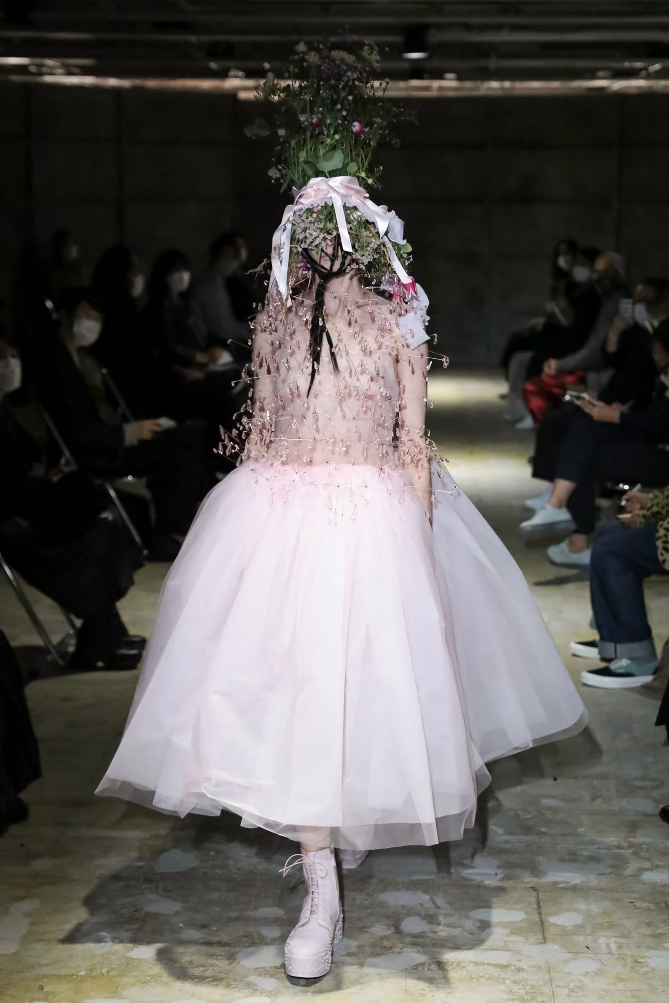 序盤はノワール?ケイ?ニノミヤの代名詞でもある黒一色で、中盤からは淡いピンクが混ざる。徐々にピンクが黒を侵食し、リボンで覆い尽くされたルックも。終盤は白からアイスブルーまで色彩を展開し、ラスト2ルックはボディパーツから伸びる細いワイヤーに無数のアクリルパーツを装飾。シャラシャラと音を立てながら、淡い光を反射した。