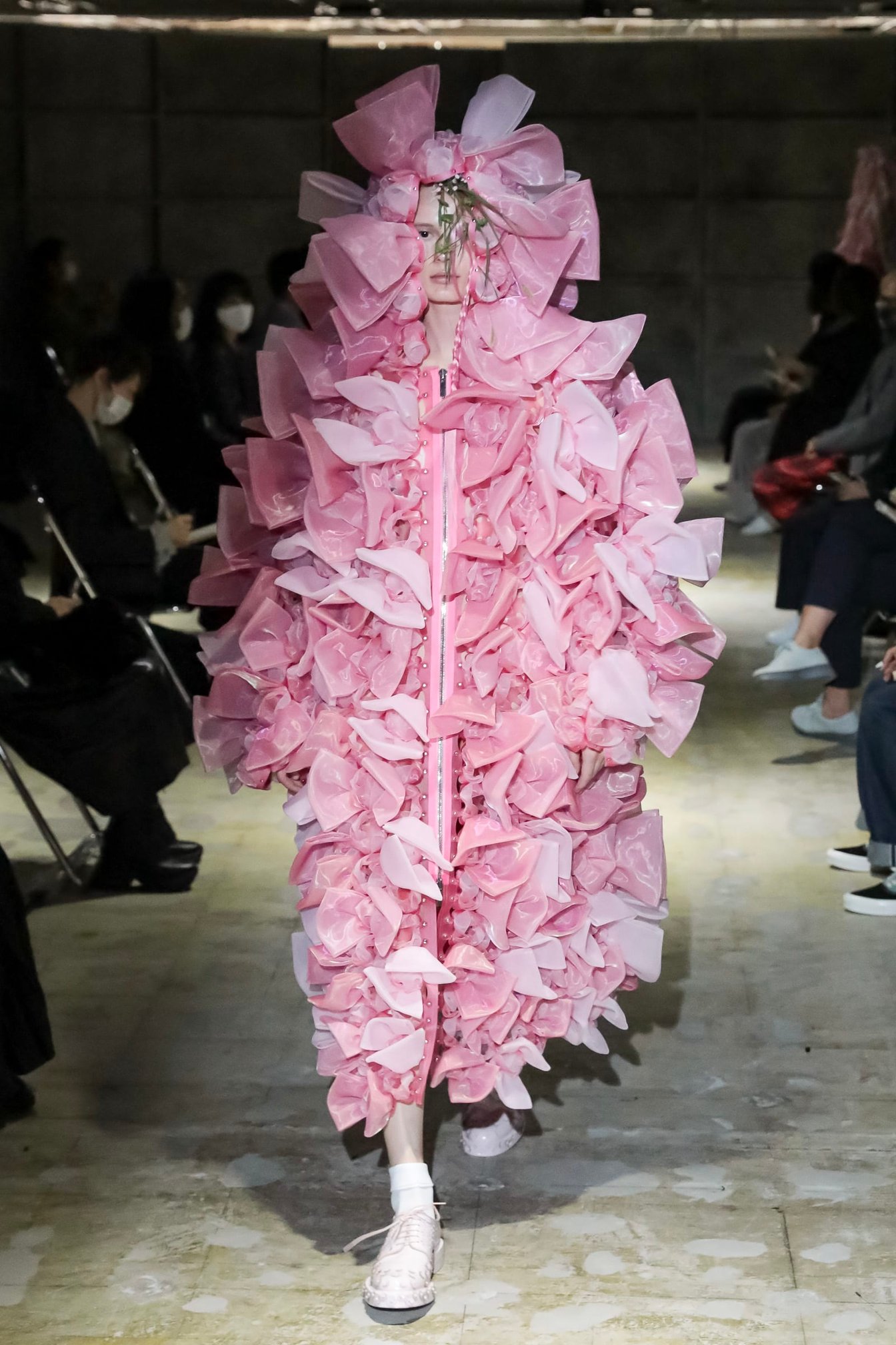 ショーの後、コロナ禍での進行となったコレクション制作について「明るい気持ちを服に込める、あるいは我々のやってきた物づくりを続けていくことを考えた」と振り返った二宮。初めて東京で開くショーでもパリコレと同様に、できるだけフィジカルで人の目の前で見せることを念頭に置いた。「エネルギーを感じるもの、気持ちが前向きになるものを」という普段よりも感情に寄り添ったアプローチで、身近なものを見つめ直しながら「自分たちの手で変えていく」という思いを込めたという。