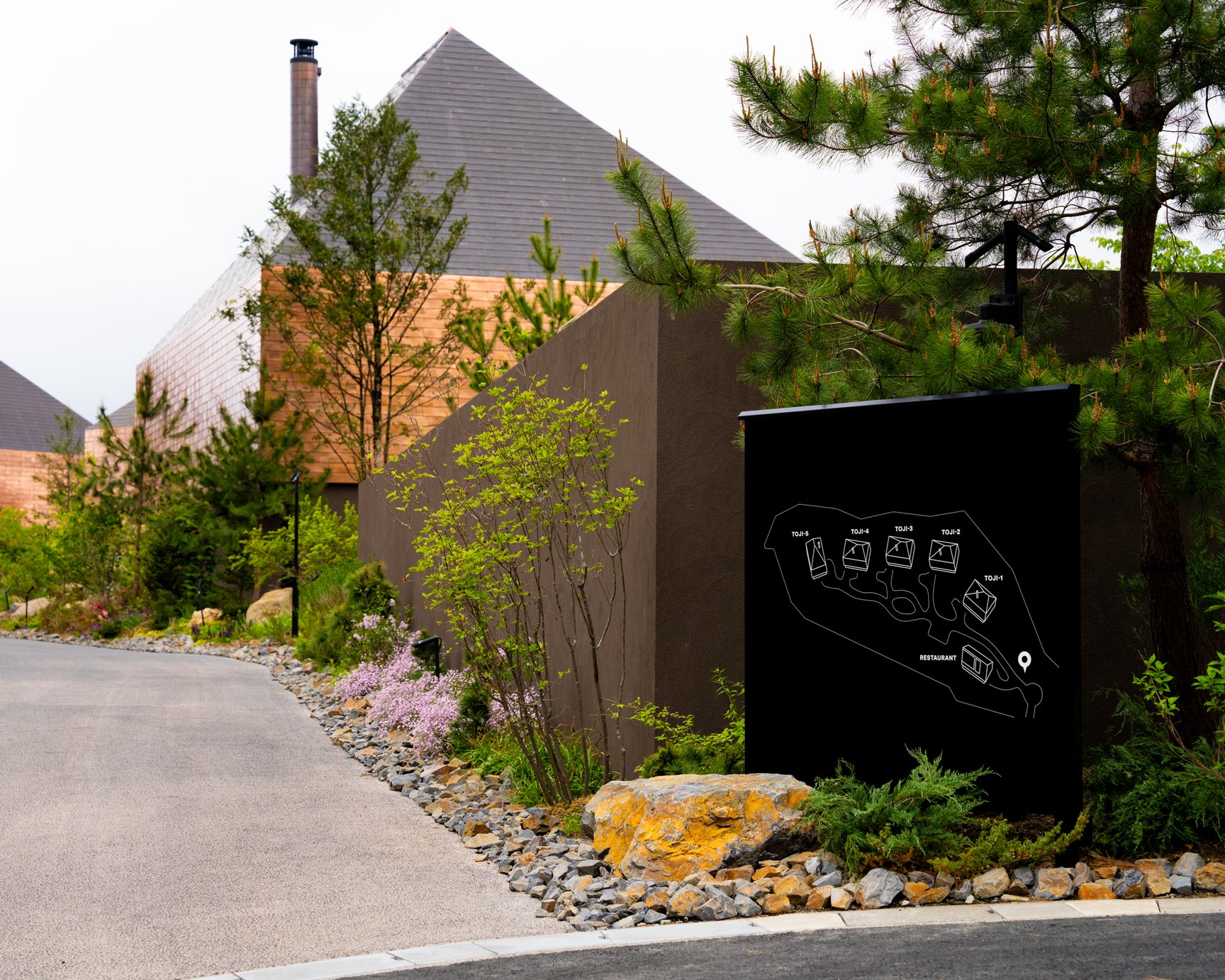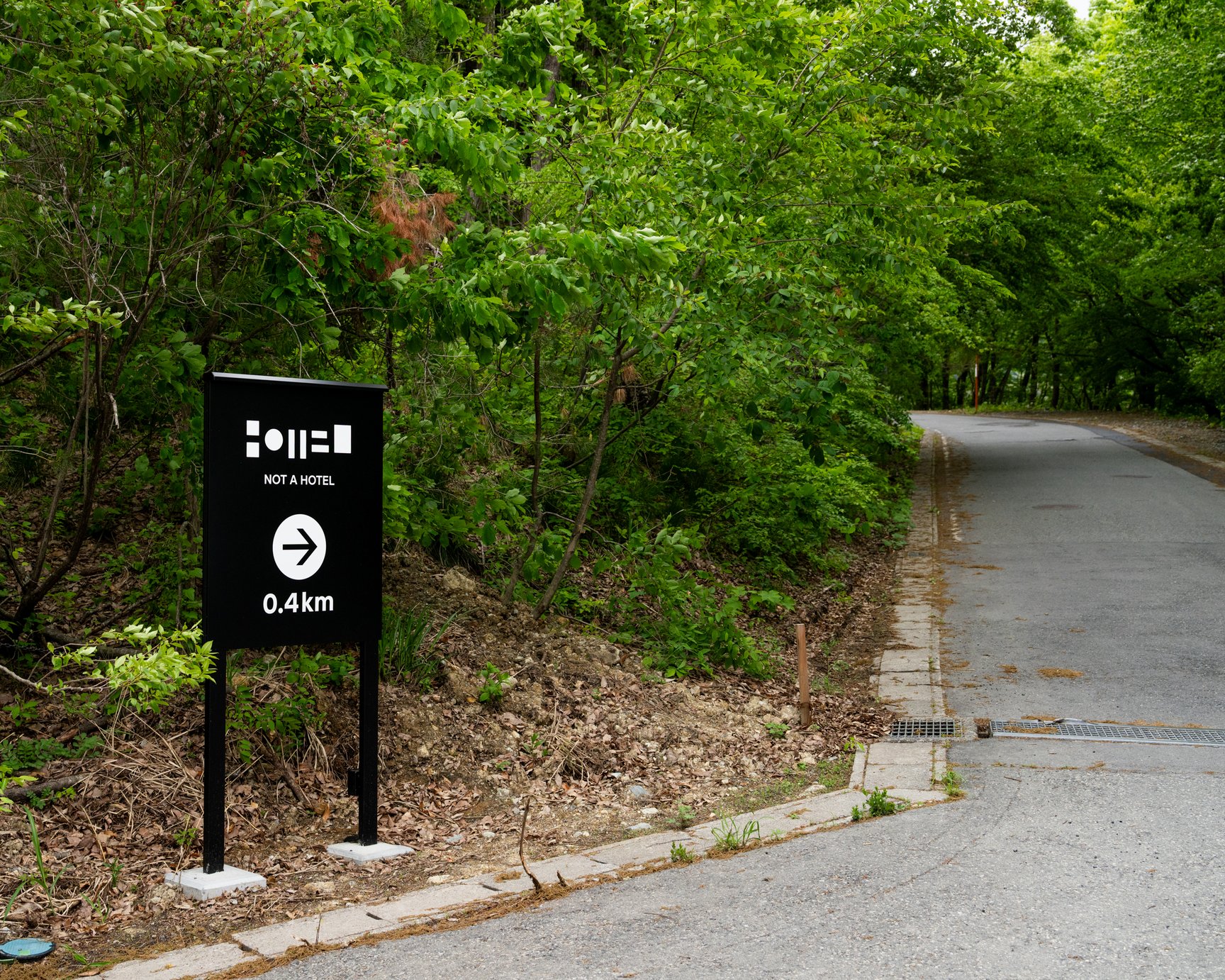 この日は午前中に仕事を終え、15時前に上毛高原に到着したため、駅からタクシーを利用することに。乗車してから数分、見えてくるのは山の斜面に沿った段々畑だ。東京から新幹線で約1時間とは思えない大自然に思わず深く息を吸い込む。曲がりくねった山道を10分ほど進むと、「NOT A HOTEL」の標識が見えてくる。山頂まであとわずかだ。さらにクネクネとカーブを車でかけあがること数分、NOT A HOTELの敷地に到着した。