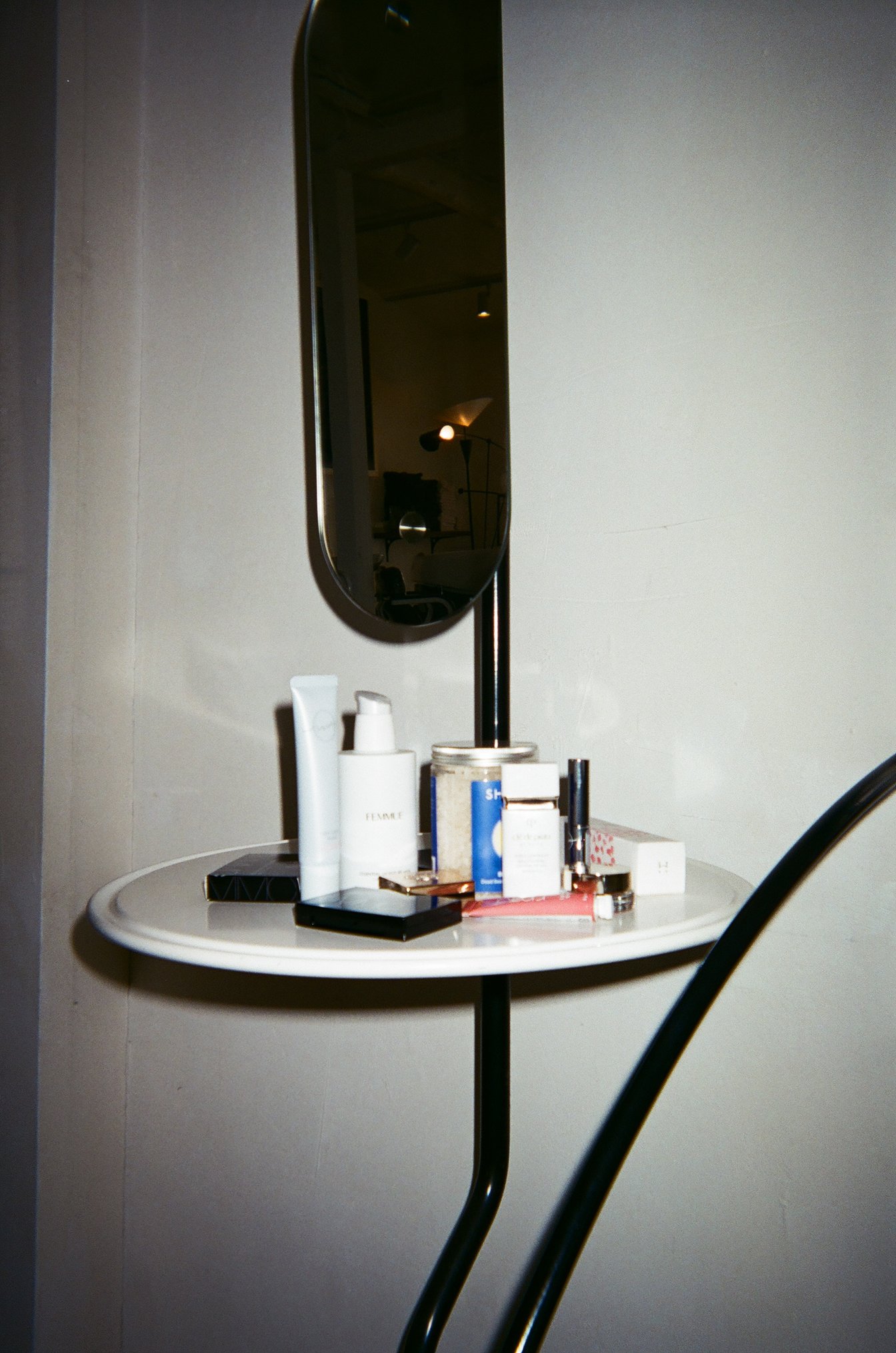 店内に入るとすぐ目に入るたばこ屋のガラスケースはヴィンテージもの。「スリー(THREE)」などのメイク品やスタイリング剤などがディスプレイされている