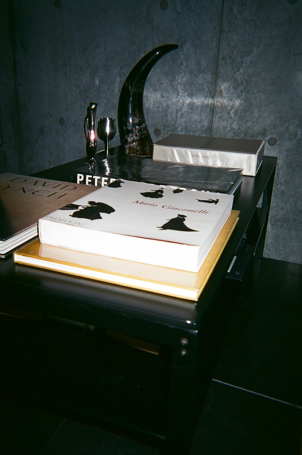 オークションで入手したガラスのデスクの上に、その時の気分にフィットする本を置いて、すぐ読めるようにしています。手前に写っている本は、マリオ?ジャコメッリ(Mario Giacomelli)の作品集。彼の作品のハイコントラストさが好きです。