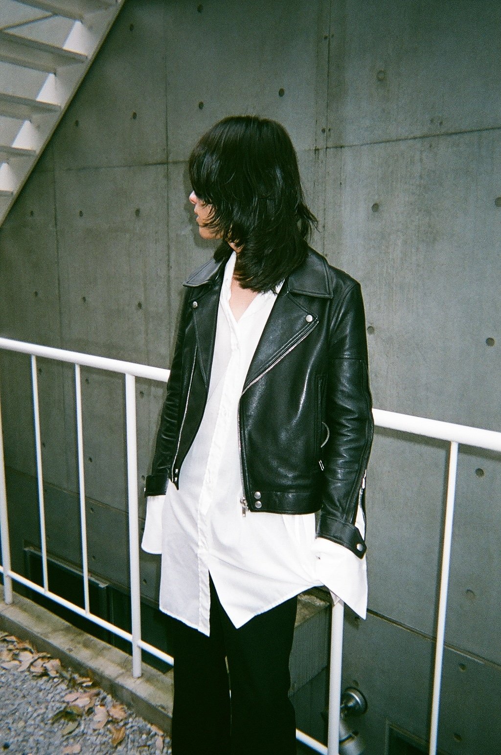 1番というと難しいですが、リック?オウエンスと「セリーヌ(CELINE)」が特に好きです。このライダースもリック。白シャツはセリーヌです。パンツはシルエットが好きで、昔のセリーヌのものをよく選んでいます。